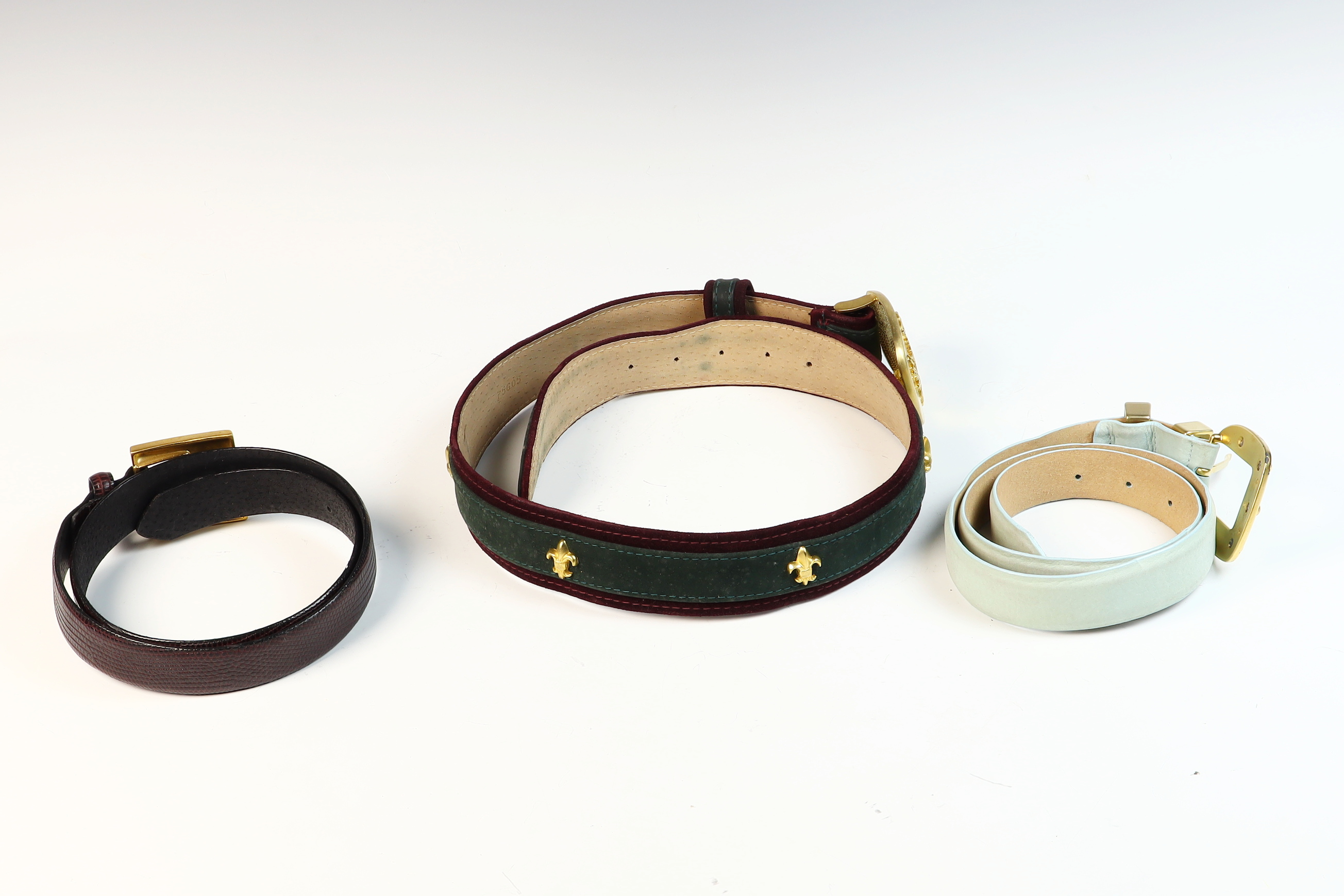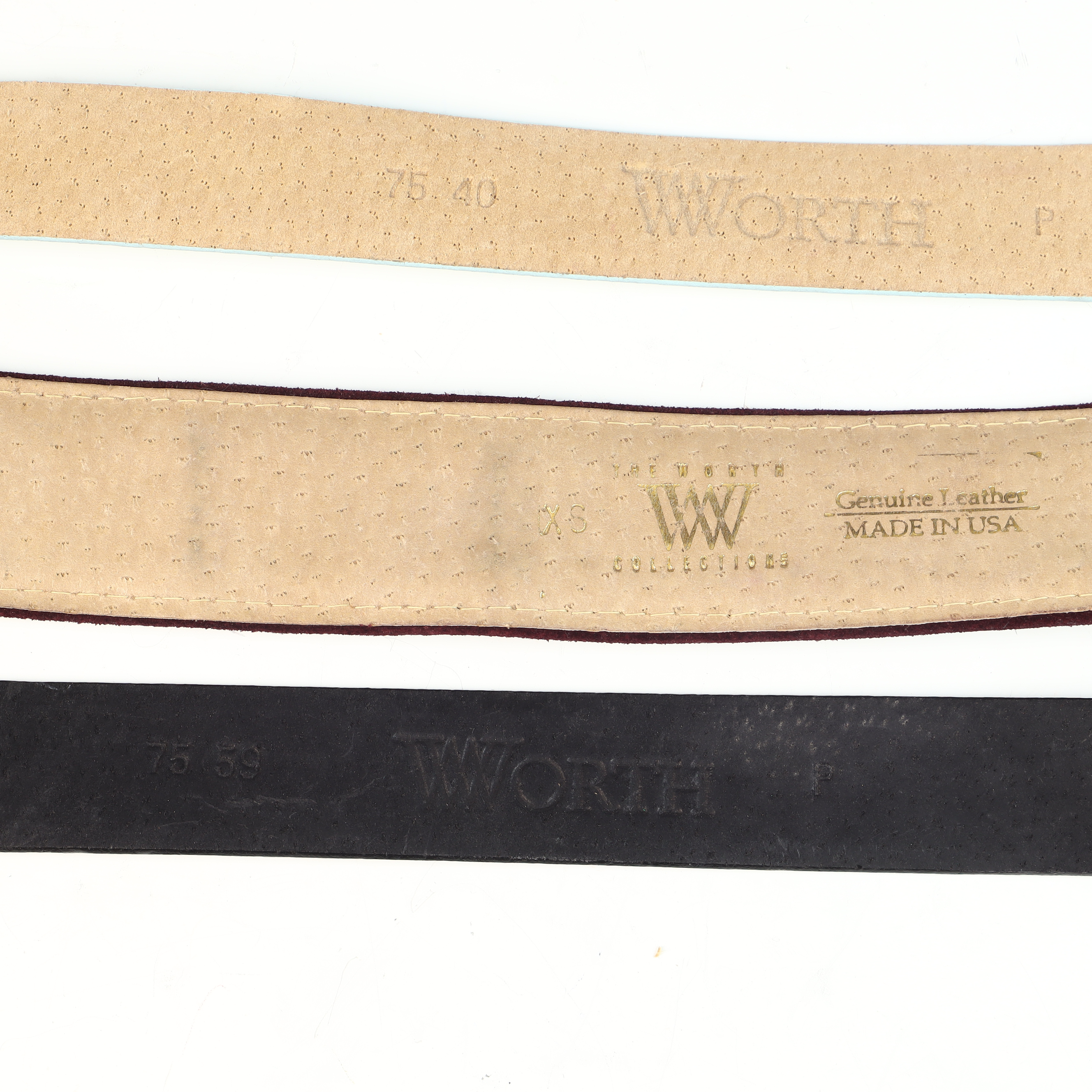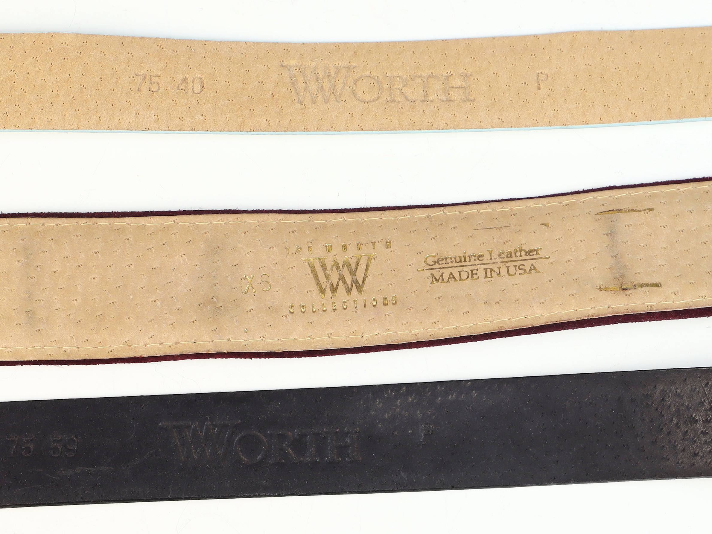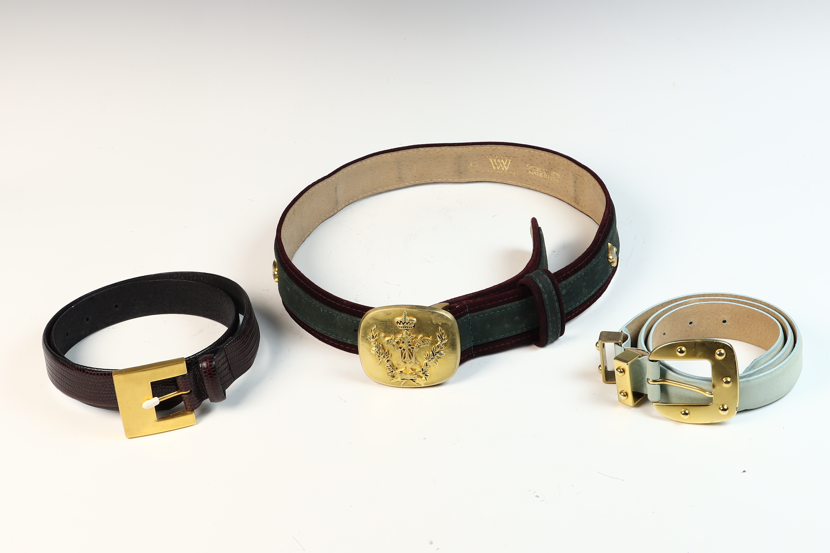 This lot features three vintage ladies belts from The Worth Collection dating to approximately the 1980s. Each belt is constructed of leather or suede and was manufactured in the USA.The first item is a wide waist belt composed of a green suede main body with dark burgundy velvet-textured borders and a tan leather lining. The strap is embellished with three gold-tone fleur-de-lis studs. It features a large, ornate gold-tone buckle with a central crest in relief, including a crown and foliage motifs. The interior is stamped with a stylized W logo and the text The Worth Collections, Genuine Leather, Made in USA, and size XS.The second item is a standard width belt crafted from dark burgundy leather with an embossed lizard skin texture. It is fitted with a rectangular gold-tone buckle featuring a textured leather inlay matching the strap. The interior is stamped 75 59, Worth, and P.The third item is a standard width belt made of light blue or pale mint green smooth leather. The hardware consists of a stylized gold-tone buckle with six raised rivet-style studs and a matching leather belt loop with two gold-tone studs. The interior is stamped 75 40, Worth, and P.Size: Approximately 70cm waist size.