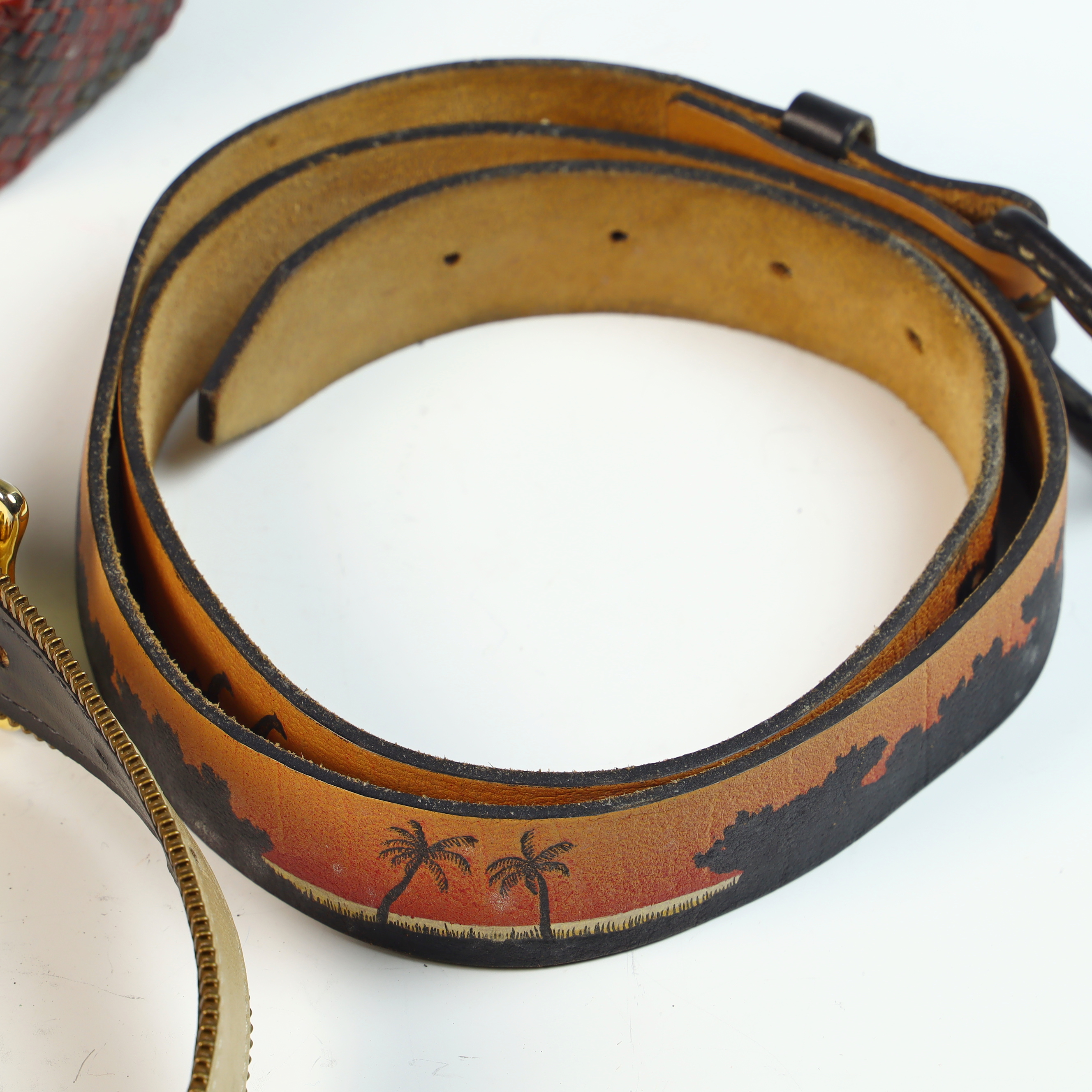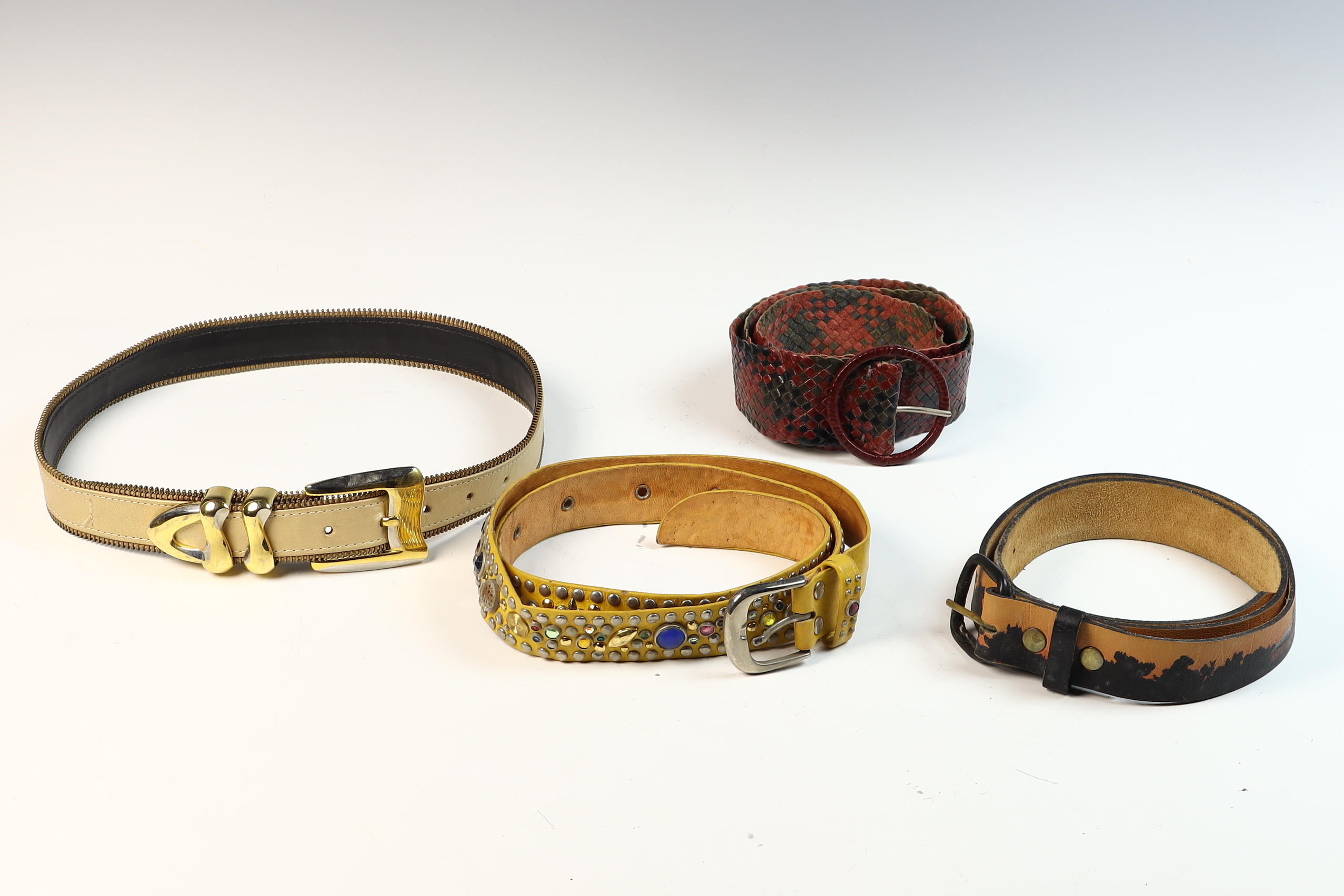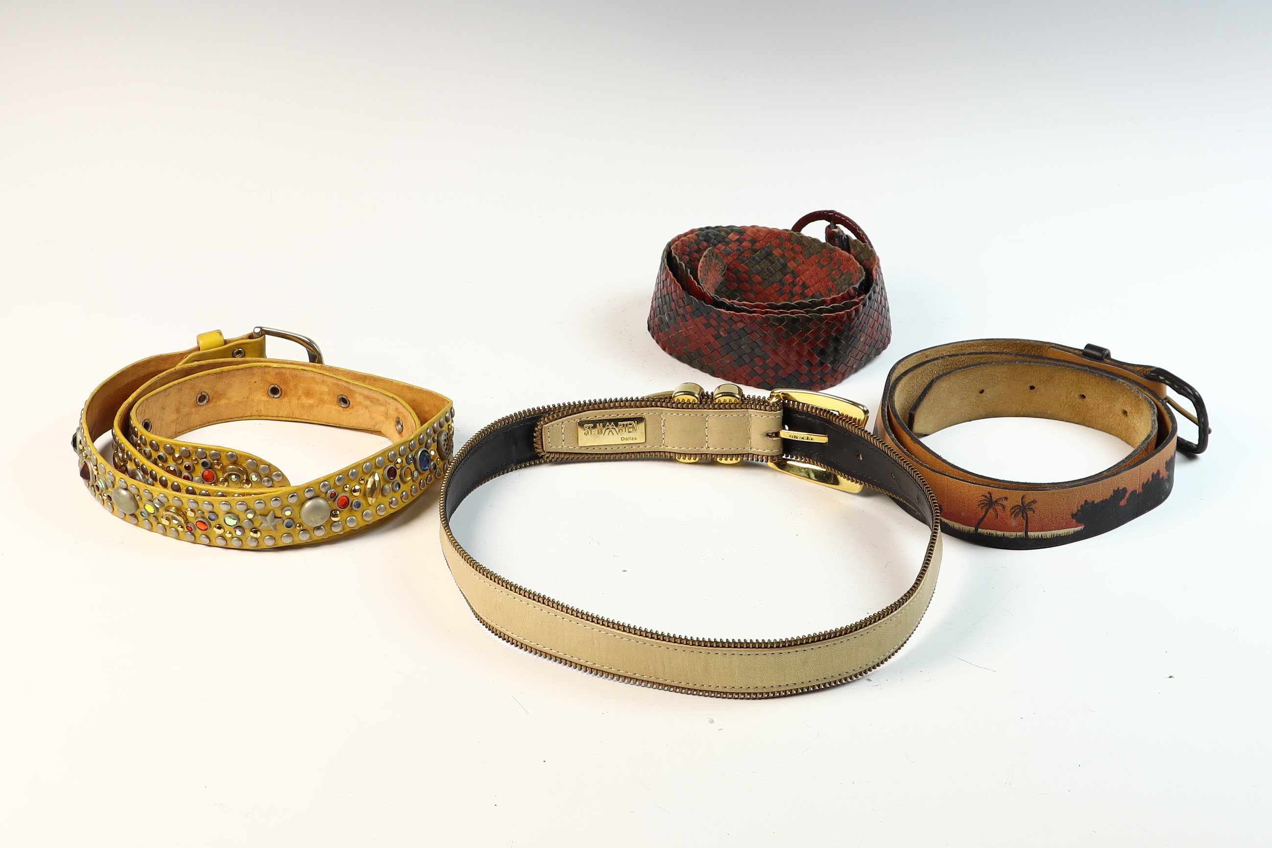 A collection of four ladies fashion belts dating to approximately the 1980s, primarily sized for a smaller waist. One belt is a St. Maarten of Dallas design, crafted from beige leather with distinctive brass-tone zipper-tooth trim along both edges. It features a gold-tone buckle and double-cylinder keepers, with the interior marked by a gold-tone metal plaque reading ST. MAARTEN Dallas. The second item is a bright yellow leather belt heavily embellished with multi-colored cabochons in shades of red, blue, green, and amber, interspersed with various metallic studs and star-shaped accents in gold and silver tones, finished with a simple silver-tone buckle. Also included is a woven belt featuring a checkered diamond-weave pattern in red and dark brown leather with a large, circular resin-covered buckle. The final piece is a tan leather belt featuring a hand-painted tropical scenic motif with palm tree silhouettes against an orange sunset gradient and a black-finished metal buckle.General size 70 cm.