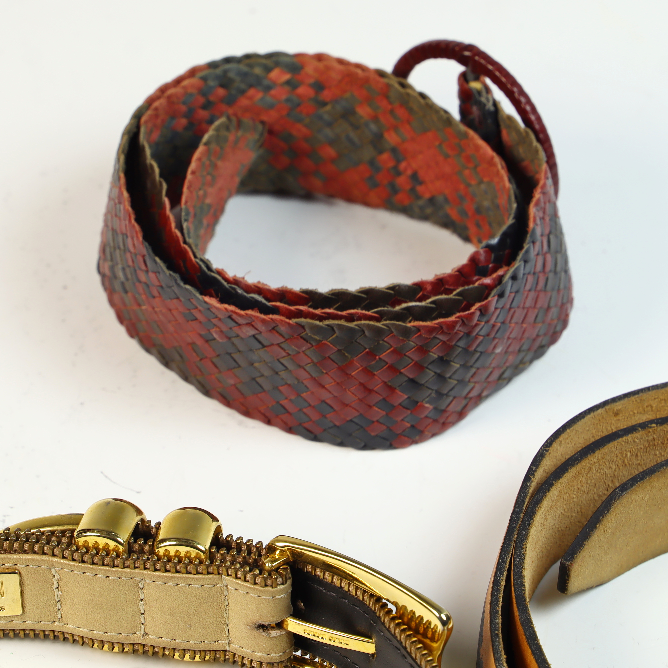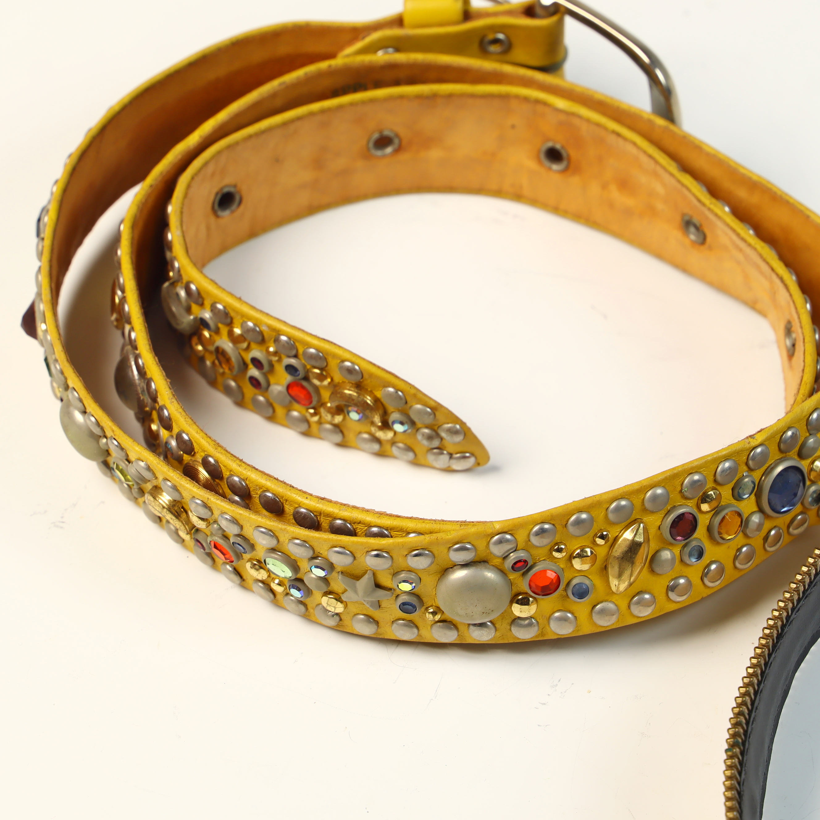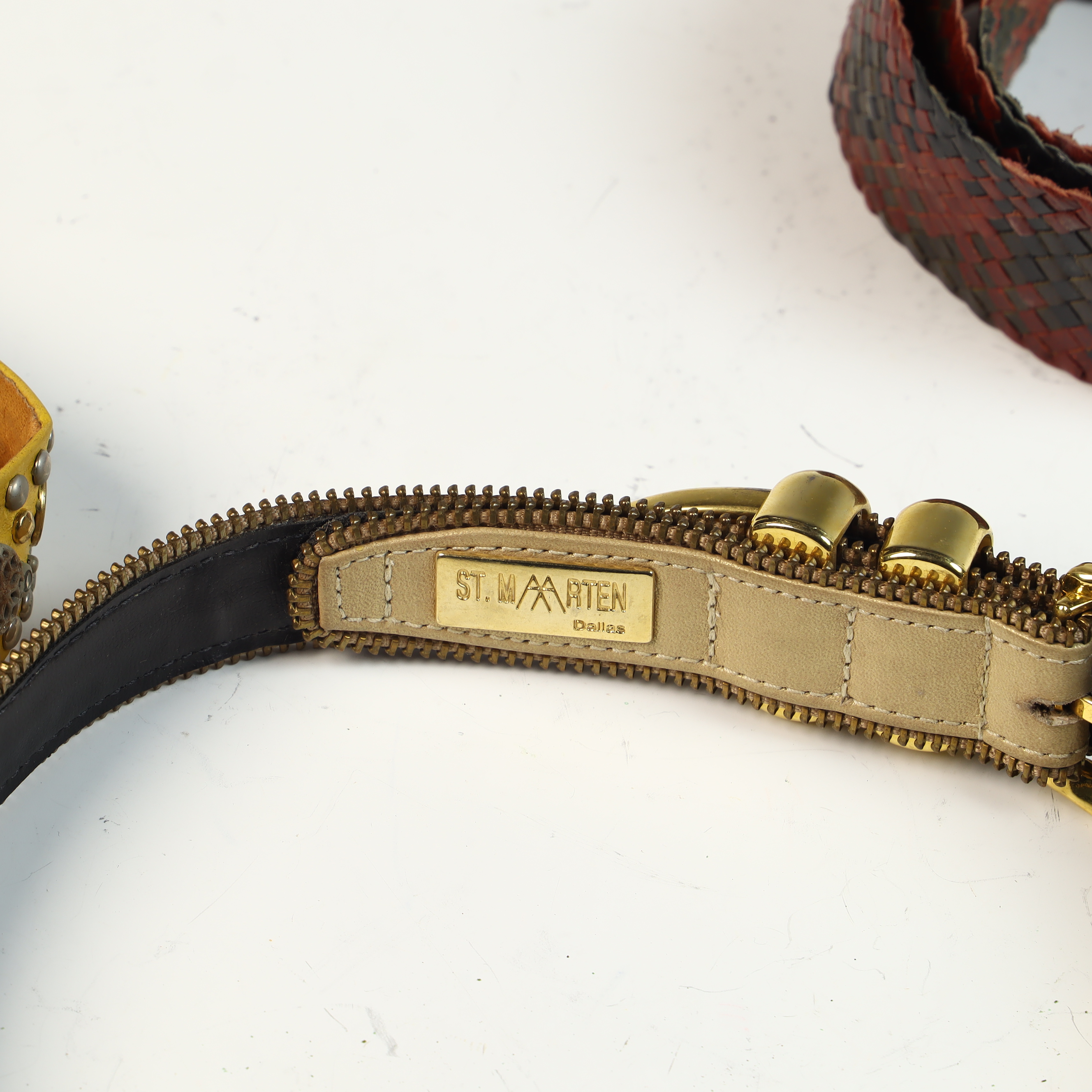 A collection of four ladies fashion belts dating to approximately the 1980s, primarily sized for a smaller waist. One belt is a St. Maarten of Dallas design, crafted from beige leather with distinctive brass-tone zipper-tooth trim along both edges. It features a gold-tone buckle and double-cylinder keepers, with the interior marked by a gold-tone metal plaque reading ST. MAARTEN Dallas. The second item is a bright yellow leather belt heavily embellished with multi-colored cabochons in shades of red, blue, green, and amber, interspersed with various metallic studs and star-shaped accents in gold and silver tones, finished with a simple silver-tone buckle. Also included is a woven belt featuring a checkered diamond-weave pattern in red and dark brown leather with a large, circular resin-covered buckle. The final piece is a tan leather belt featuring a hand-painted tropical scenic motif with palm tree silhouettes against an orange sunset gradient and a black-finished metal buckle.General size 70 cm.