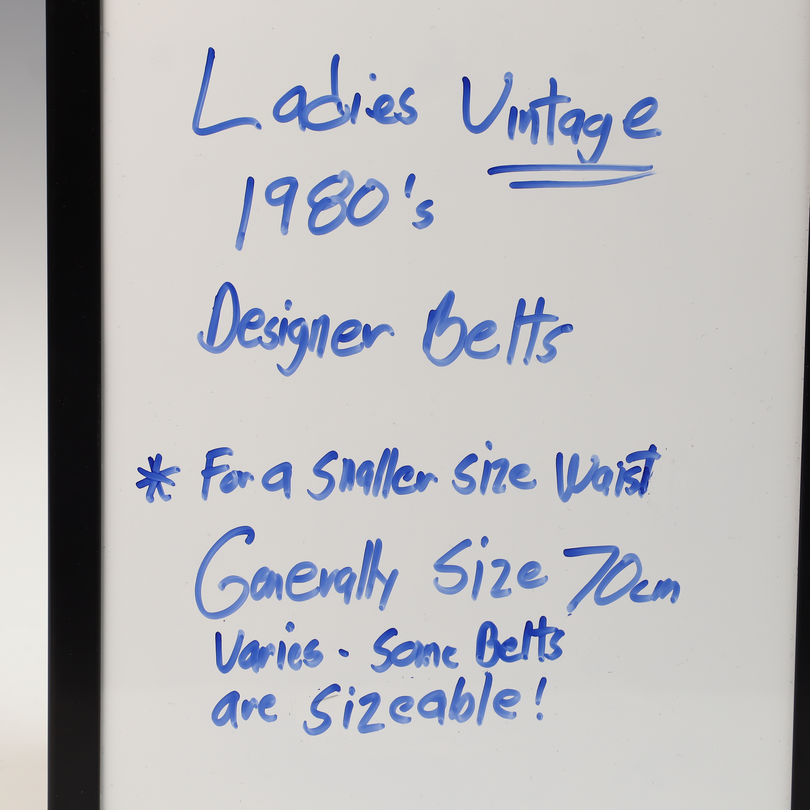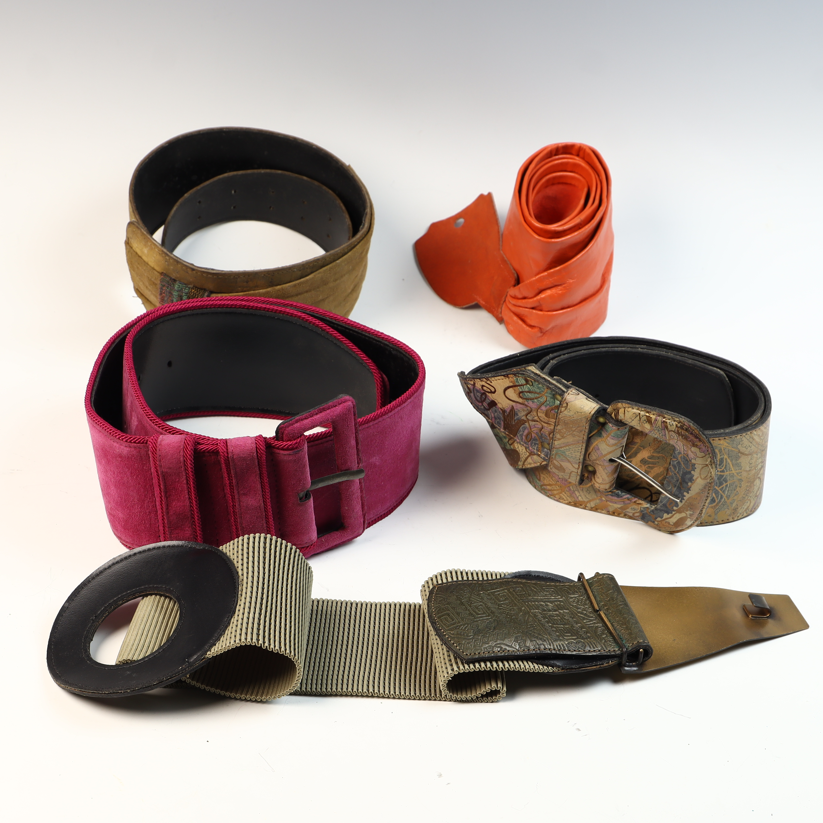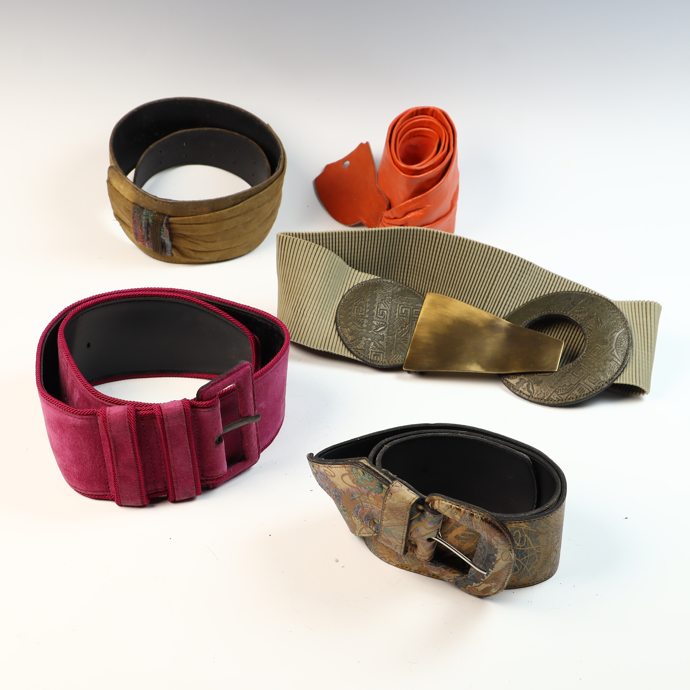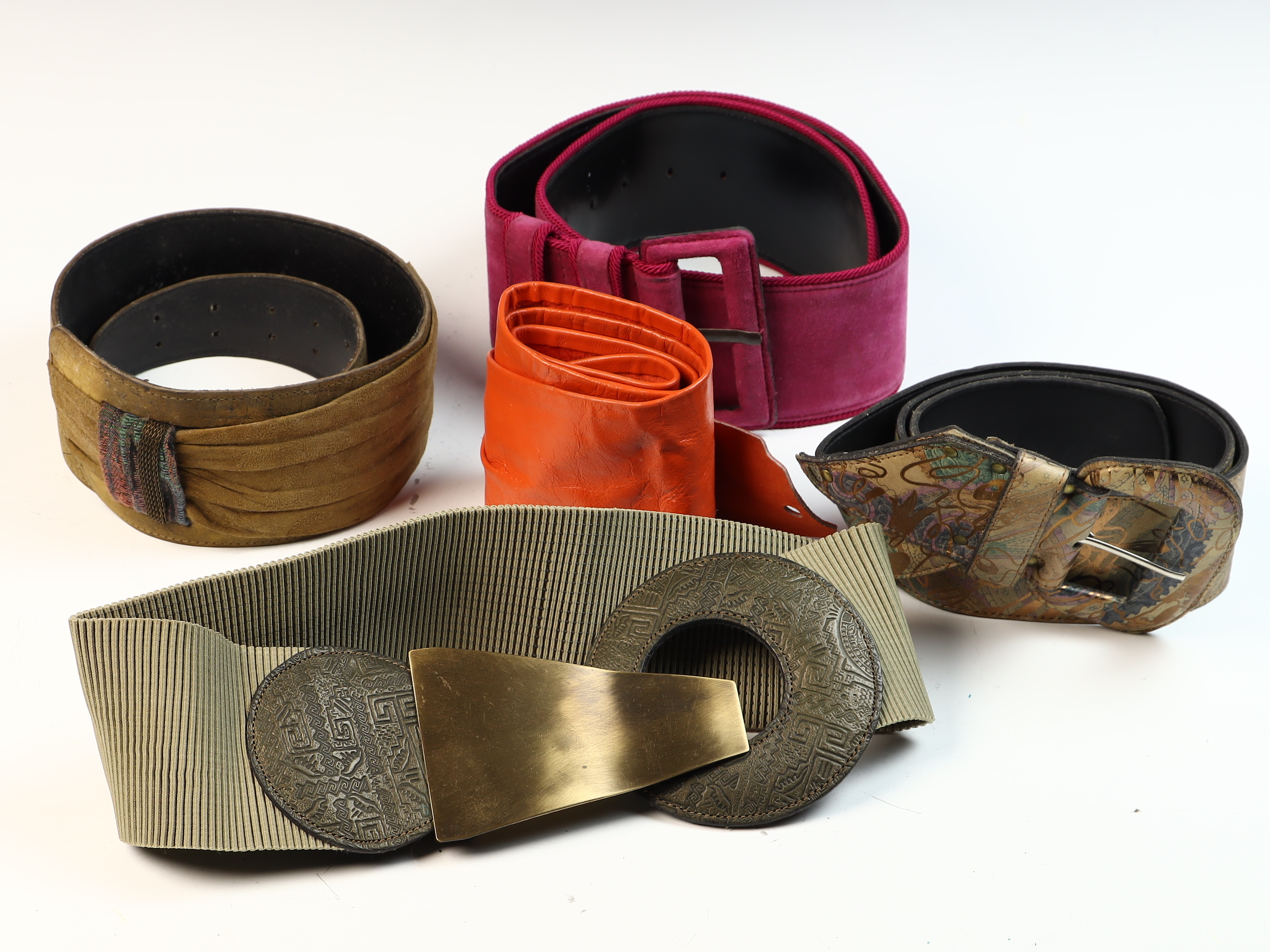 This lot comprises five vintage ladies fashion belts dating from the 1980s, showcasing a variety of materials and decorative hardware. The collection includes a wide fuchsia suede belt with vertical corded detailing and a matching suede-covered rectangular buckle. Also present is a wide tan-colored ribbed elasticized belt featuring prominent brass-tone hardware, including two circular plates with ornate relief patterns and a central trapezoidal buckle. A wide, gathered brown suede belt is detailed with a small multi-colored textile patch near the closure. The group further contains a leather belt with a muted multi-colored floral and paisley pattern, finished with a large, ornate rounded metal buckle. The final piece is a supple leather belt in a vibrant orange hue. Per the accompanying documentation, these belts are intended for a smaller waist. No maker’s marks were observed during inspection.Waist size: Approximately 70 cm.