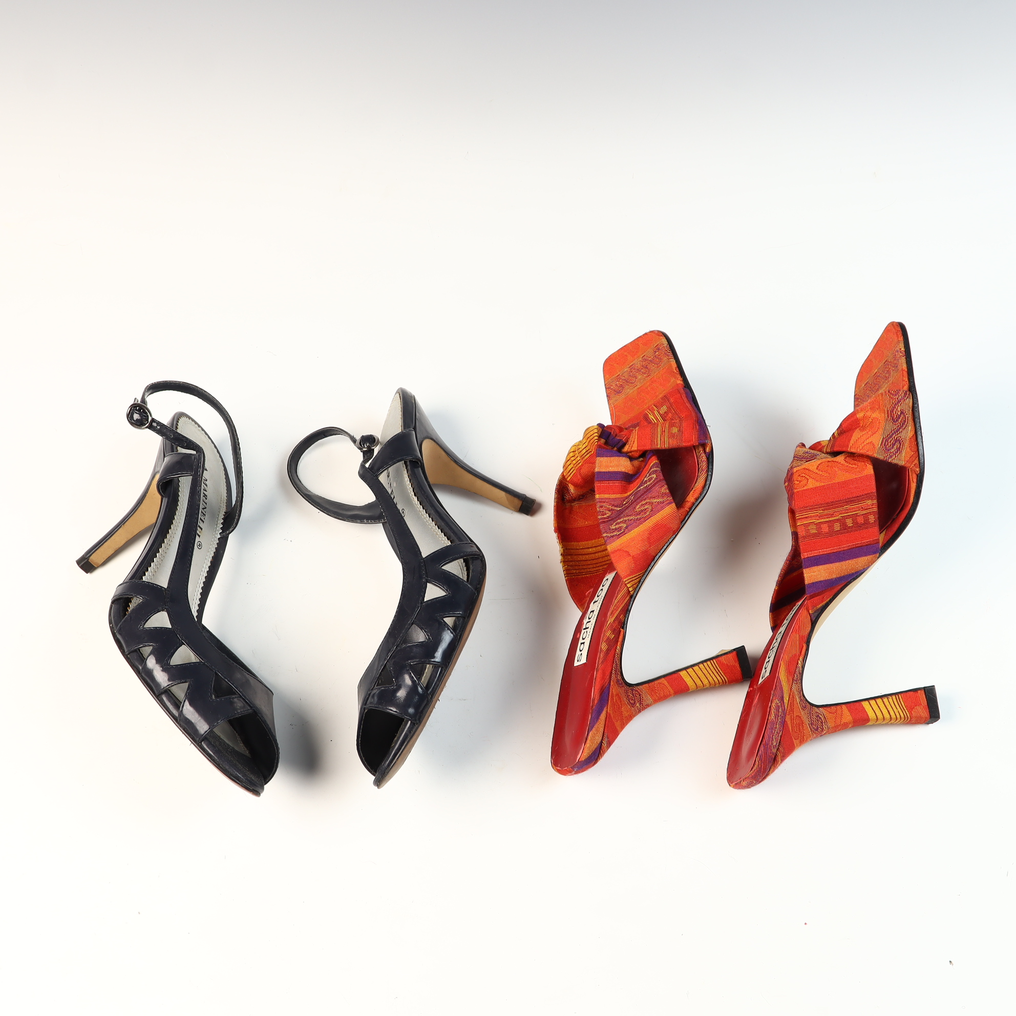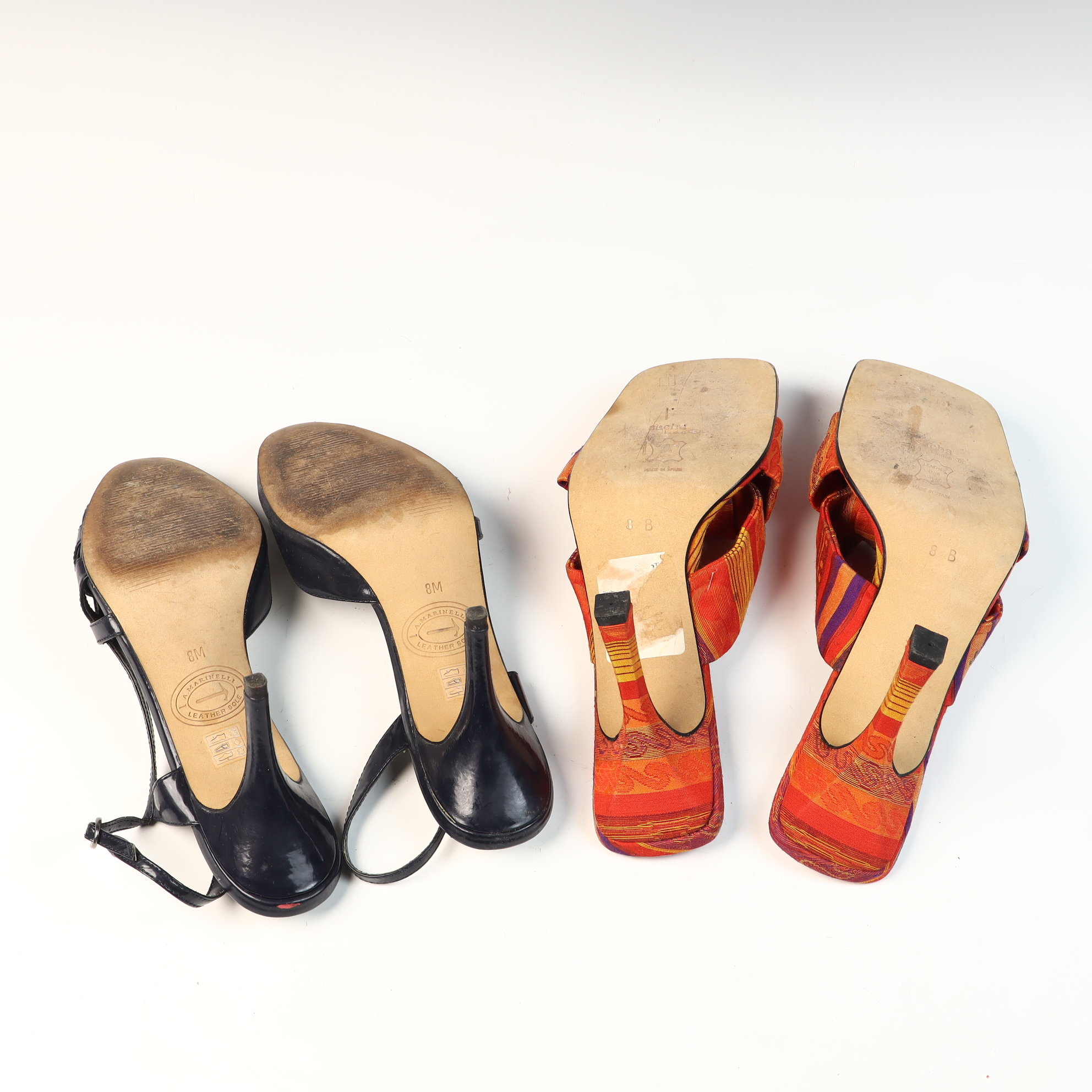 This lot consists of two pairs of women’s high-heeled shoes. The first pair is a set of A. Marinelli peep-toe slingback sandals featuring navy blue patent leather uppers with geometric cutouts on the vamp and adjustable ankle straps with silver-tone buckles. These shoes are constructed with silver-toned synthetic insoles and leather soles. The brand name A. Marinelli is inscribed on the insole and sole, and the soles are marked size 8M. The second pair is a set of Sacha Too square-toe mules made in Spain. These shoes feature multicolored patterned textile uppers in shades of orange, red, yellow, and purple with a knotted bow-style vamp and flared heels. The shoes have red insoles and leather soles. A white tag on the insole bears the characters sacha too and MADE IN SPAIN, and the soles are marked size 8B.Heel Height: 3.5 inches.
