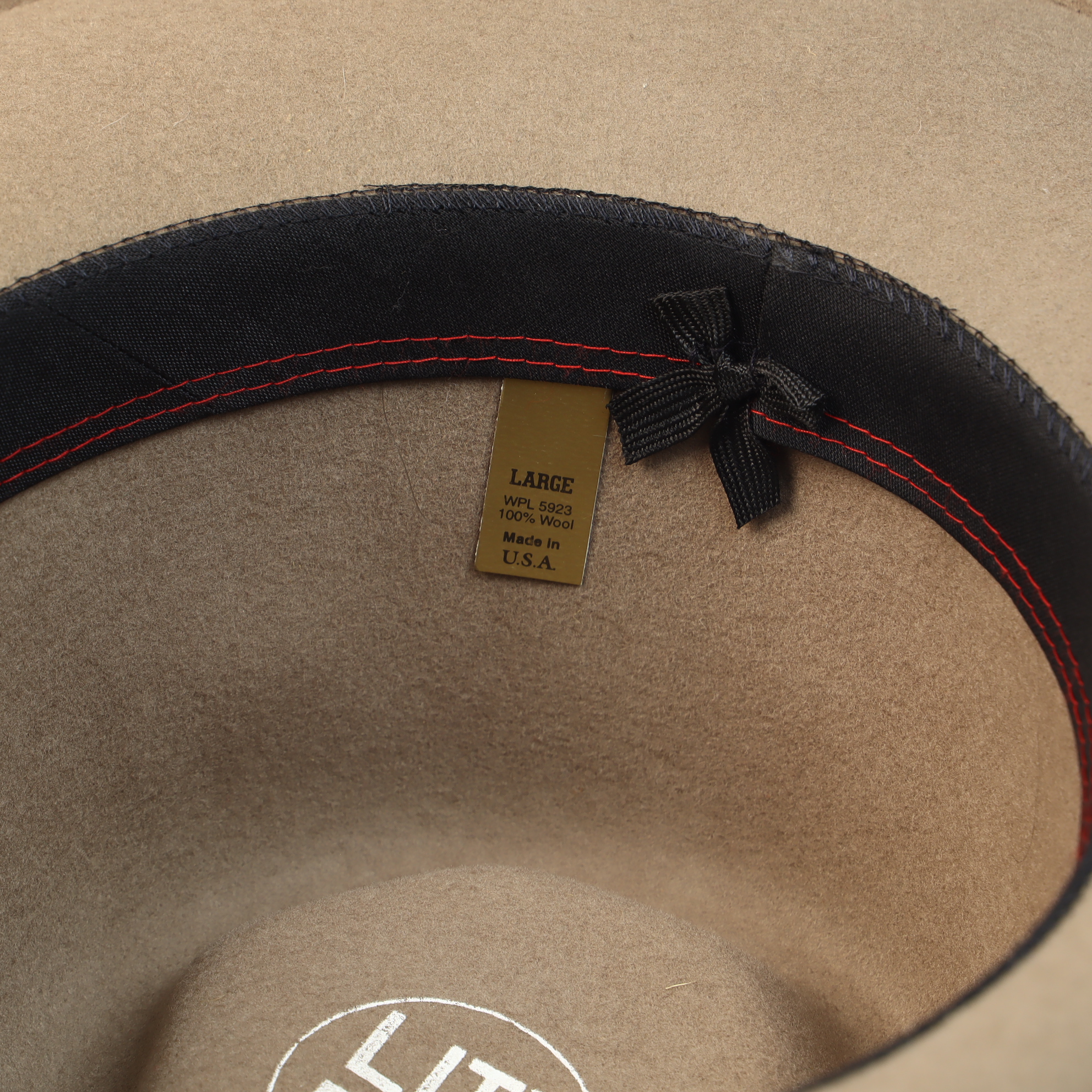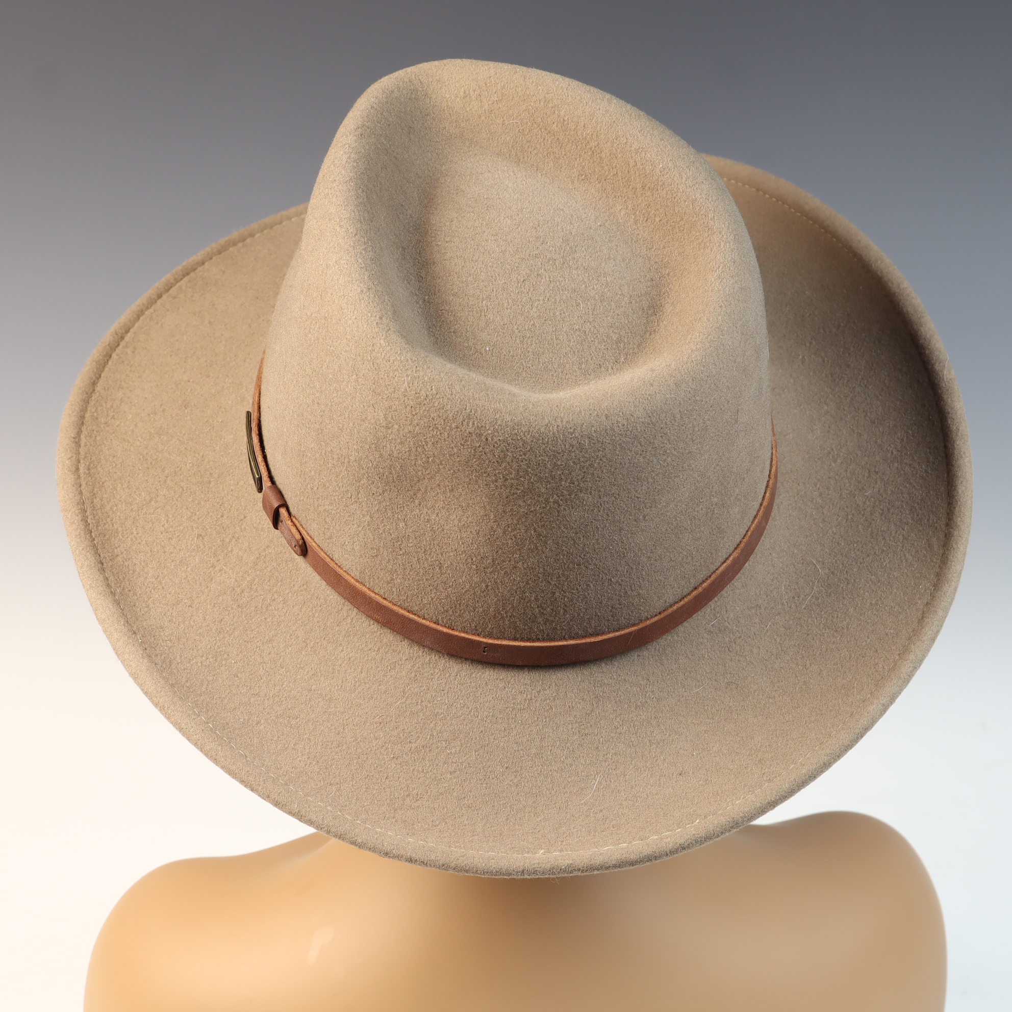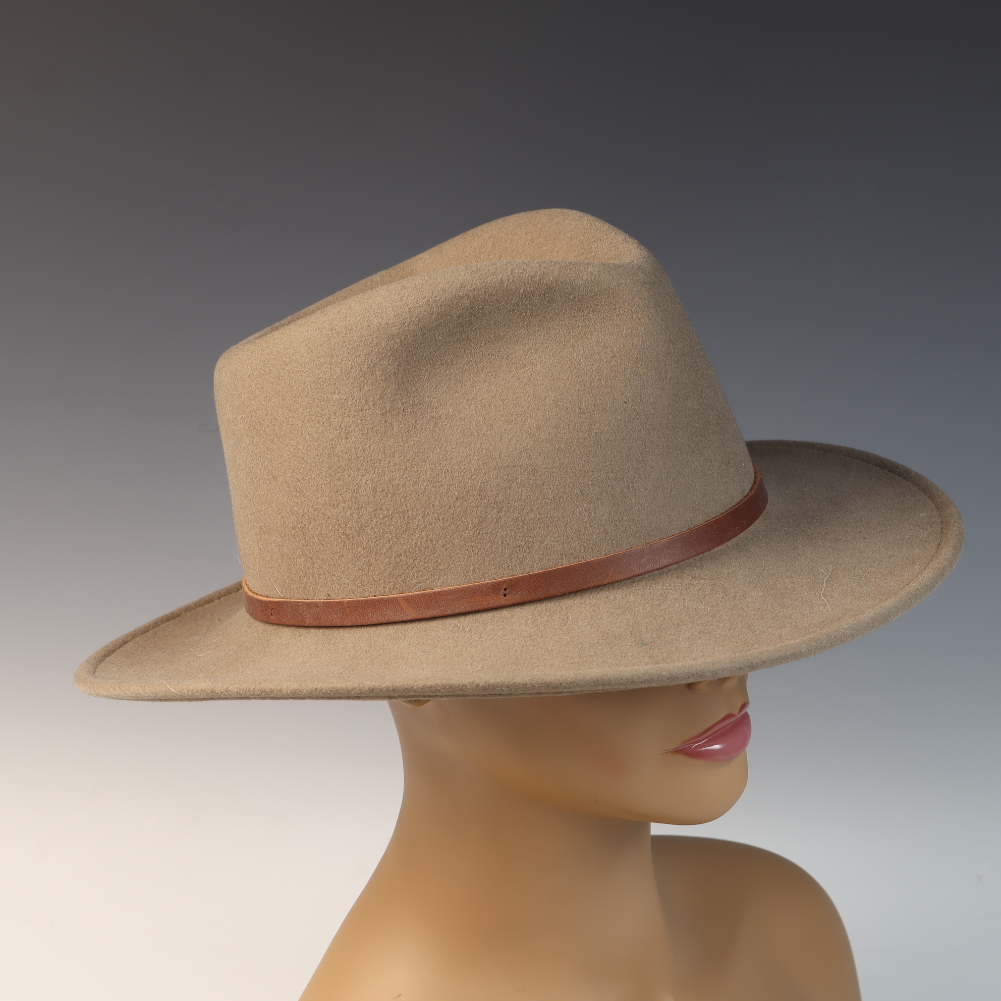 The hat is in excellent pre-owned condition. The wool felt is clean and maintains its structural shape. Minor surface lint is present. The leather band and interior sweatband show no significant signs of wear or use.