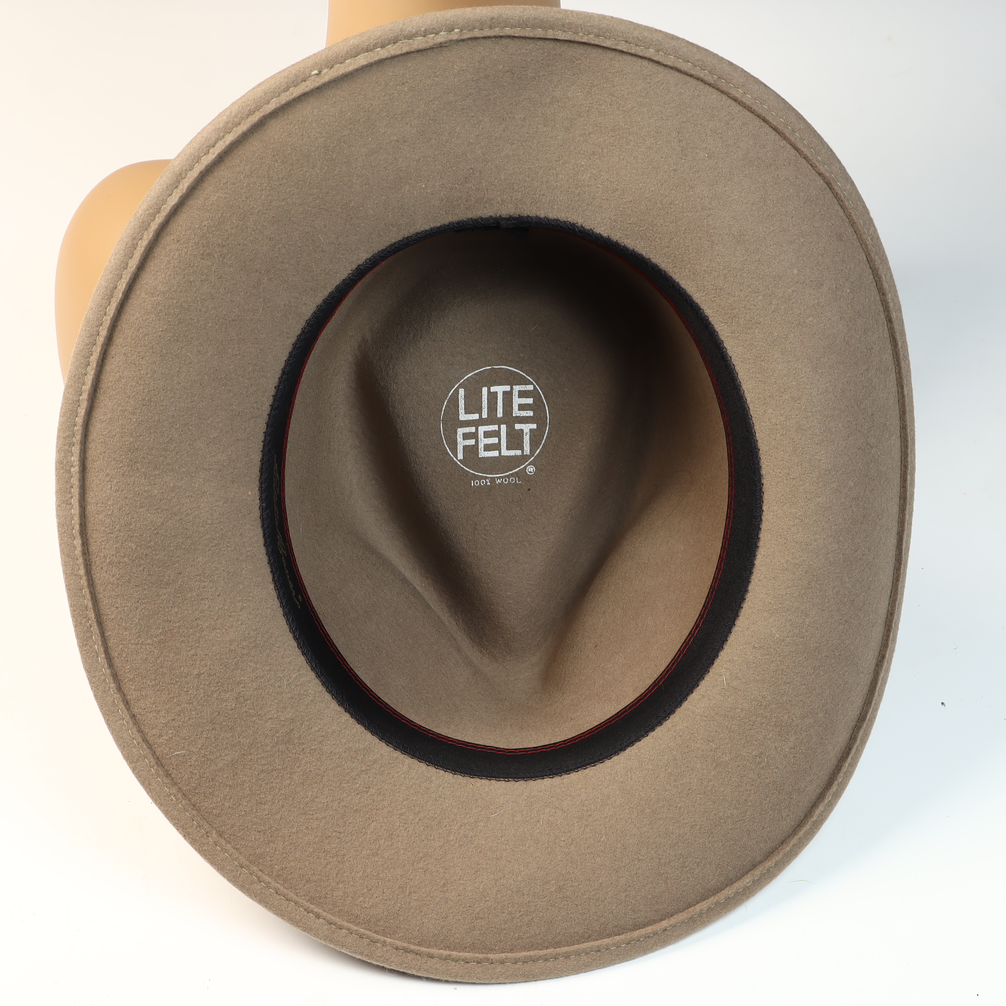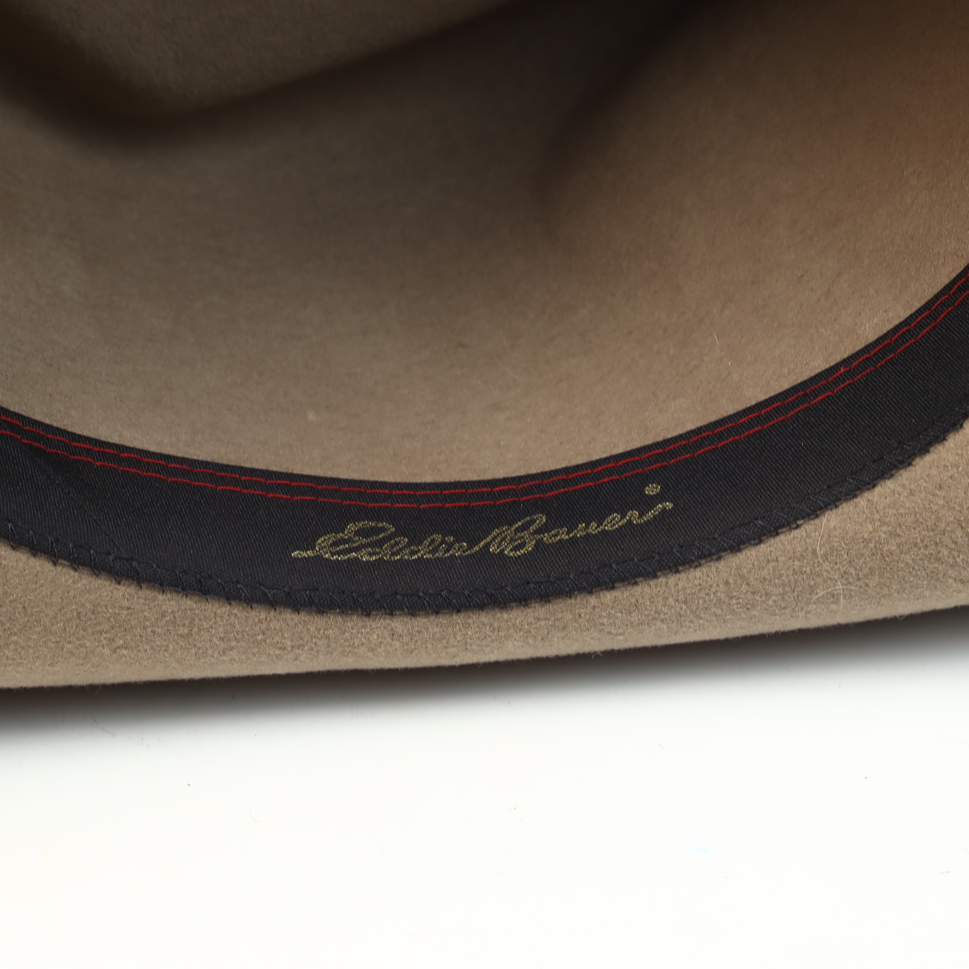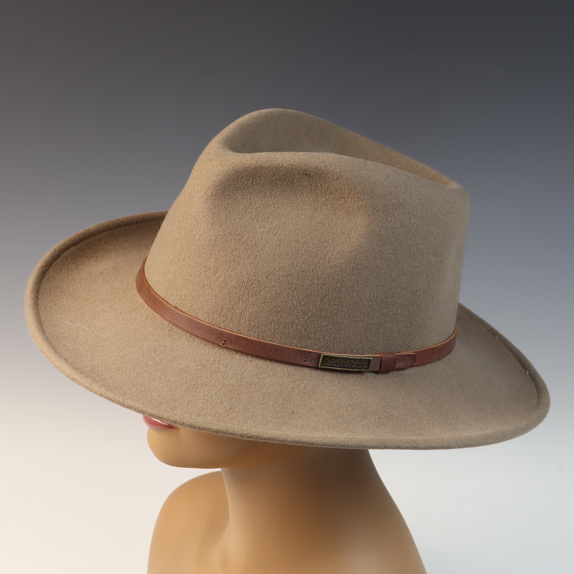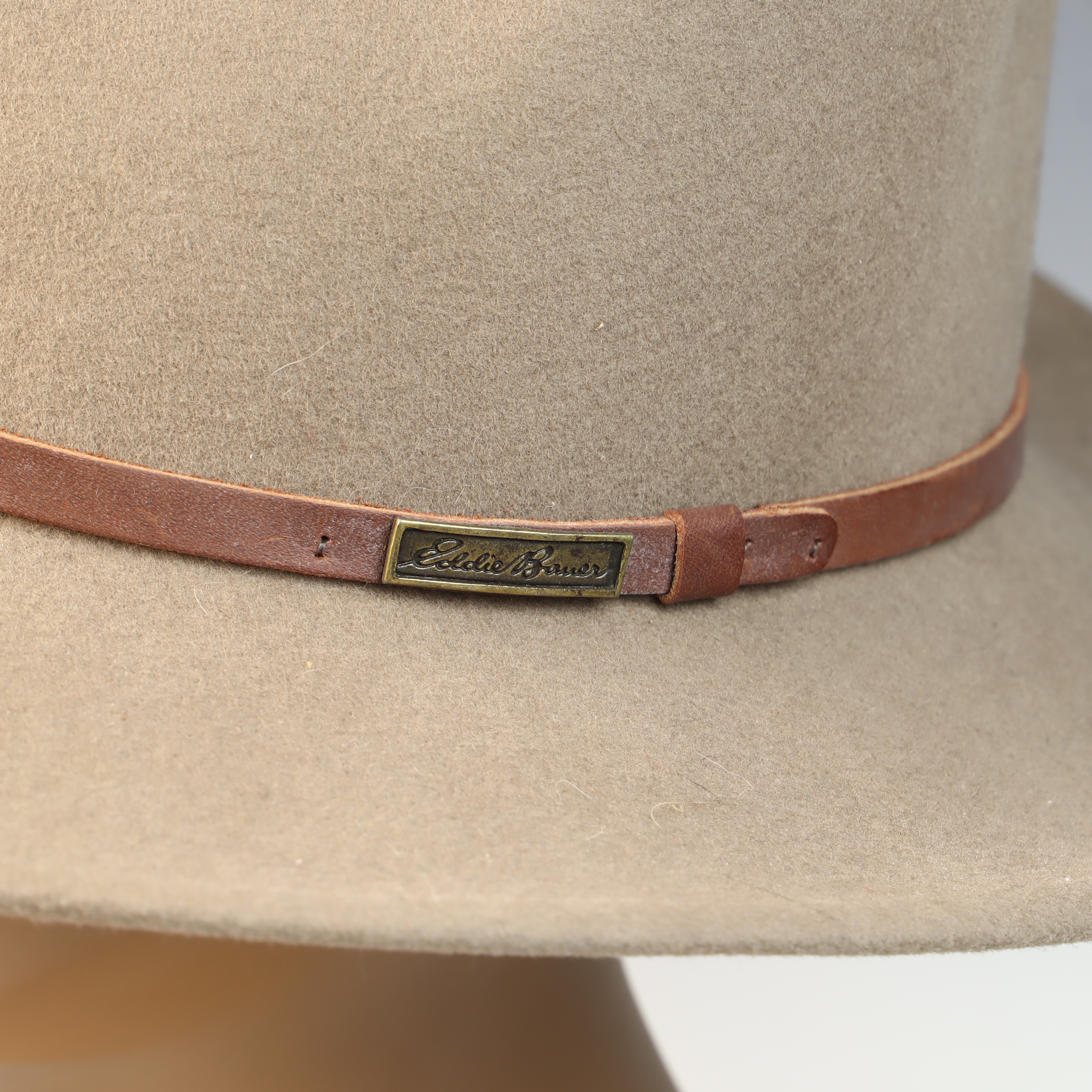 An Eddie Bauer outback-style fedora constructed from 100 percent wool Lite Felt in a taupe color. The hat features a teardrop pinched crown and a medium-width brim with a subtle turned-up edge. It is trimmed with a slim, smooth brown leather hatband secured by a leather keeper and a rectangular brass-toned plate bearing the Eddie Bauer script. The interior includes a black fabric sweatband with red contrast stitching and a small decorative ribbon bow at the rear. The interior crown is stamped with a silver-tone circular mark reading LITE FELT 100 percent WOOL. The sweatband features embroidered Eddie Bauer script. A gold-toned interior tag identifies the size as Large and includes WPL 5923, 100 percent Wool, and Made in U.S.A.