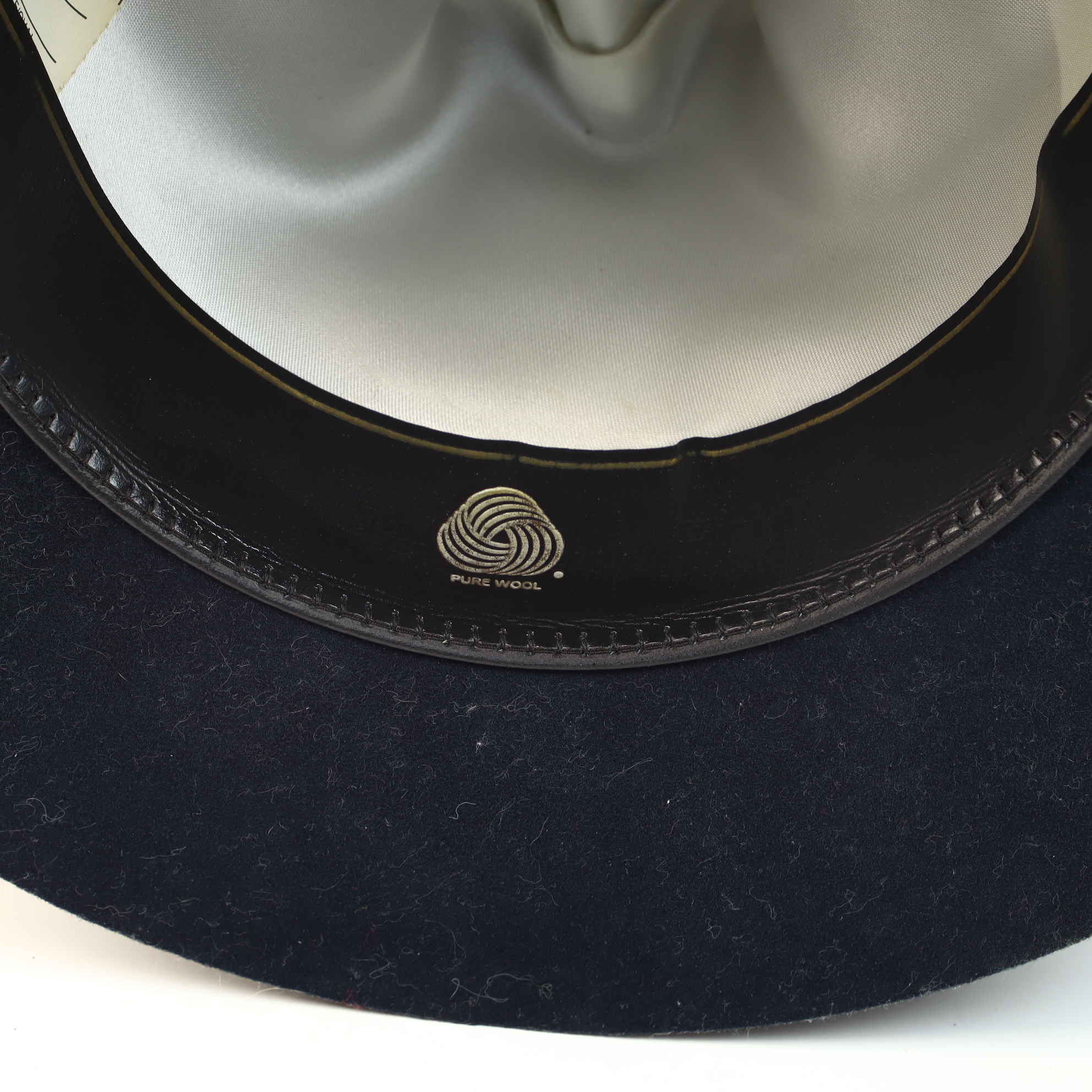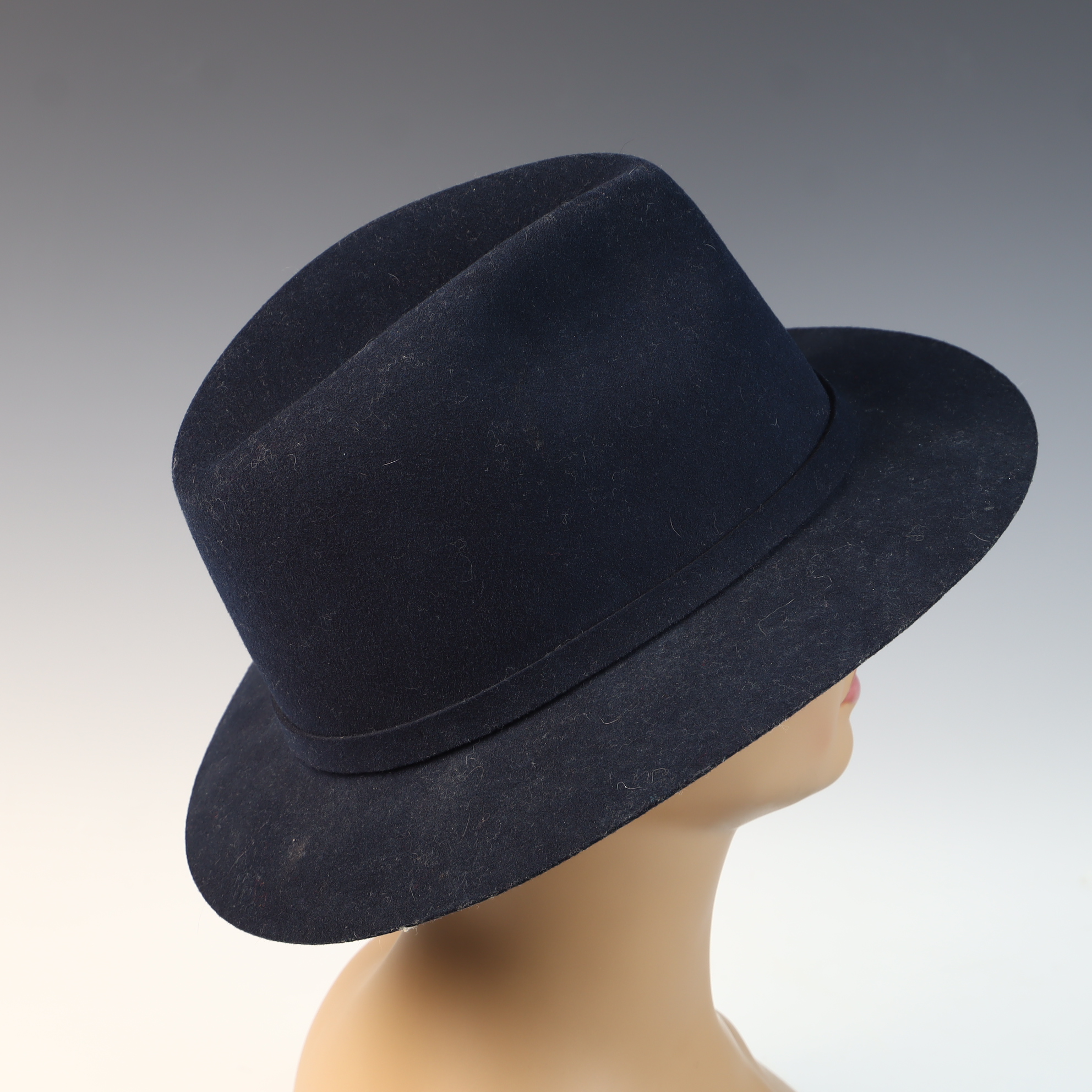 The hat is in good vintage condition. The wool felt maintains its shape and color, with some light surface lint and dust consistent with age and storage. The interior lining and leather sweatband are clean and well-preserved.