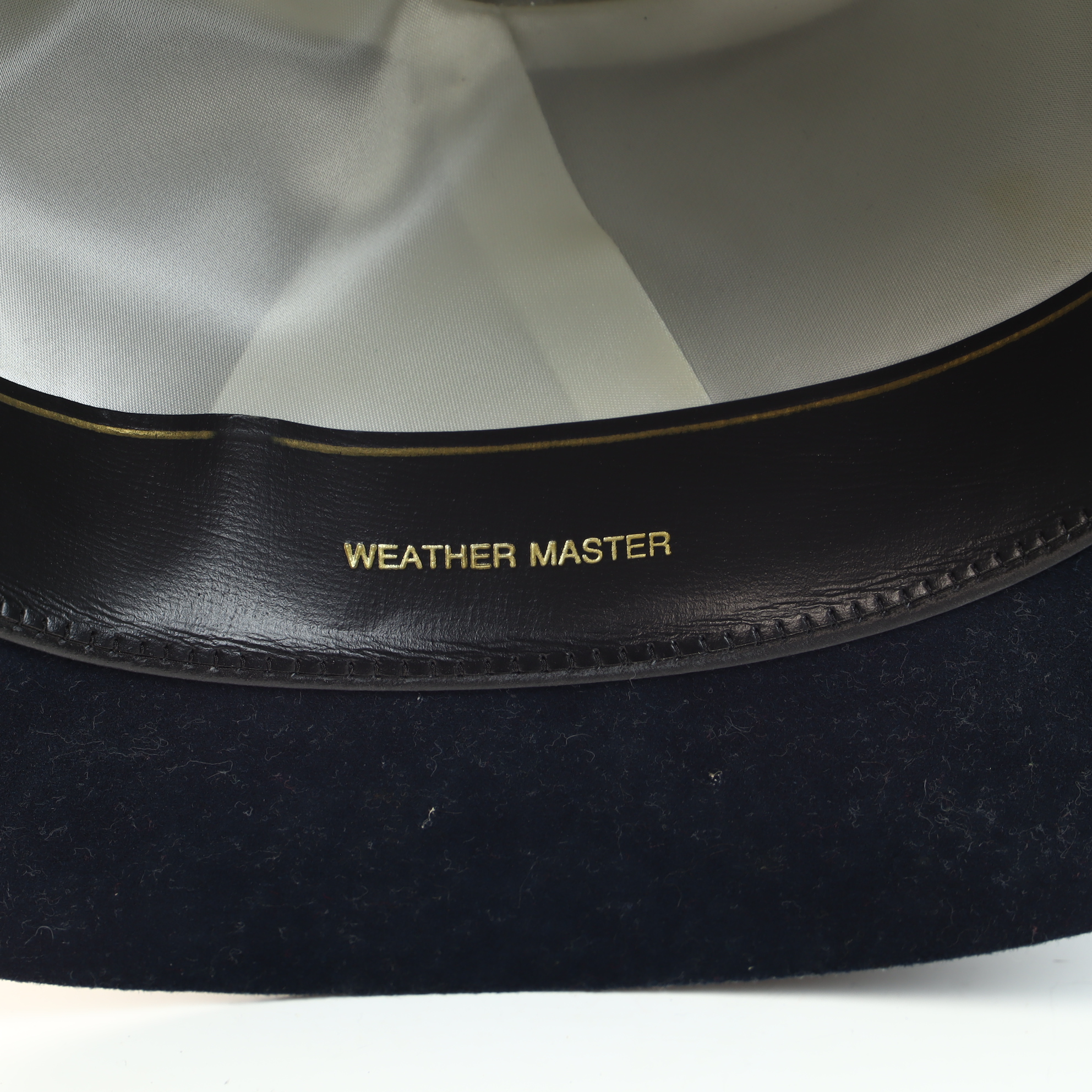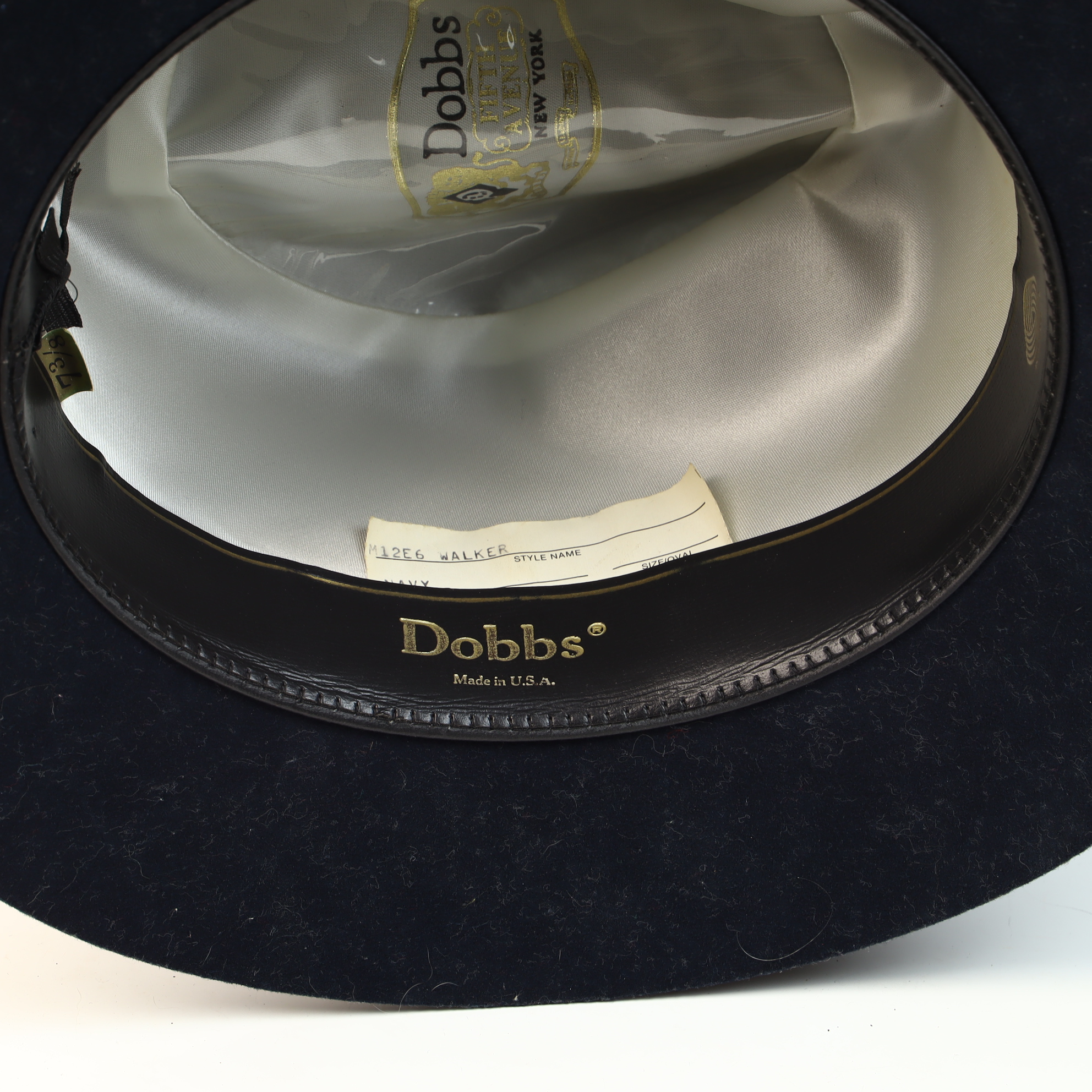 A vintage navy blue wool felt fedora manufactured by Dobbs Fifth Avenue New York, identified as the Walker model. This specific brand and model of hat is documented as the style worn by Michael Jackson during the 1984 Victory Tour. The hat features a pinched crown and a medium-width brim, trimmed with a matching wool felt band and a small rectangular brass-tone buckle. The interior is fully lined with white satin and features a central gold foil crest bearing the transcription Dobbs FIFTH AVENUE NEW YORK. The leather sweatband is stamped in gold with Dobbs Made in U.S.A. on one side and WEATHER MASTER on the other, alongside a Pure Wool logo. Original paper tags are present inside, identifying the style as M12E6 WALKER and the color as NAVY.Size: 7 3/8.