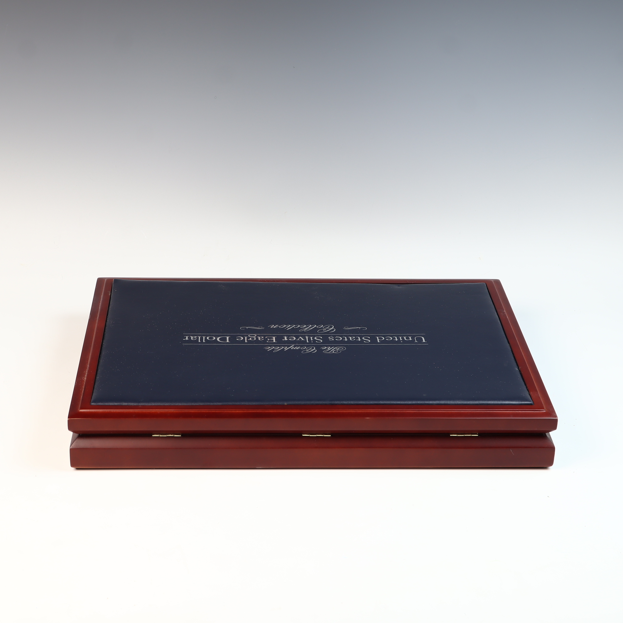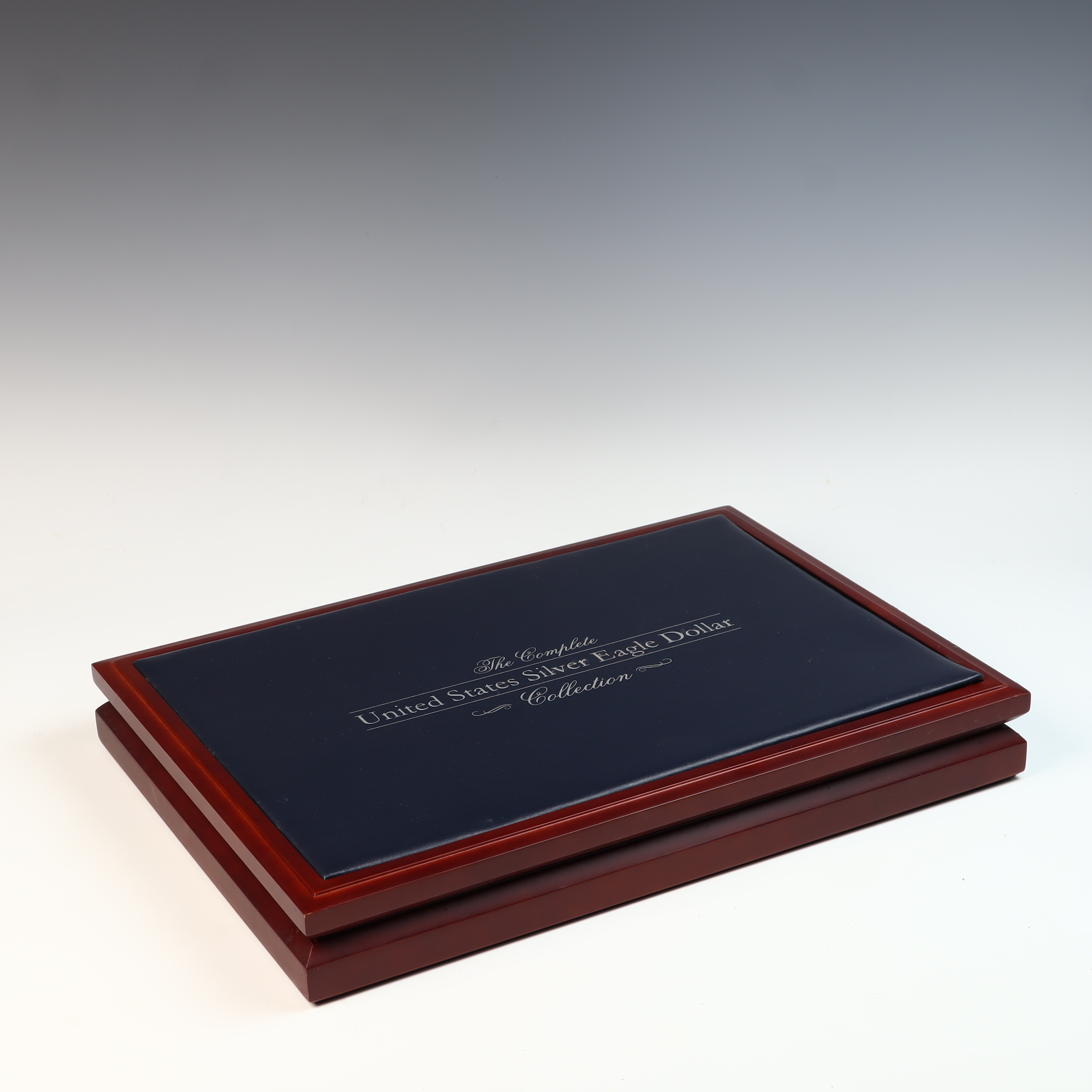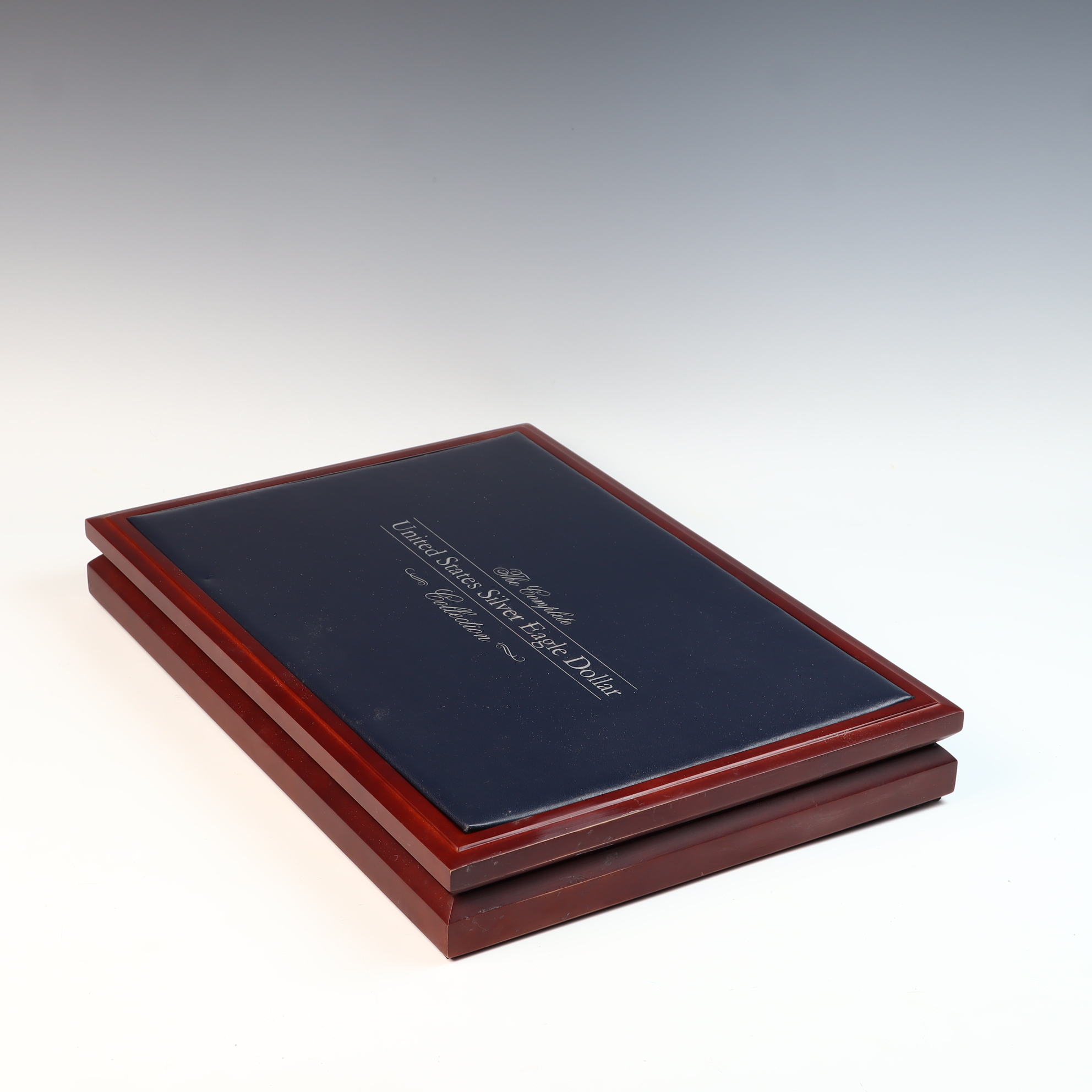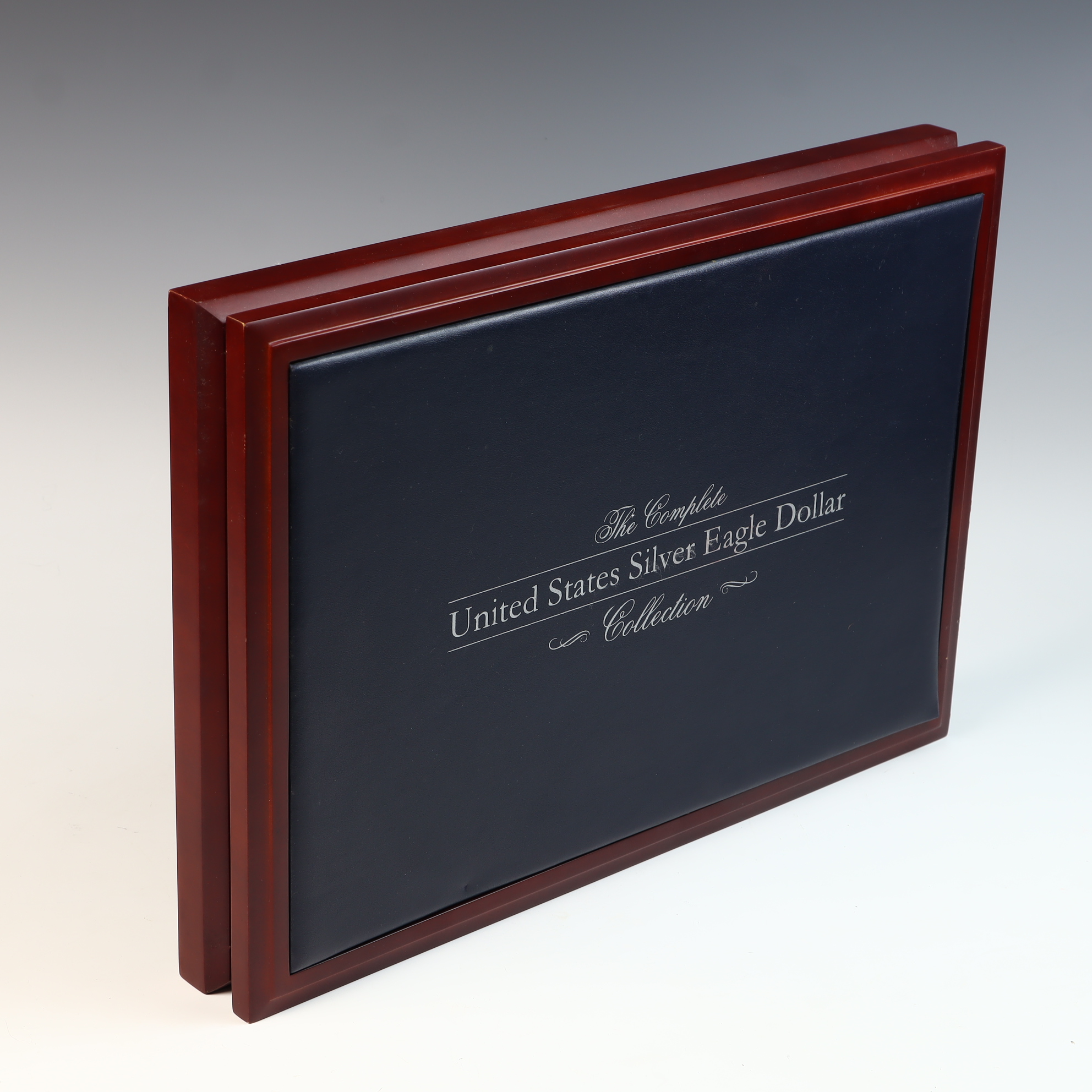 This lot consists of an empty wooden display case manufactured by The Morgan Mint for The Complete United States Silver Eagle Dollar Collection. The rectangular box features a polished reddish-brown finish with a dark blue padded lid inset inscribed with silver-toned lettering. The interior is lined with a deep blue velvet-like material and contains thirty-two circular cutouts for coin storage. The inside of the lid bears a gilded circular logo for The Morgan Mint featuring a profile of Liberty. This item is a storage case only; no bullion coins or plastic capsules are included.Total precious metal content: 0 oz tWidth: 15 inches.