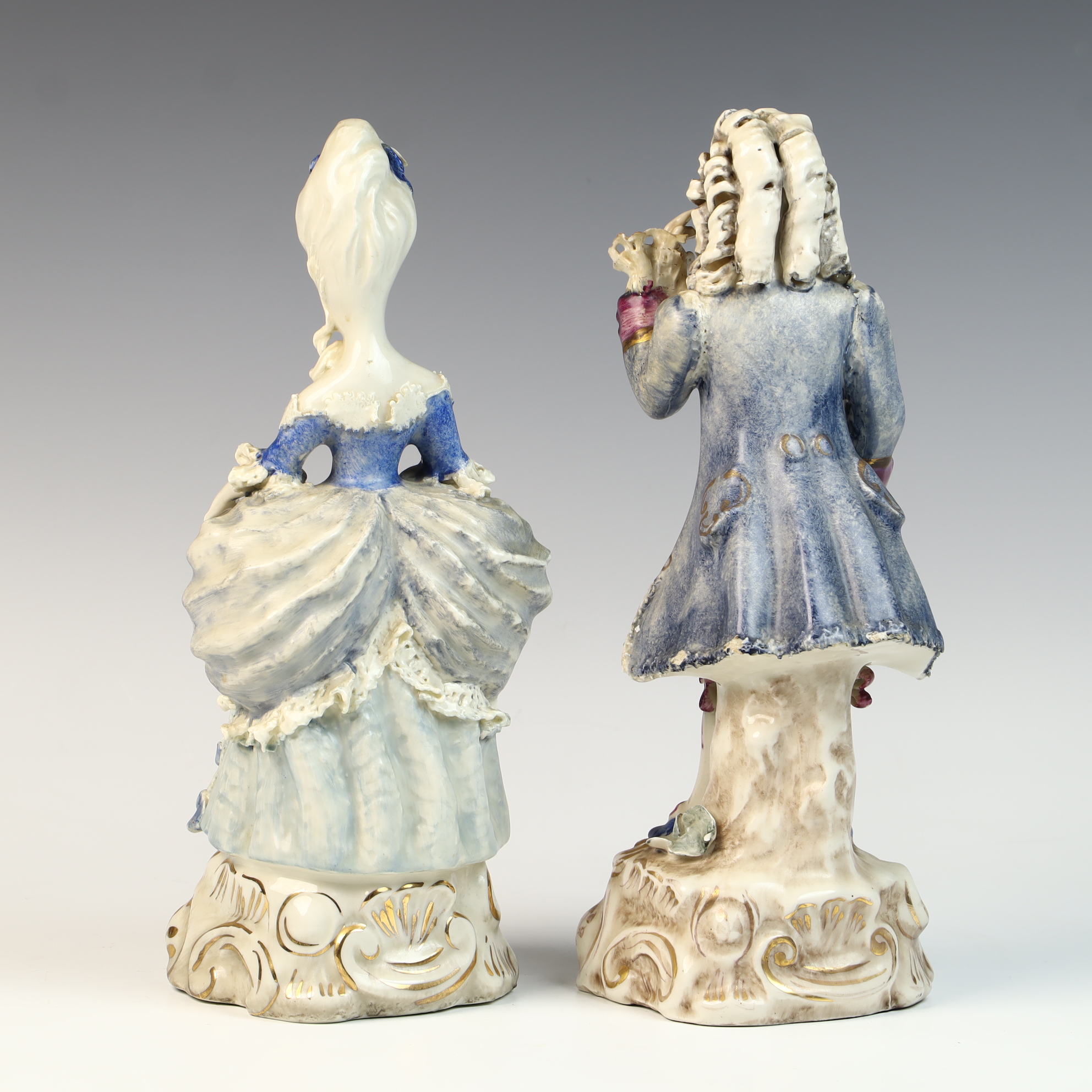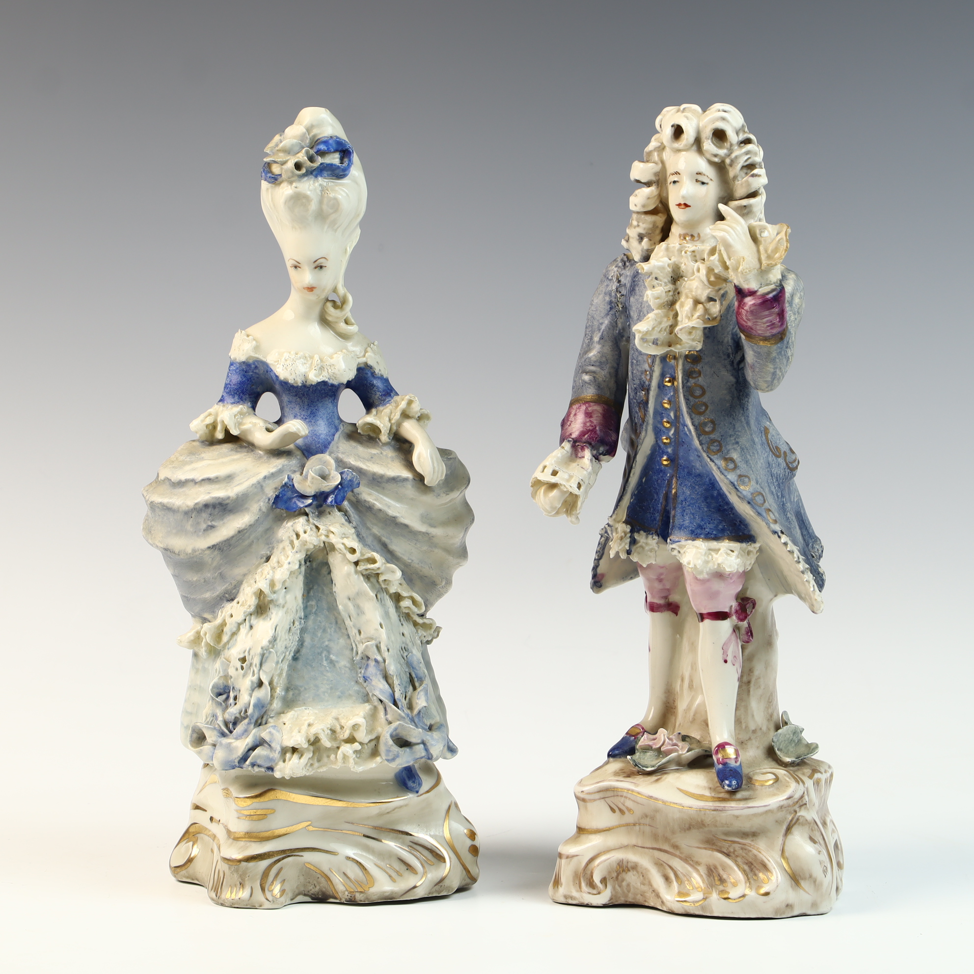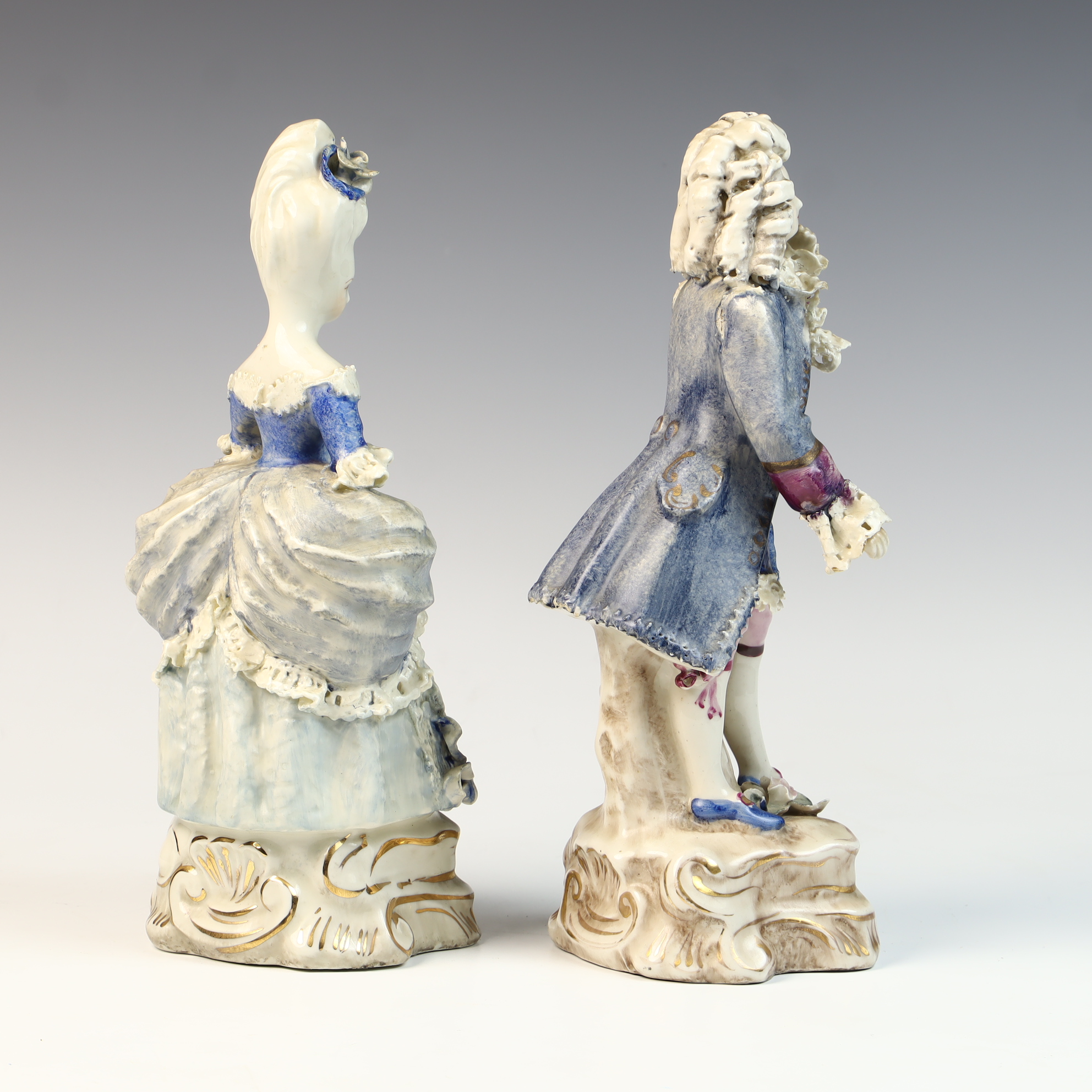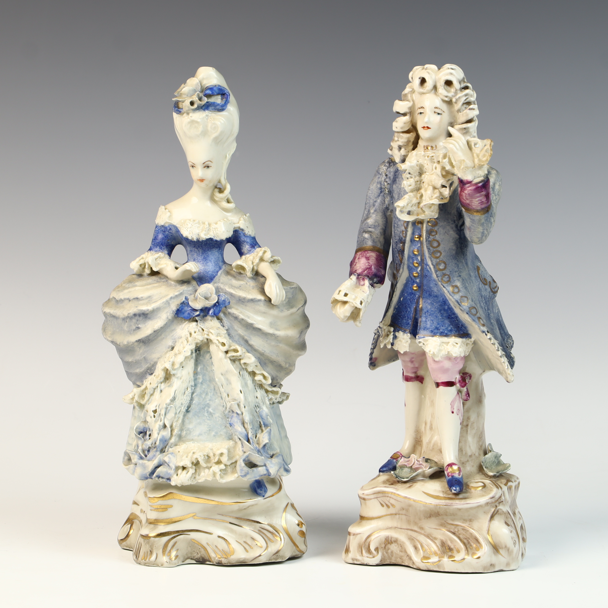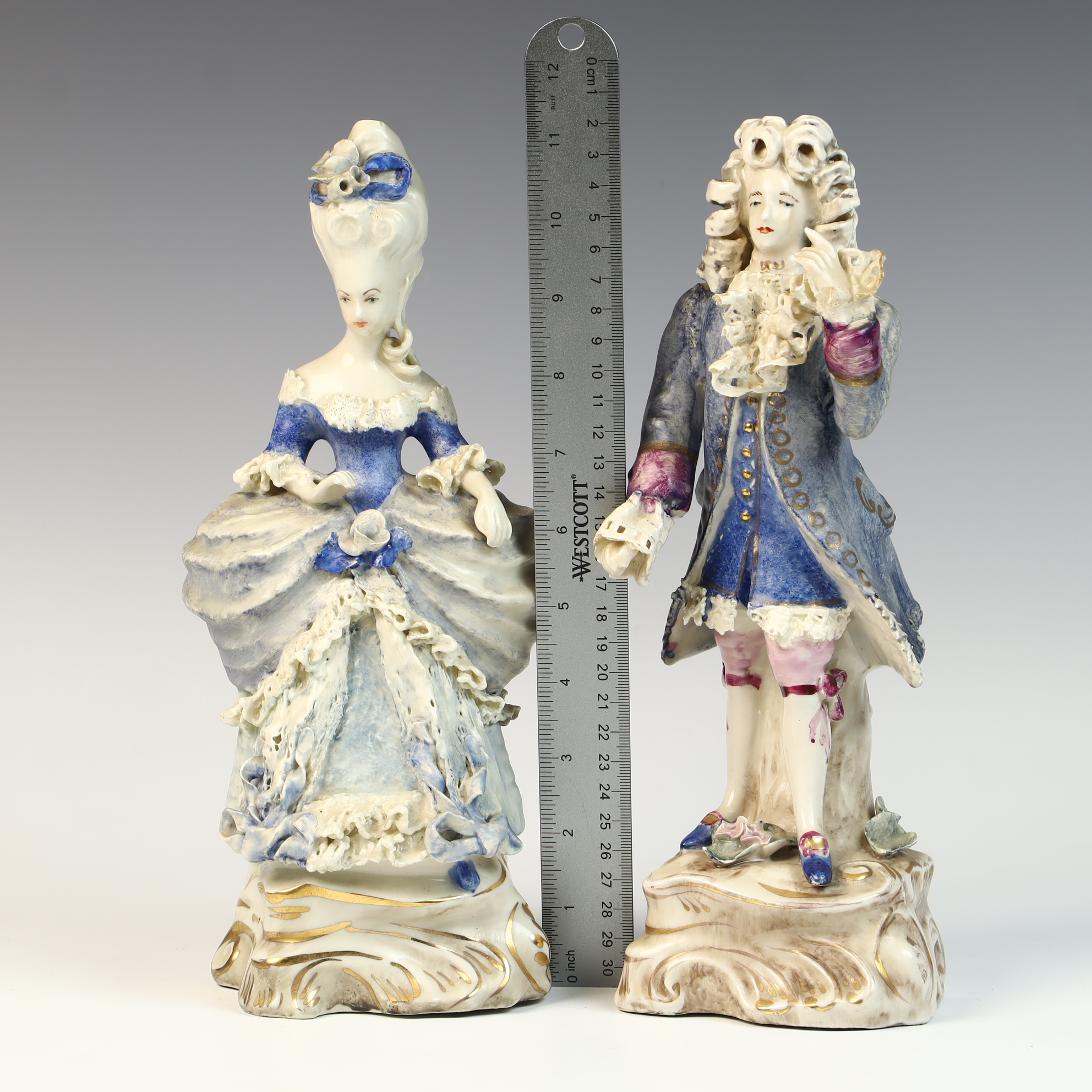 The figurines are in good overall condition. There is minor expected wear to the gilt accents, primarily on the raised edges of the scrollwork bases. No major breaks or professional repairs are visible. The delicate applied porcelain lace and ruffles show no prominent missing sections, though minute nicks consistent with age and material may be present upon close inspection. Adhesive sticker residue is present on the underside and side of the male figure base.