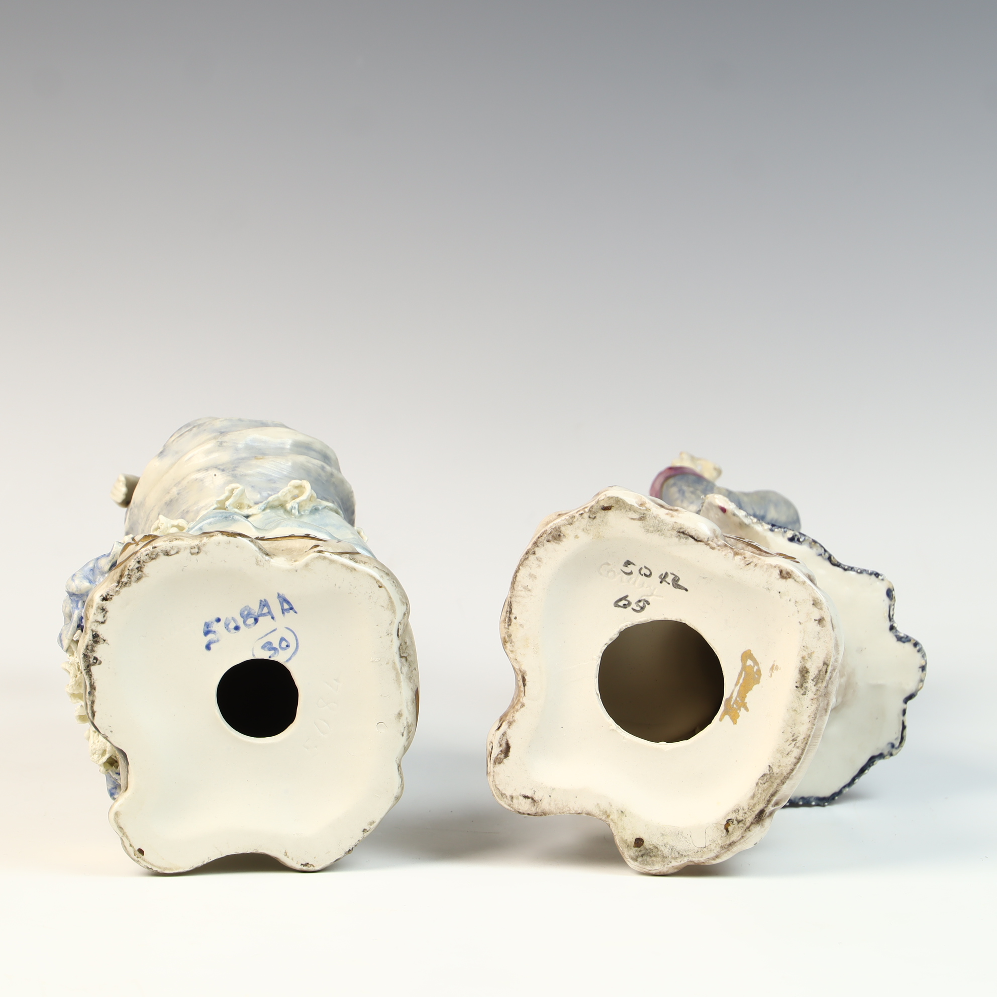 A pair of German glazed porcelain figurines depicting an 18th-century courtly couple in the Rococo Revival style. The female figure is modeled in a grand polonaise-style gown featuring layered ruffles and applied lace-work. She is depicted with a high, powdered pouf hairstyle accented with a blue ribbon and a single rose at her waist. The male figure is modeled in a long frock coat over an embroidered waistcoat and knee breeches, wearing a full-bottomed powdered periwig. He features delicate lace ruffles at the neck and cuffs. Both figures are set upon integral Rococo-style scrollwork bases accented with hand-painted gilding. The decorative palette is characterized by a mottled blue and white flow blue style glaze on the primary garments, with purple highlights on the cuffs and breeches.The underside of the female figure bears a handwritten blue mark 5084A and the number 30 within a circle, alongside an incised number 5084. The underside of the male figure bears a handwritten black mark 5082 with 65 below it, and a handwritten cursive mark reading Germany.Male: 11.75 inchesFemale: 11 inches.