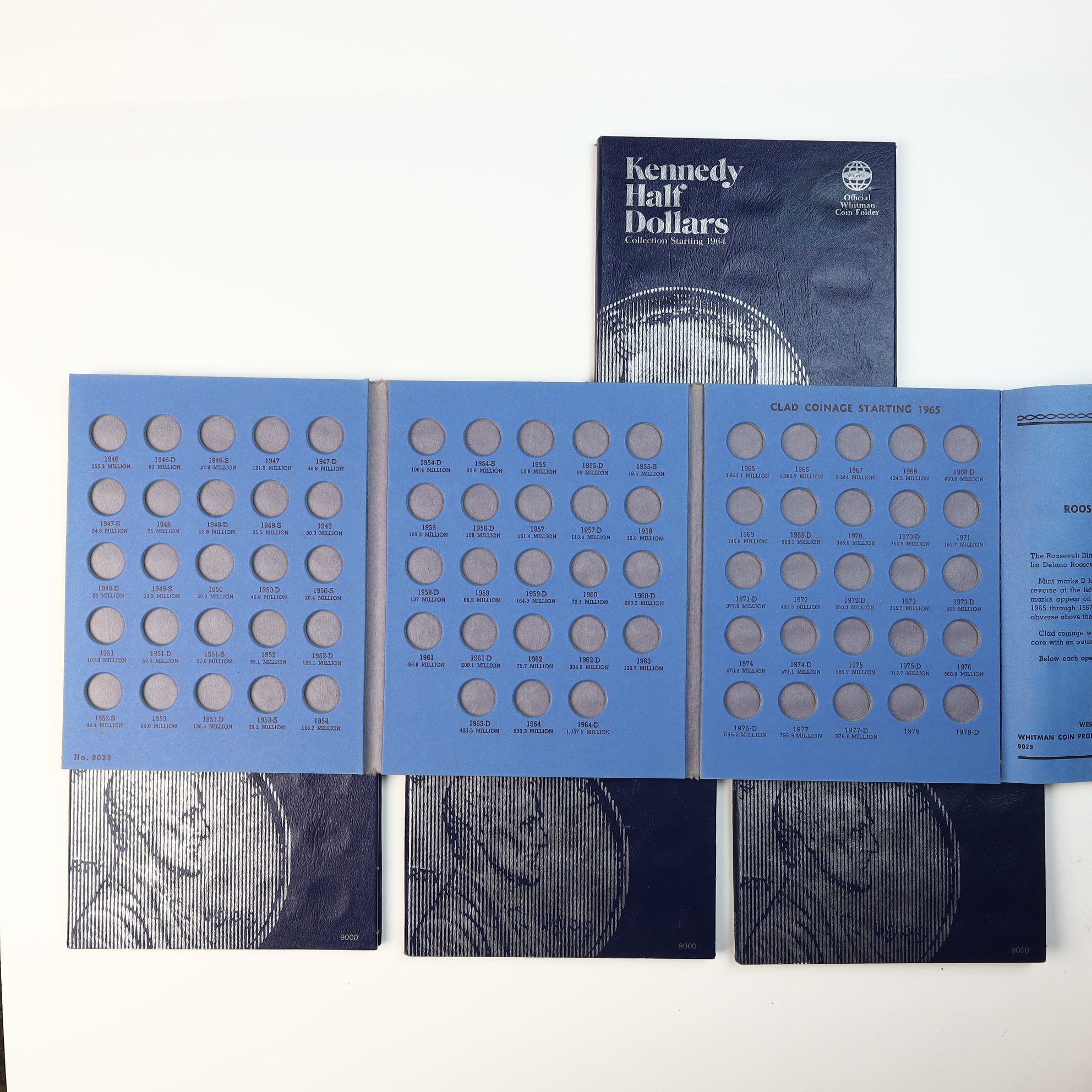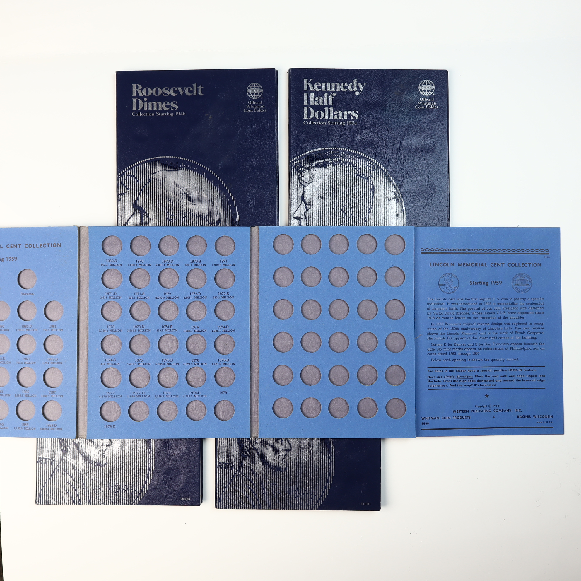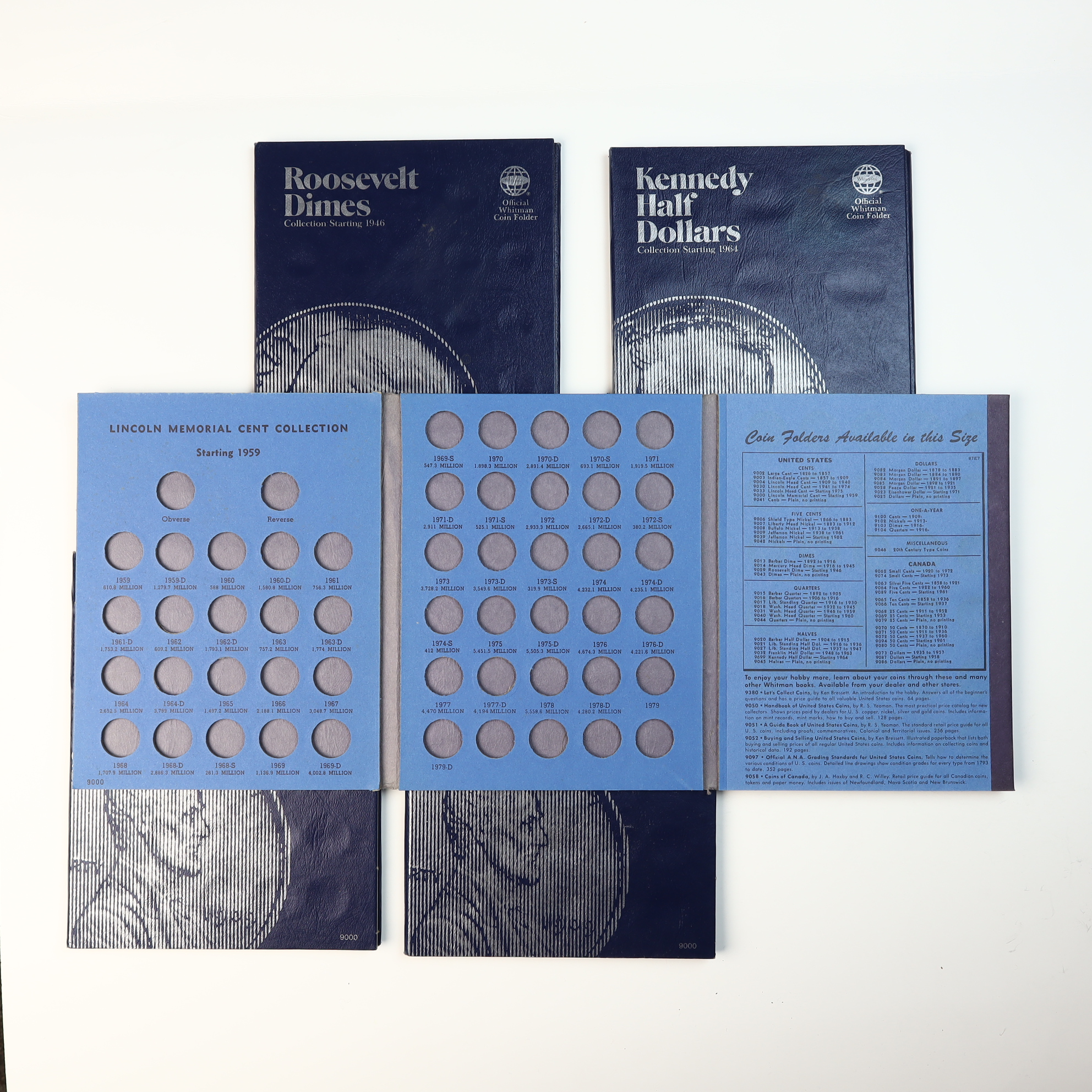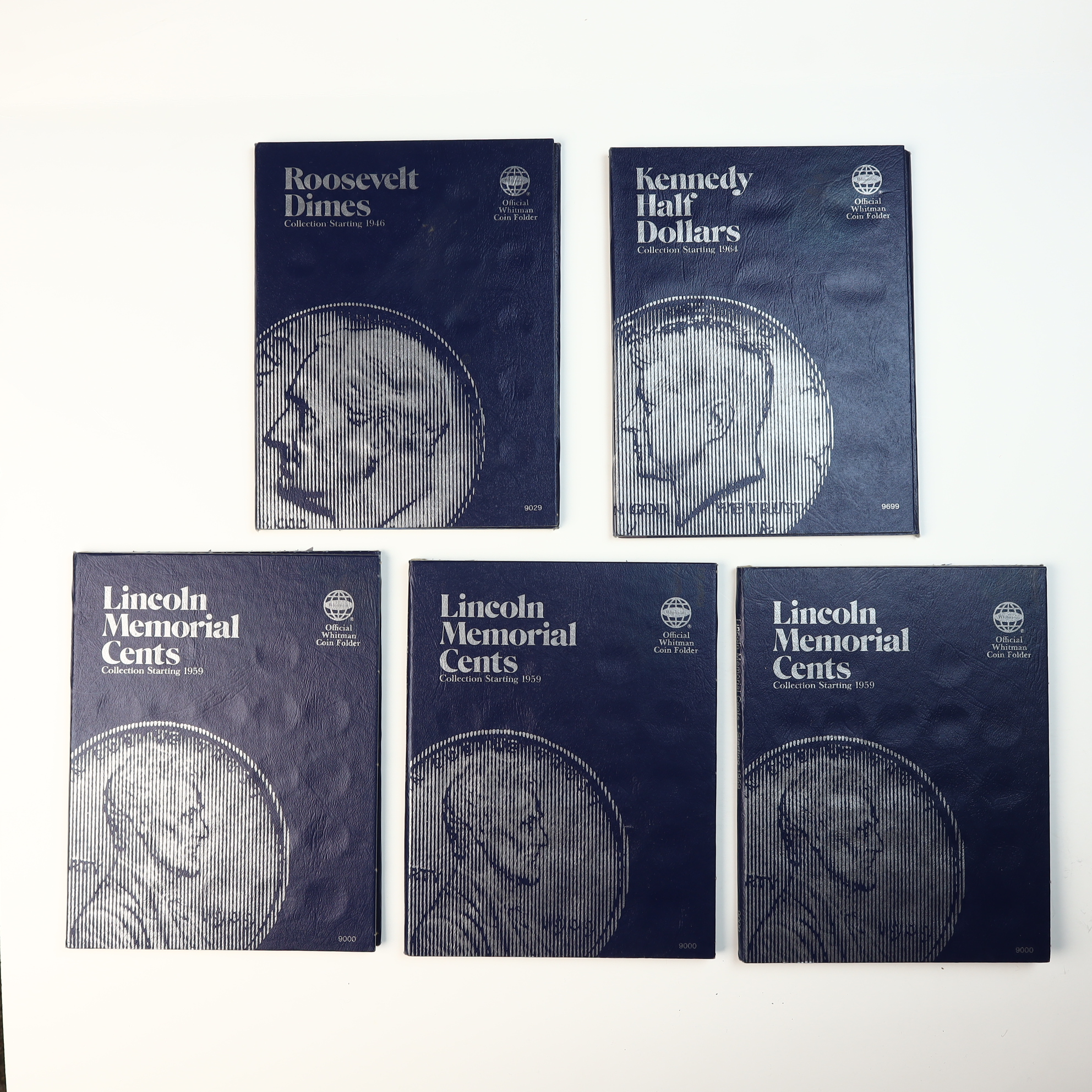 A collection of five vintage Official Whitman Coin Folders manufactured by Western Publishing Company, Inc. in Racine, Wisconsin. The lot includes three folders for US Lincoln Memorial Cents (No. 9000, collection starting 1959), one for US Roosevelt Dimes (No. 9029, collection starting 1946), and one for US Kennedy Half Dollars (No. 9699, collection starting 1964). Each navy blue trifold cardboard folder features a silver-toned stylized line-art portrait of the respective historical figure on the cover, accompanied by the Whitman globe logo. The interiors are fitted with pre-cut circular slots organized by date and mint mark, with printed mintage statistics provided below each opening. The dime and half dollar folders include slots through 1978-D, while the cent folders include slots through 1979-D. All folders are offered in empty condition, containing no coins.