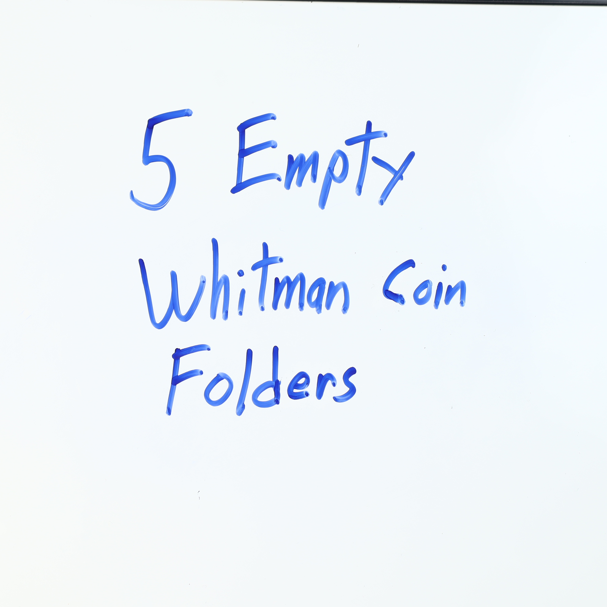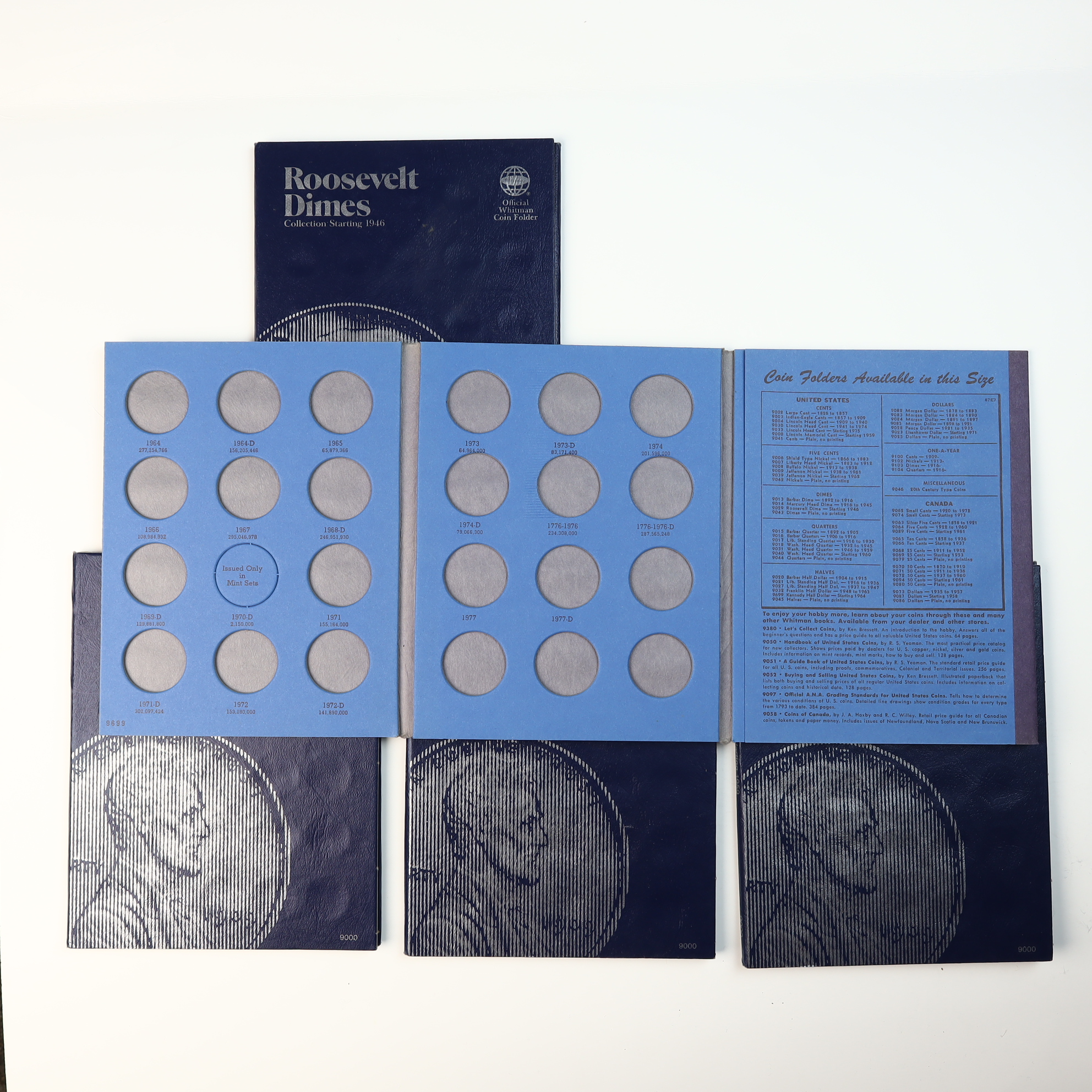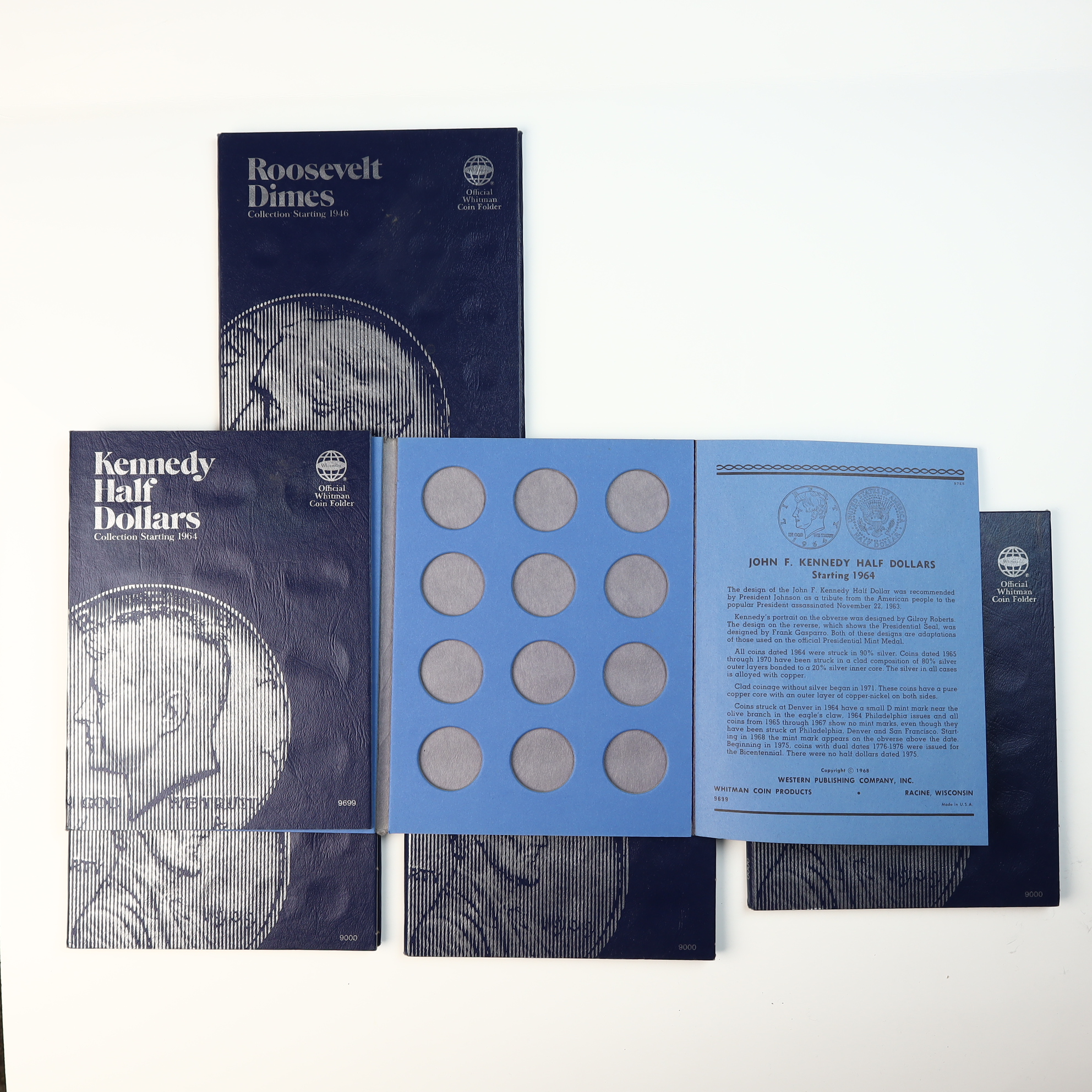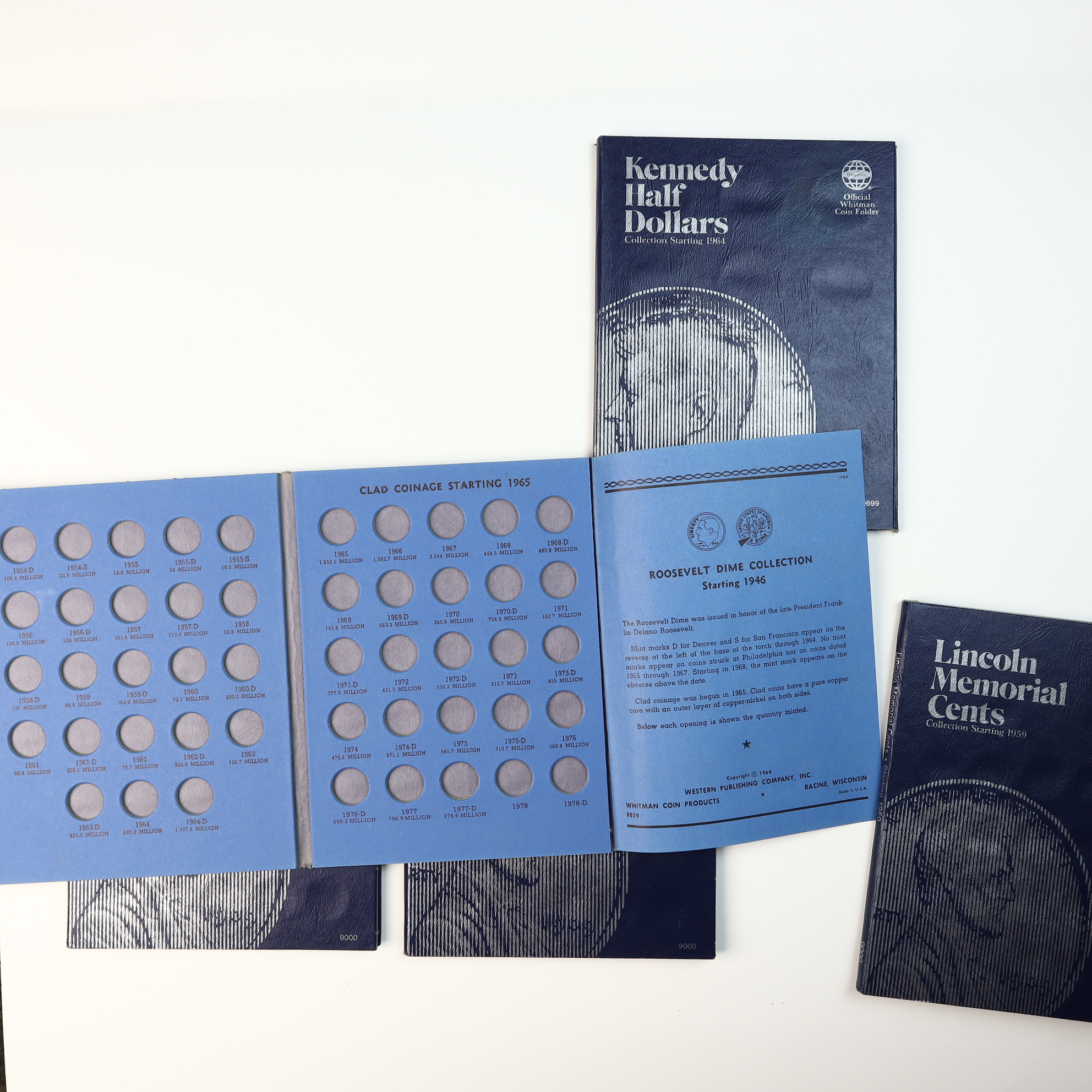 A collection of five vintage Official Whitman Coin Folders manufactured by Western Publishing Company, Inc. in Racine, Wisconsin. The lot includes three folders for US Lincoln Memorial Cents (No. 9000, collection starting 1959), one for US Roosevelt Dimes (No. 9029, collection starting 1946), and one for US Kennedy Half Dollars (No. 9699, collection starting 1964). Each navy blue trifold cardboard folder features a silver-toned stylized line-art portrait of the respective historical figure on the cover, accompanied by the Whitman globe logo. The interiors are fitted with pre-cut circular slots organized by date and mint mark, with printed mintage statistics provided below each opening. The dime and half dollar folders include slots through 1978-D, while the cent folders include slots through 1979-D. All folders are offered in empty condition, containing no coins.