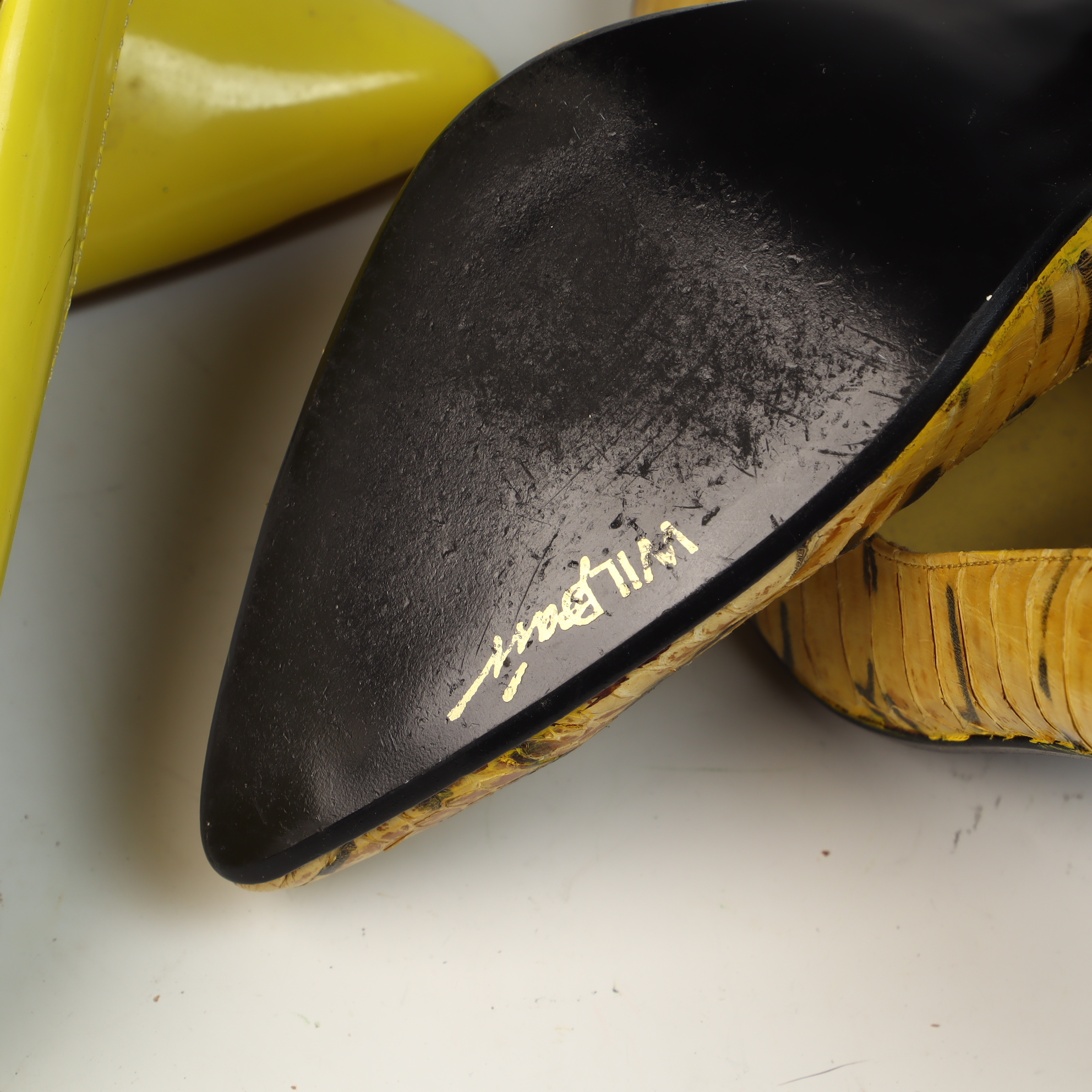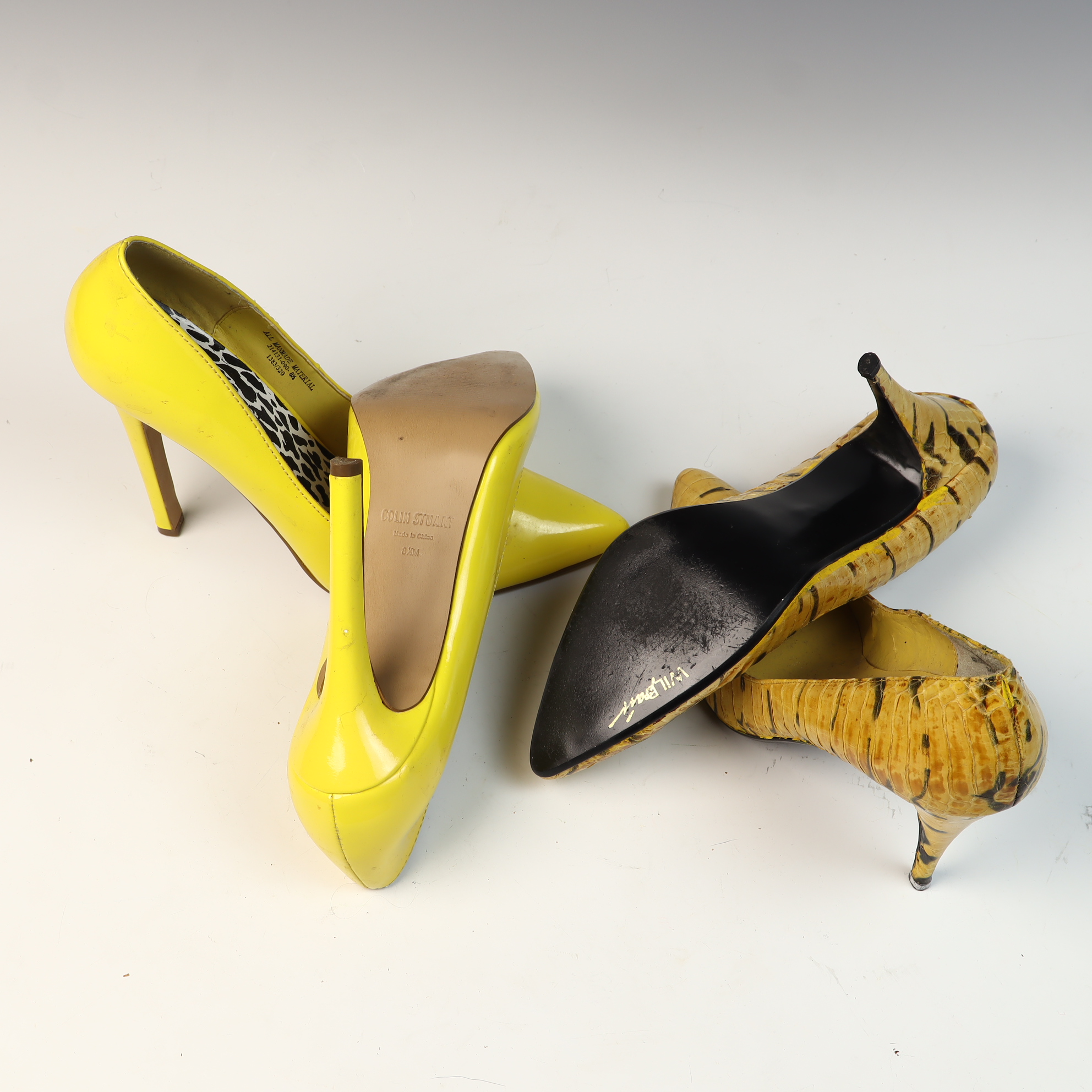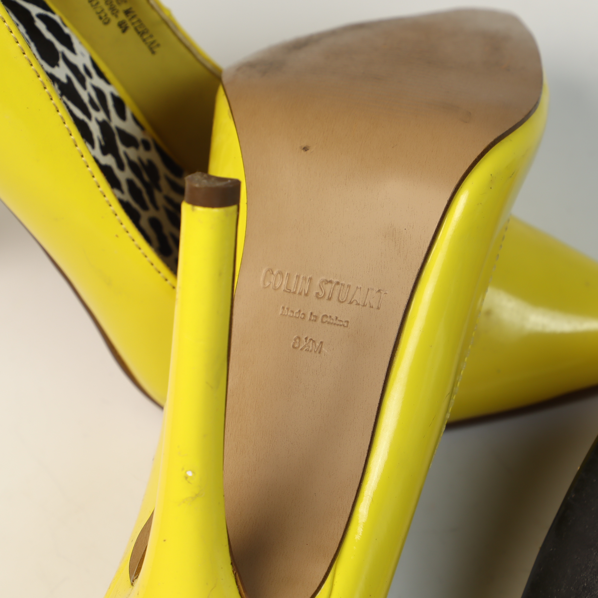 This lot consists of two pairs of yellow pointed-toe stiletto pumps. The first pair is by Colin Stuart and features a bright yellow patent finish on man-made uppers with a black and white animal-patterned interior lining. The tan outsoles are stamped with the brand name, Made in China, and size 8 1/2 M. The interior is printed with the text All Manmade Material and the numbers 214131-090- 8 1/2 and 1383/320. The second pair is by Wild Pair and features an embossed reptile-patterned material in yellow with black and brown variegated accents. The insoles contain a fabric label with the brand name, and the black outsoles feature a gold-toned Wild Pair signature.Colin Stuart Heel Height: Approximately 4.25 inchesWild Pair Heel Height: Approximately 3.75 inchesColin Stuart Size: US Women’s 8.5 M.