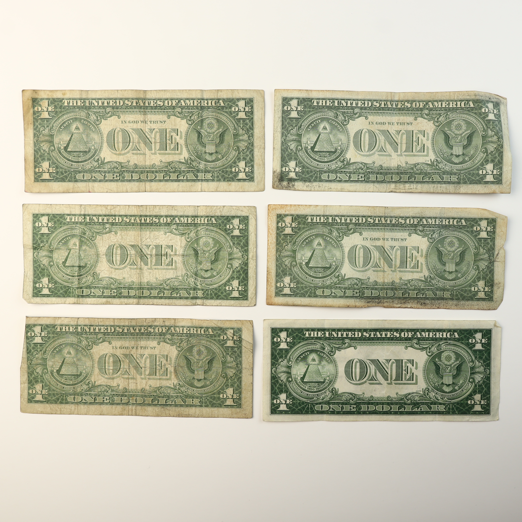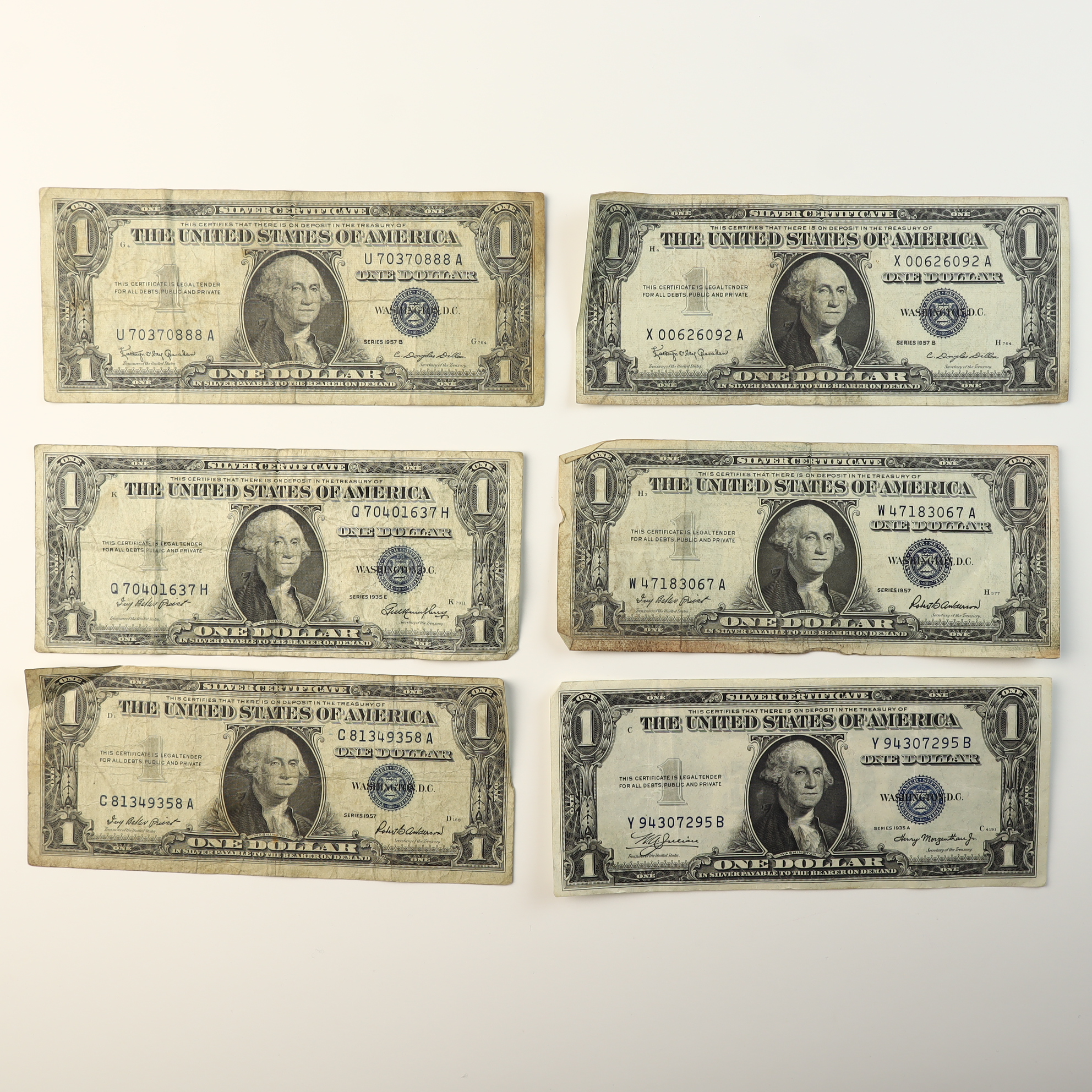 A collection of six US $1 silver certificates comprising two Series 1935 notes and four Series 1957 notes. The group includes Series 1935 A, 1935 E, 1957, and 1957 B. Each note features the characteristic blue Treasury seal and blue serial numbers. The obverse contains a central portrait vignette of George Washington printed in black ink, while the reverse features the Great Seal of the United States in green ink. Signatures present include Julian/Morgenthau, Priest/Humphrey, Priest/Anderson, and Smith/Dillon. Serial numbers are U 70370888 A, X 00626092 A, Q 70401637 H, W 47183067 A, C 81349358 A, and Y 94307295 B. No star notes or fancy serial numbers are present in this lot.