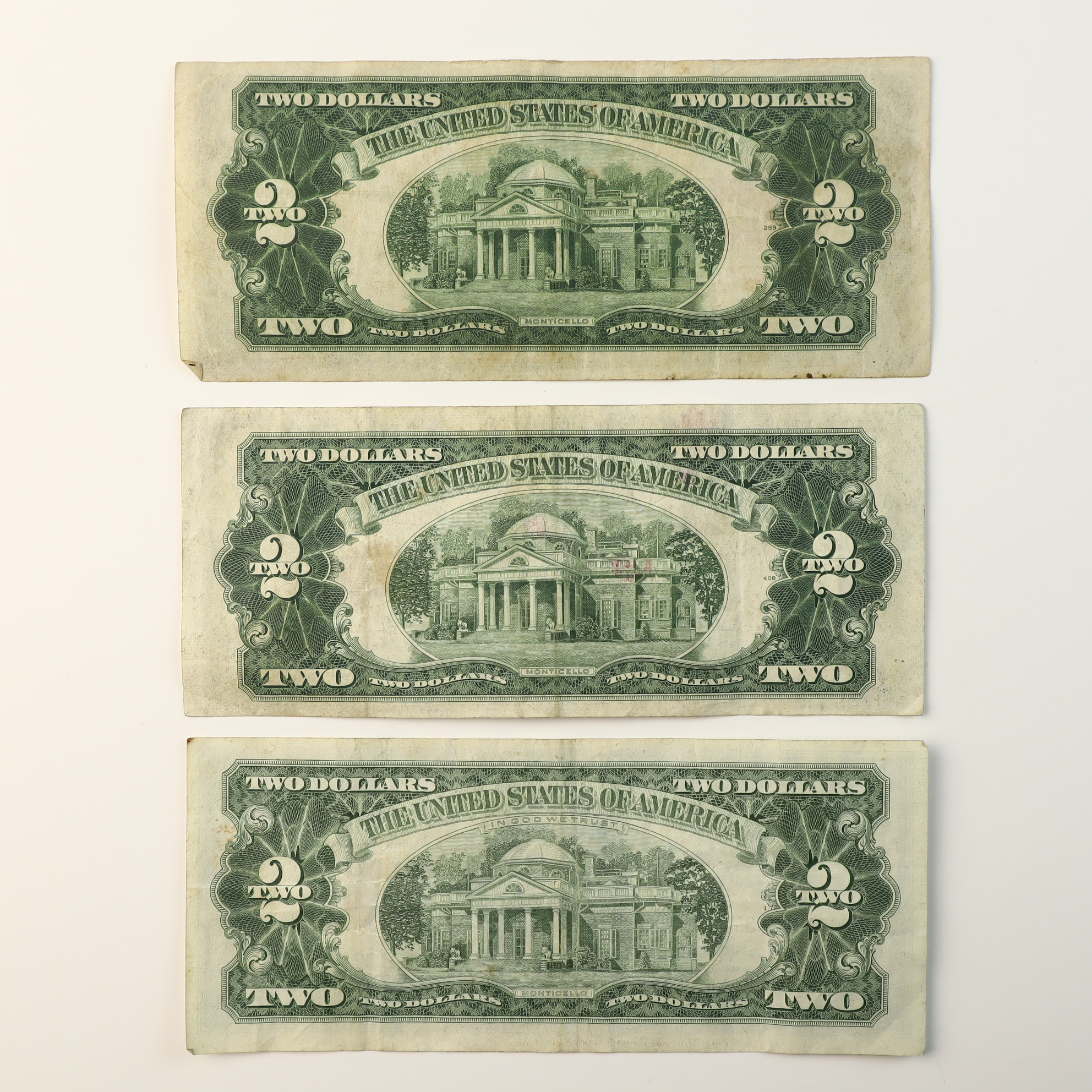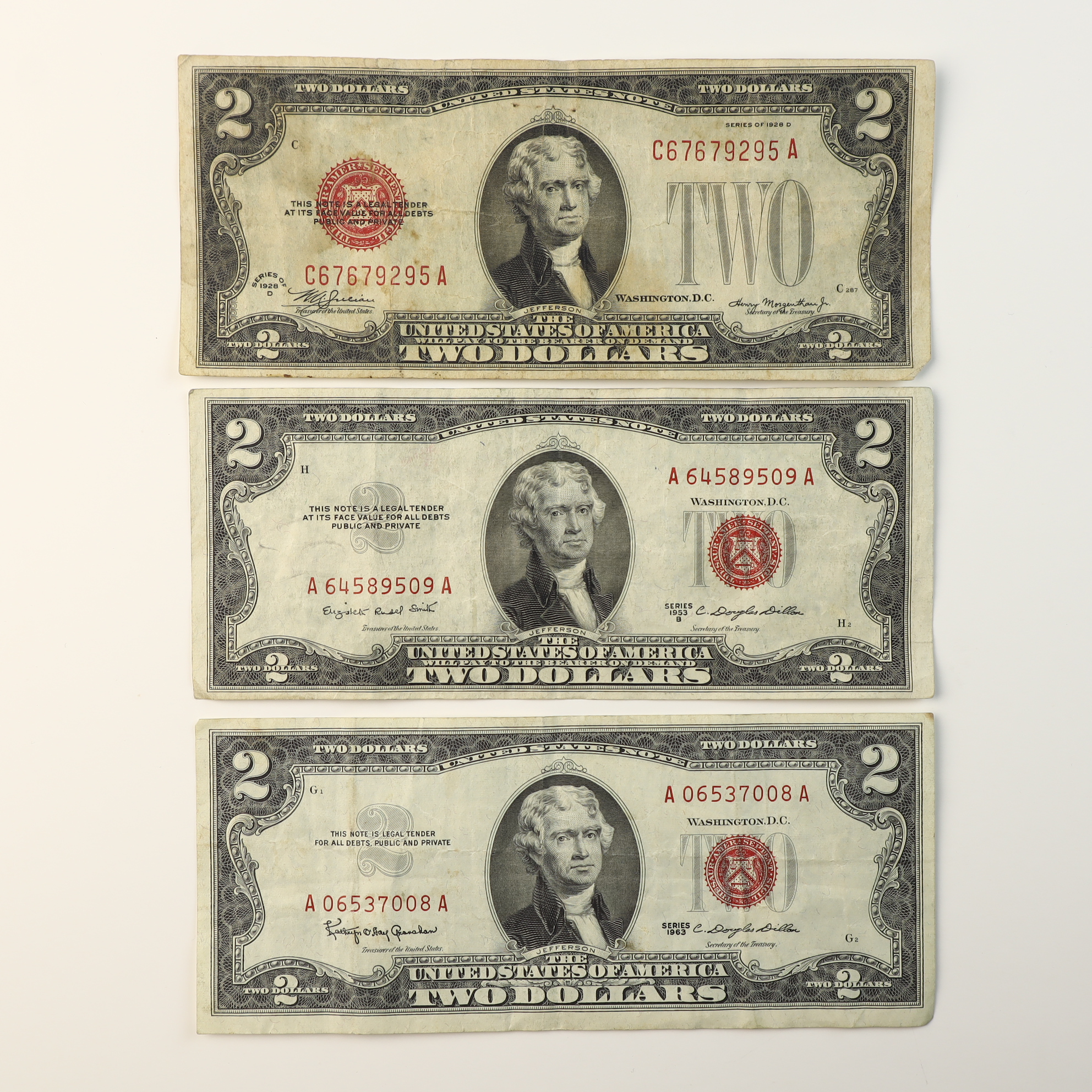This lot consists of three US Legal Tender Notes, also known as United States Notes, featuring prominent red Treasury seals and red serial numbers. The collection includes one Series 1928 D note, one Series 1953 B note, and one Series 1963 note. Each note features the portrait of Thomas Jefferson on the obverse and a vignette of Monticello on the reverse. The Series 1928 D note displays serial number C67679295A and bears the signatures of Treasurer Julian and Secretary Morgenthau Jr. The Series 1953 B note displays serial number A64589509A and bears the signatures of Treasurer Smith and Secretary Dillon. The Series 1963 note displays serial number A06537008A and bears the signatures of Treasurer Granahan and Secretary Dillon. The Series 1963 note includes the motto In God We Trust on the reverse, which is absent from the 1928 D and 1953 B series examples.
