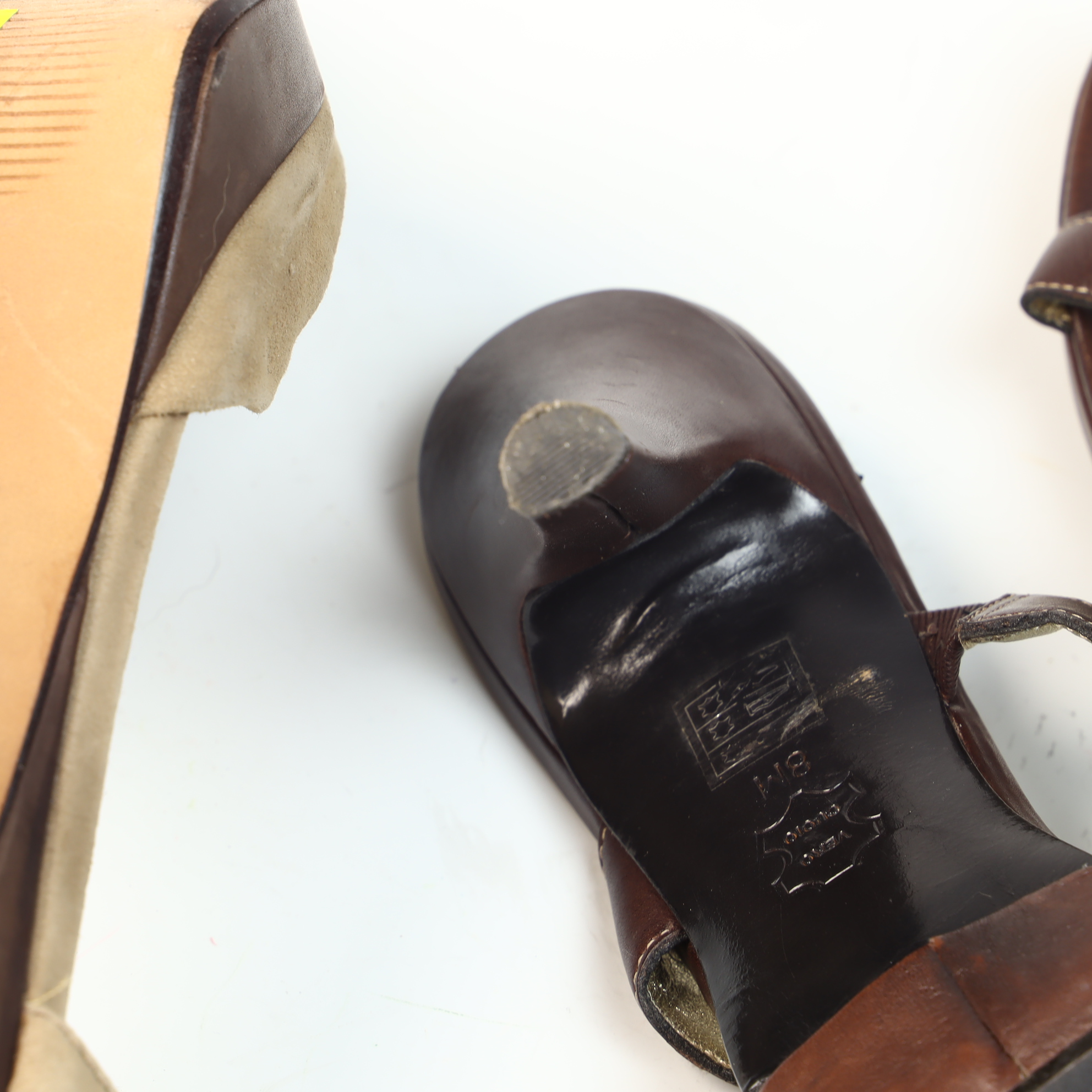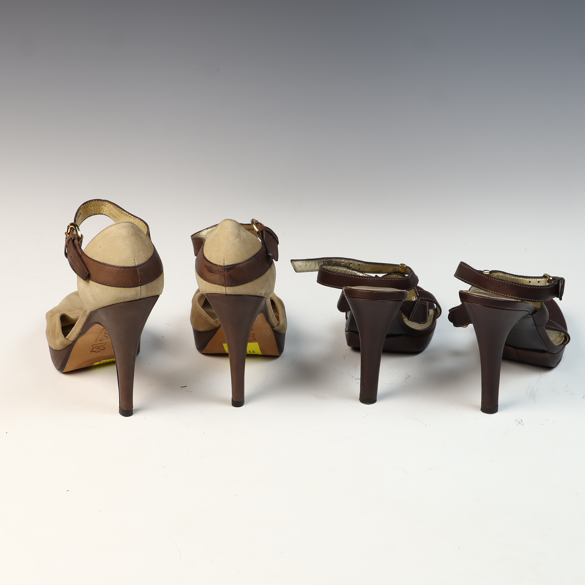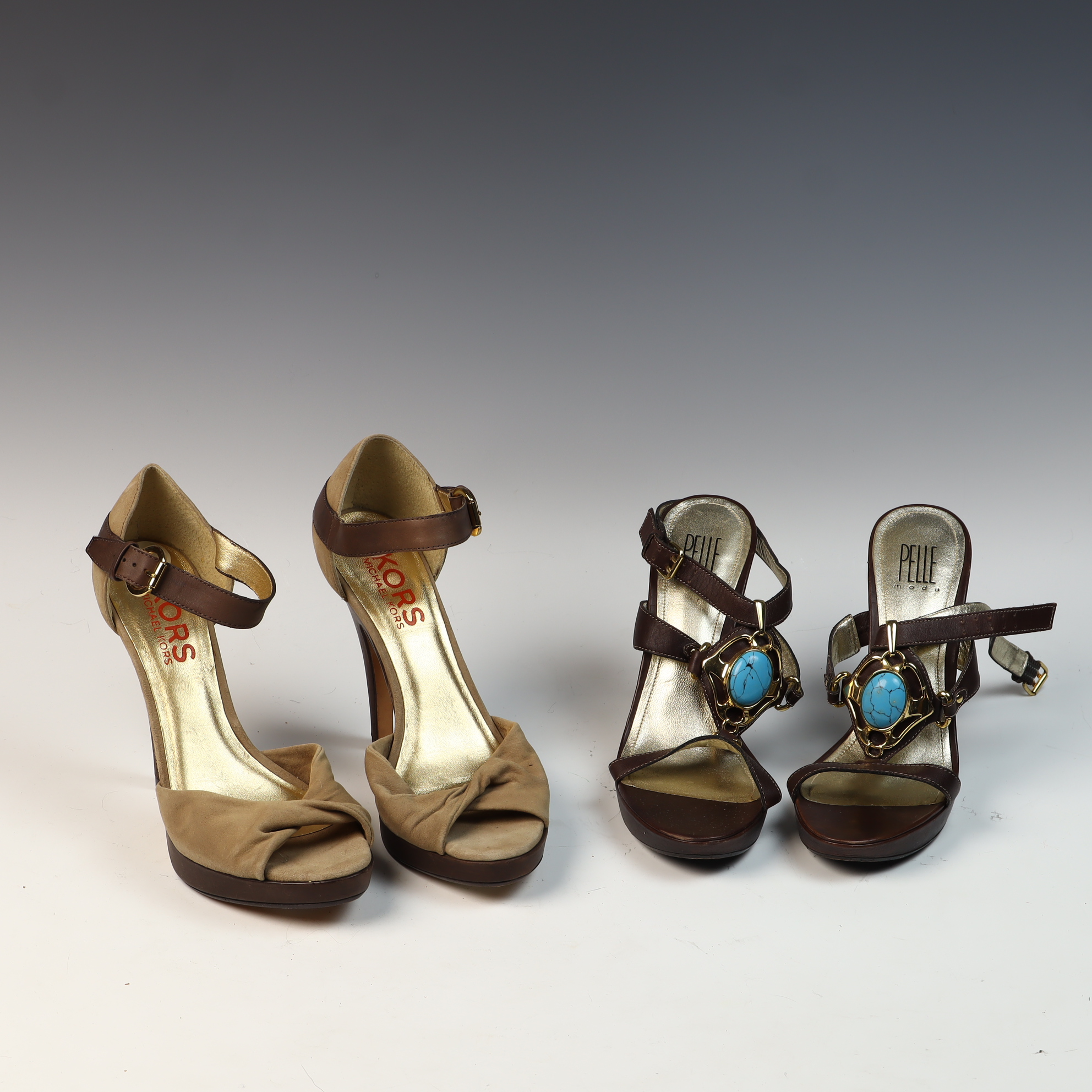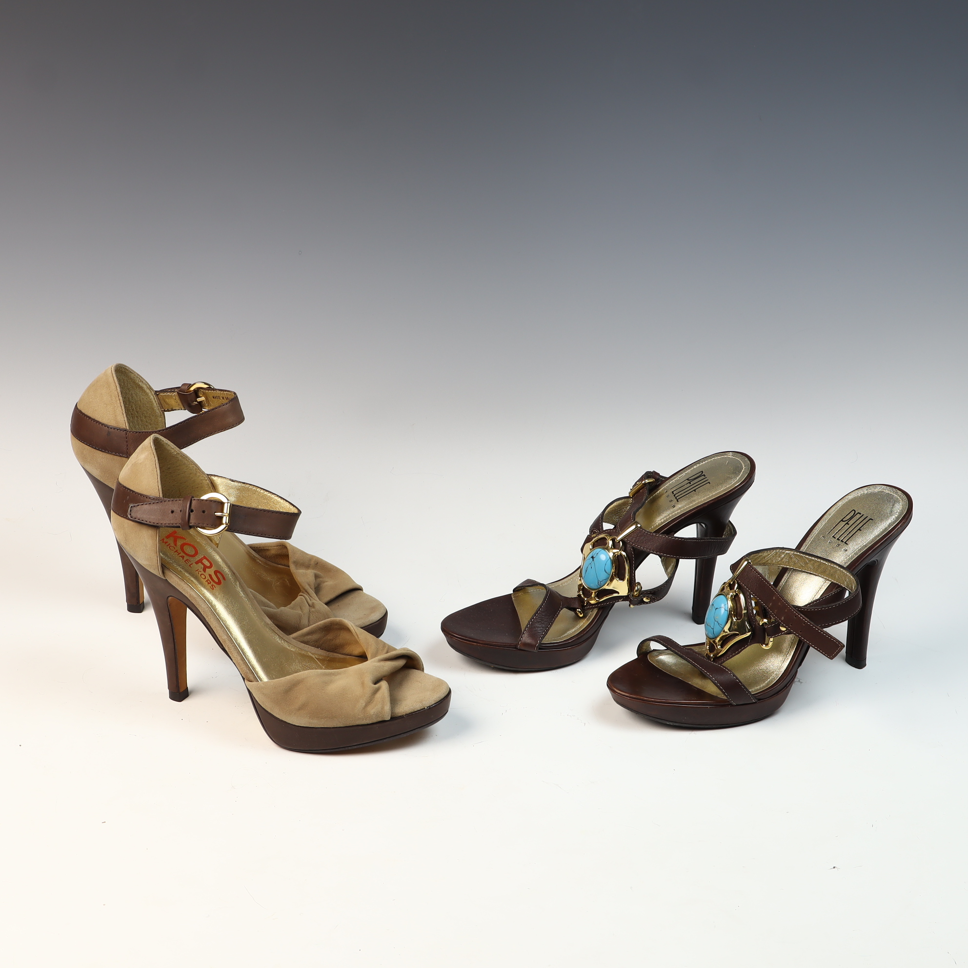 This lot consists of two pairs of designer platform sandals in US women’s size 8M. The first pair is by Kors Michael Kors, featuring a peep-toe silhouette with a knotted tan suede vamp and chocolate brown leather adjustable ankle straps. The interior is finished with a gold-tone metallic lining and the leather soles are stamped with the maker’s mark and size. The second pair is by Pelle Moda, constructed from dark brown leather with a strappy design. Each shoe is accented with a large gold-tone central medallion inset with a turquoise-colored cabochon. These sandals feature adjustable ankle buckles, gold-tone metallic linings, and leather soles stamped Vero Cuoio.Kors Michael Kors: 4.5 inch heel, 1 inch platformPelle Moda: 4.25 inch heel, 0.75 inch platform.