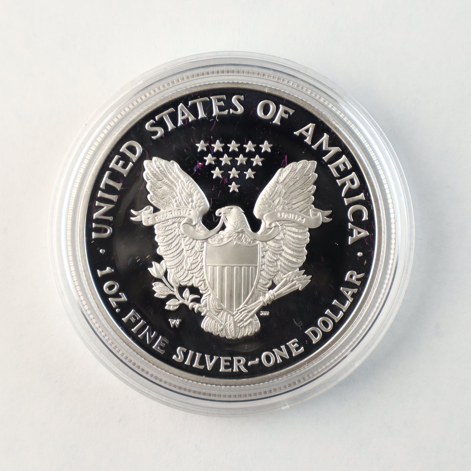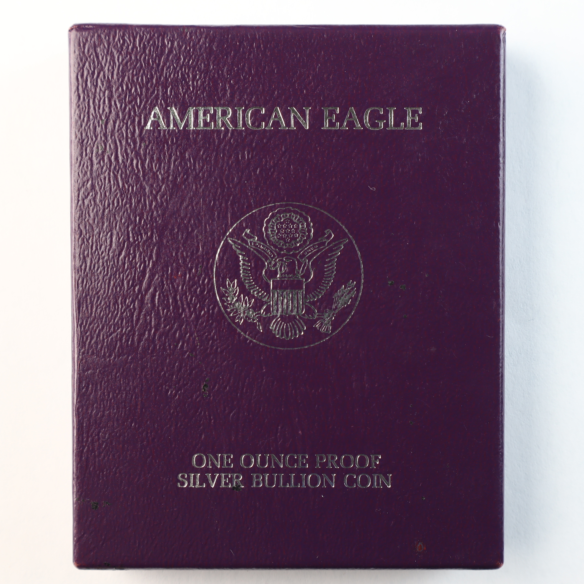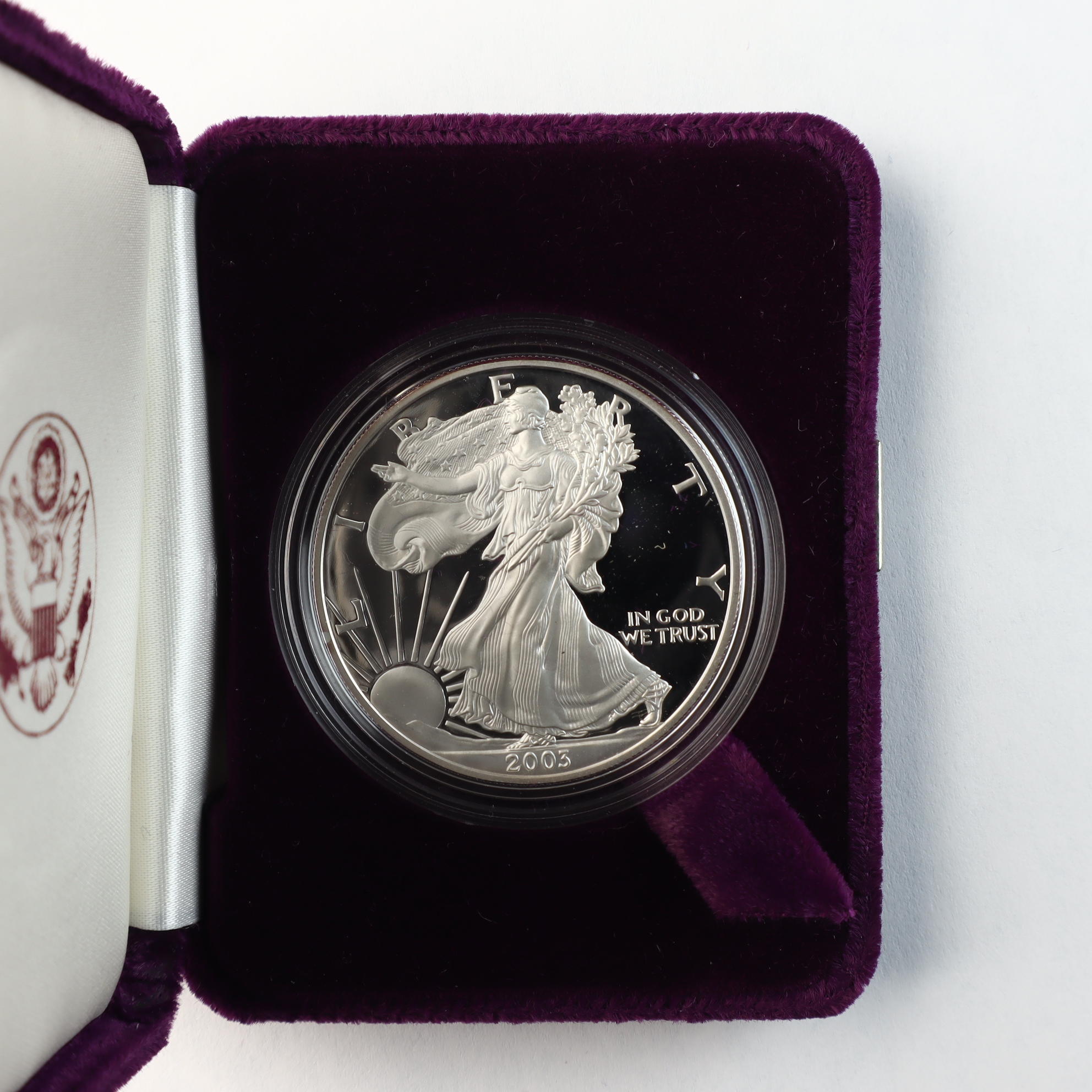 This United States Mint silver bullion coin is struck in one troy ounce of .999 fine silver. The coin features the Walking Liberty obverse and the Heraldic Eagle reverse. A W mint mark is located on the reverse, identifying the piece as a product of the West Point Mint. The coin exhibits a proof finish with frosted devices and deep mirrored fields. This lot includes the original clear plastic capsule, a purple velvet-lined presentation box with a silver-tone eagle emblem, the original outer sleeve, and the United States Mint Certificate of Authenticity.Weight: 31.103 gramsDiameter: 40.6 mm.