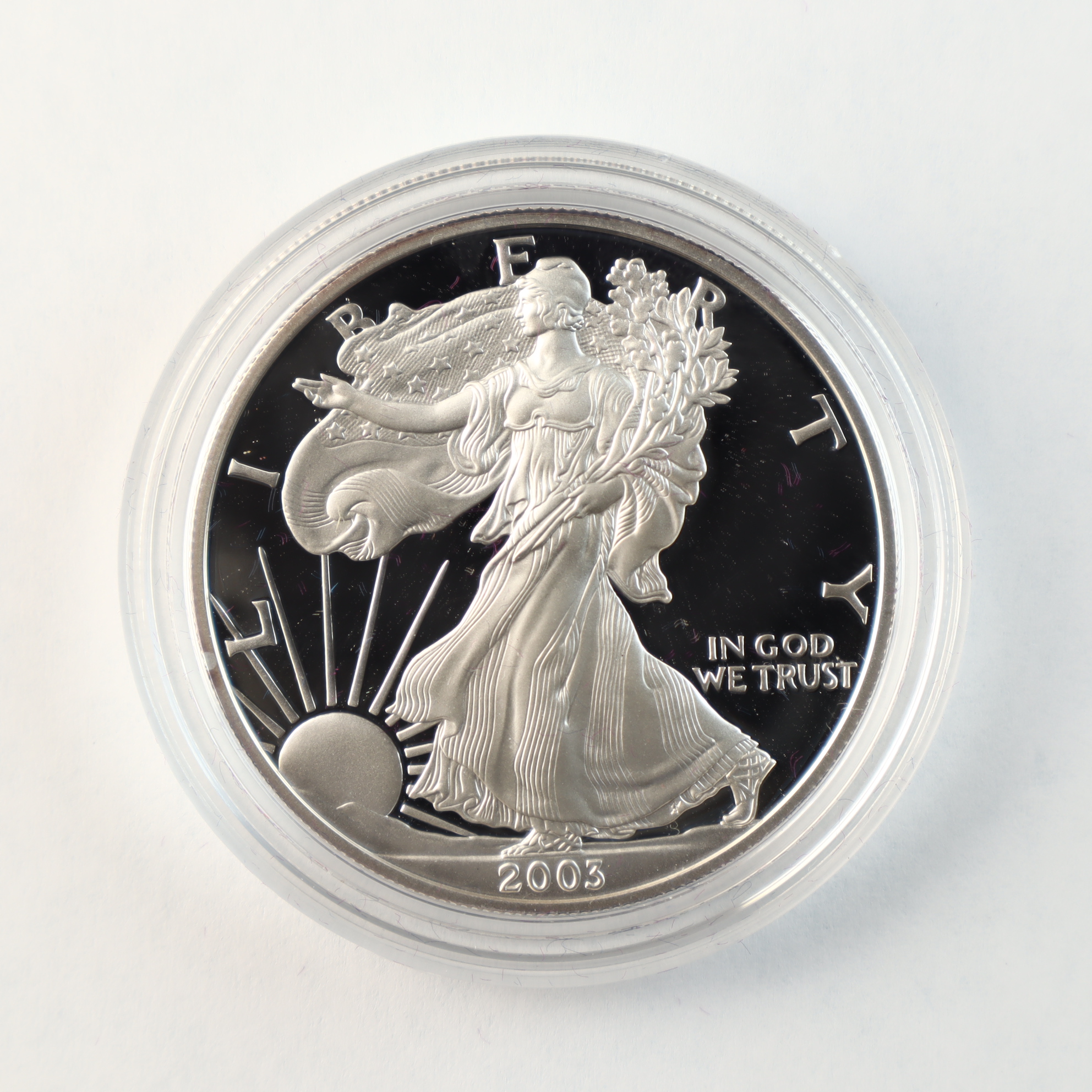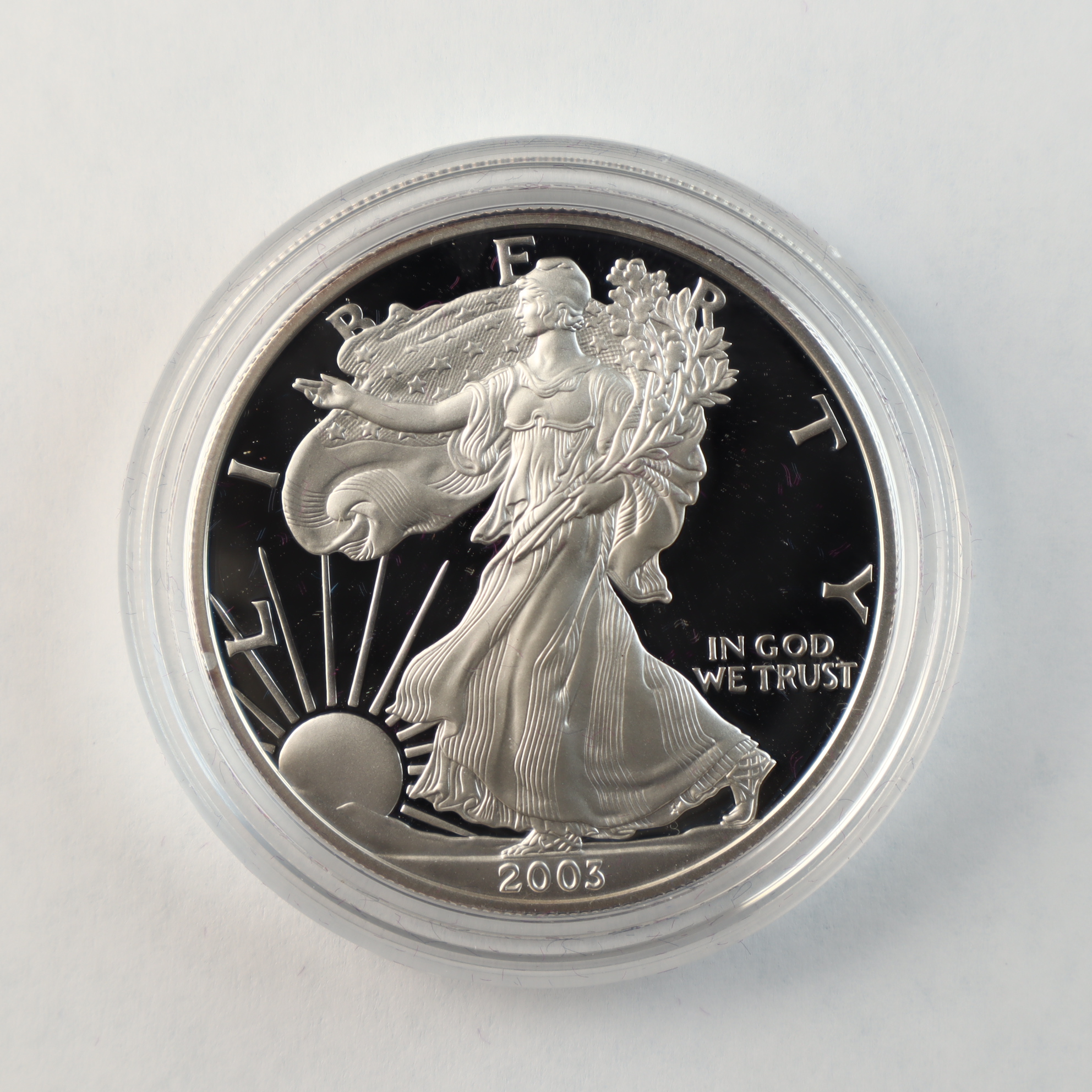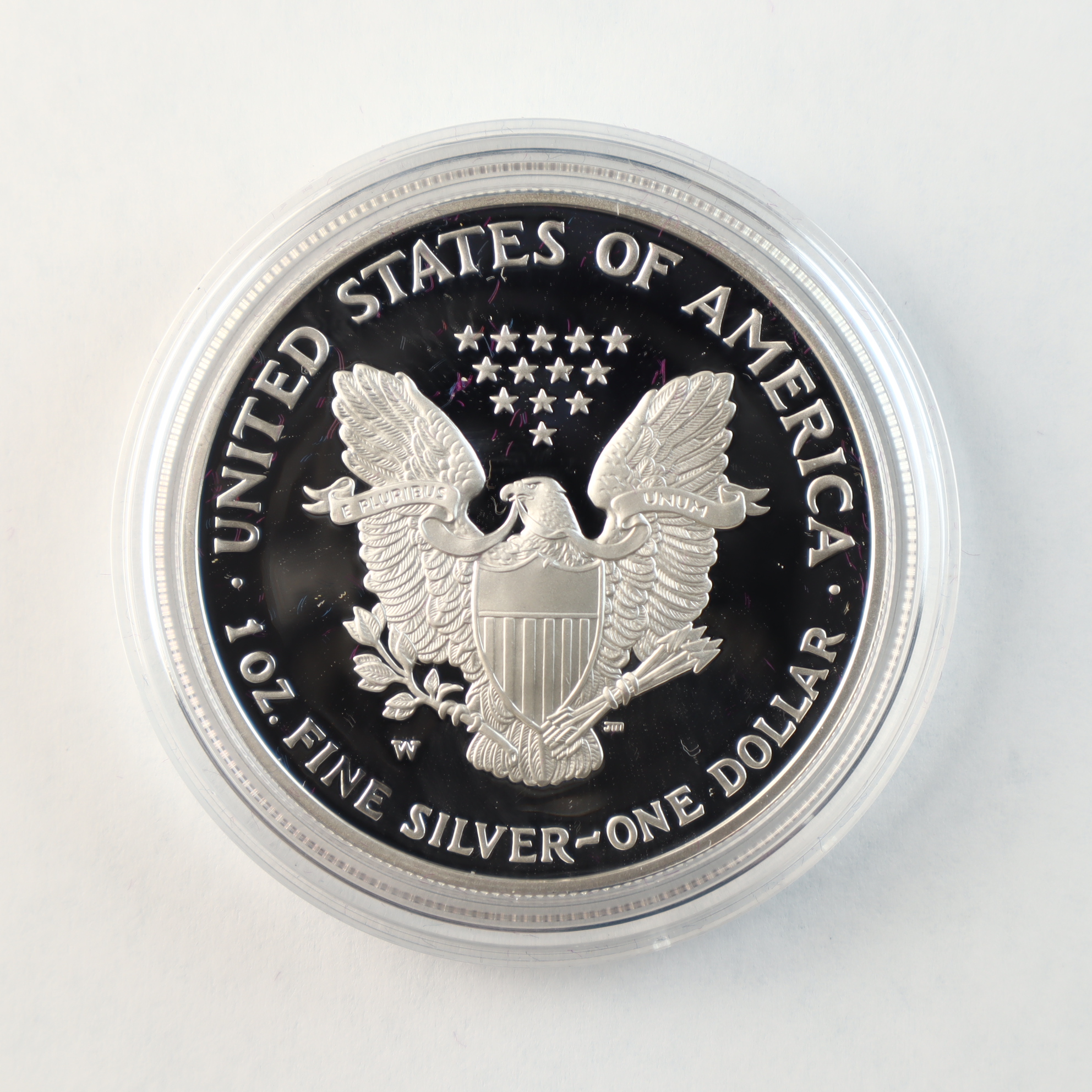 This United States Mint silver bullion coin is struck in one troy ounce of .999 fine silver. The coin features the Walking Liberty obverse and the Heraldic Eagle reverse. A W mint mark is located on the reverse, identifying the piece as a product of the West Point Mint. The coin exhibits a proof finish with frosted devices and deep mirrored fields. This lot includes the original clear plastic capsule, a purple velvet-lined presentation box with a silver-tone eagle emblem, the original outer sleeve, and the United States Mint Certificate of Authenticity.Weight: 31.103 gramsDiameter: 40.6 mm.