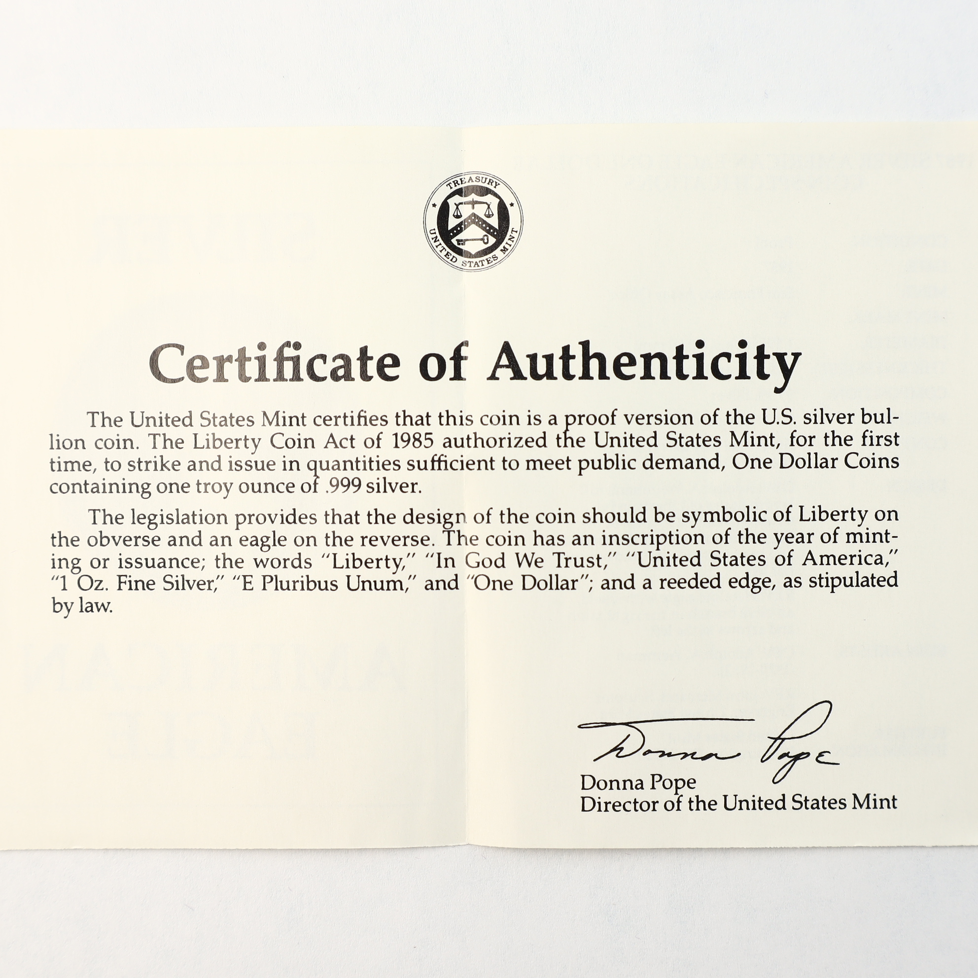 The coin is in uncirculated proof condition. No visible wear, contact marks, or toning are present on the surfaces. The original government packaging and documentation are intact and show minimal signs of handling.
