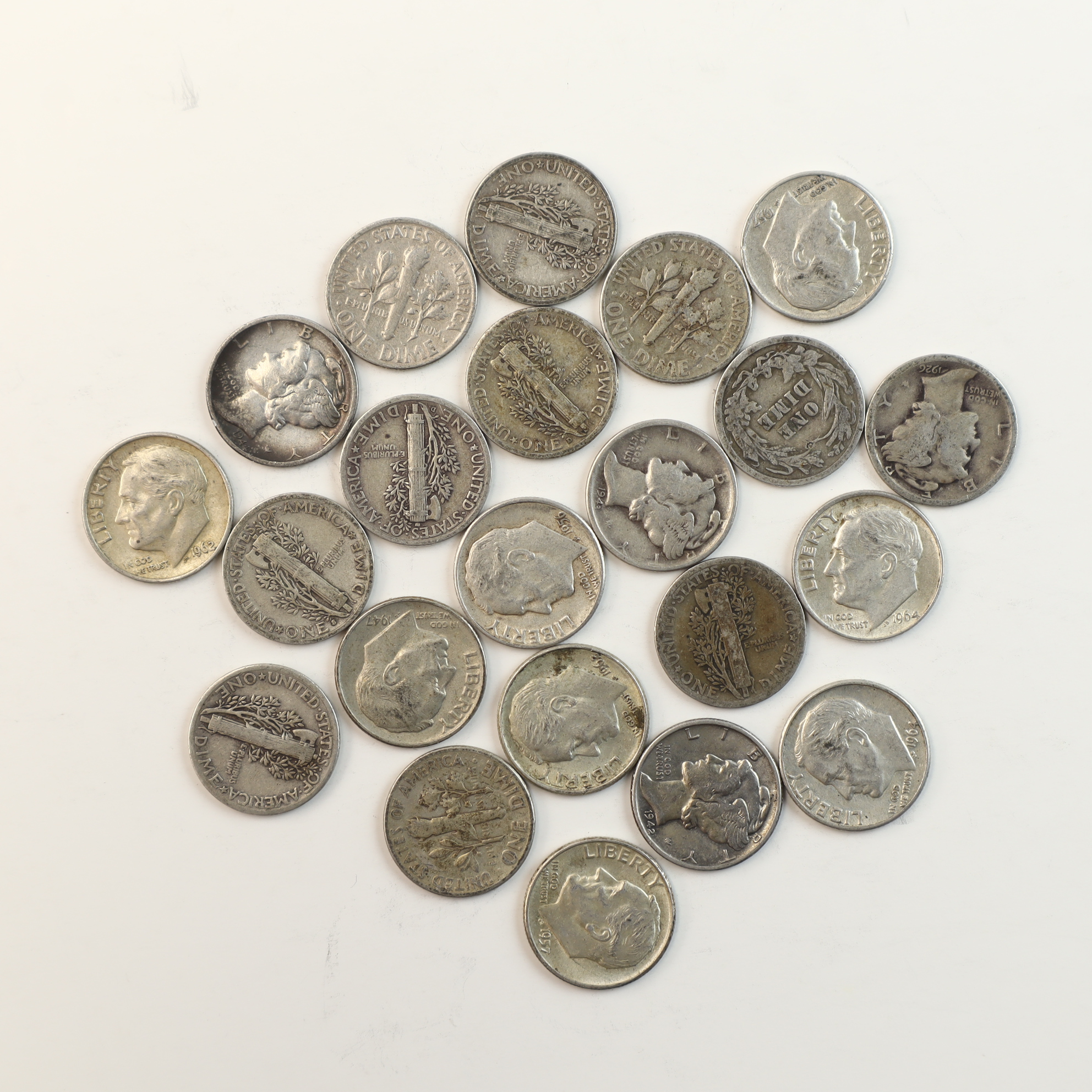 A collection of twenty-two US 90% silver dimes. The group includes Mercury (Winged Liberty Head) dimes, Roosevelt dimes, and one coin featuring a reverse wreath design characteristic of the Barber or Seated Liberty series. Visible dates for the Roosevelt series include 1947, 1954, 1956, 1957, 1962, and 1964. Visible dates for the Mercury series include 1926, 1942, and 1945. Mint marks are identifiable on some reverses, including D for the Denver Mint. Obverse designs feature the Mercury (Winged Liberty Head) and Roosevelt types. Reverse designs include the fasces with olive branch and the torch between olive and oak branches. All coins are inscribed with UNITED STATES OF AMERICA, ONE DIME, and E PLURIBUS UNUM. US dimes minted in 1964 and earlier contain 90 percent silver, after which the composition was changed to a copper-nickel clad.