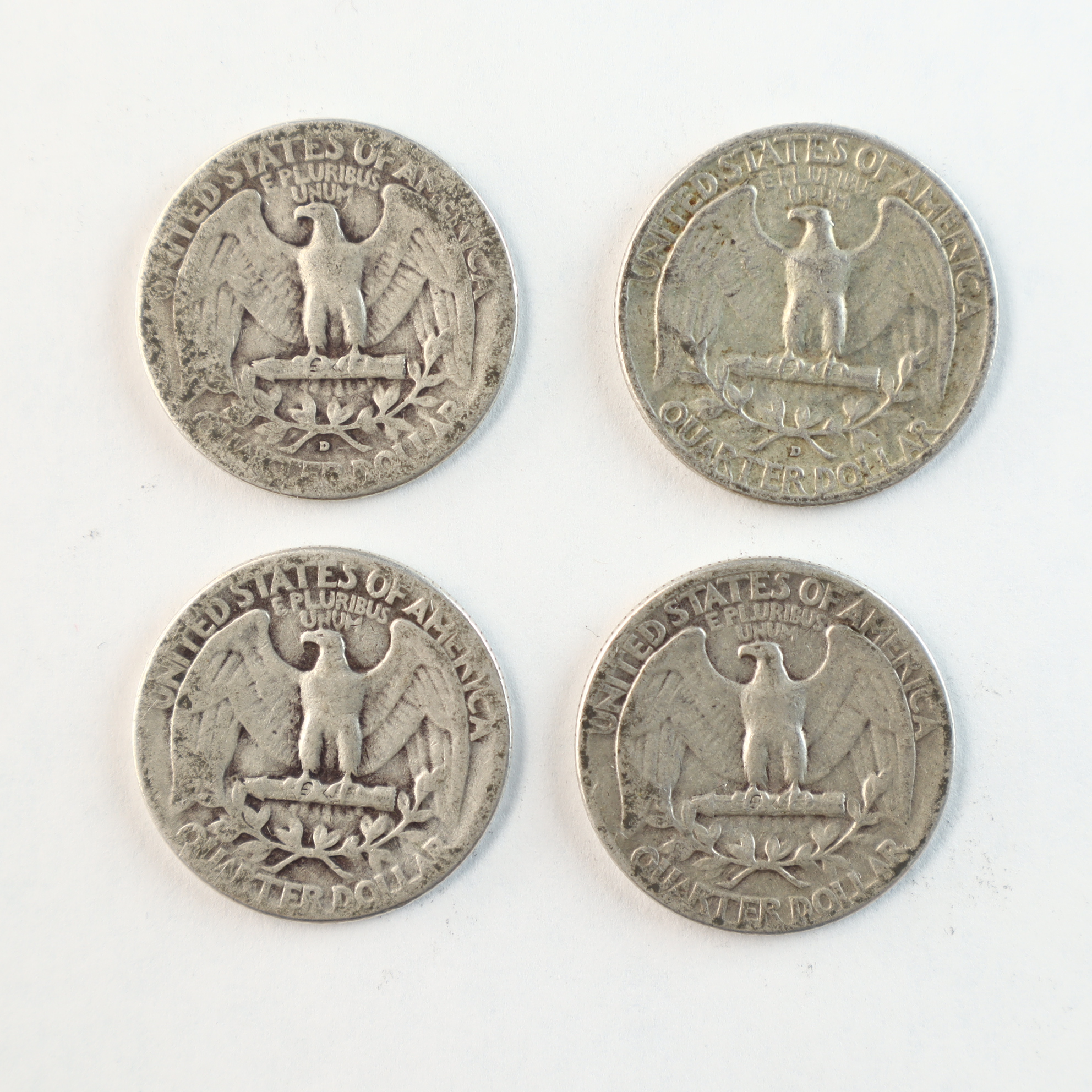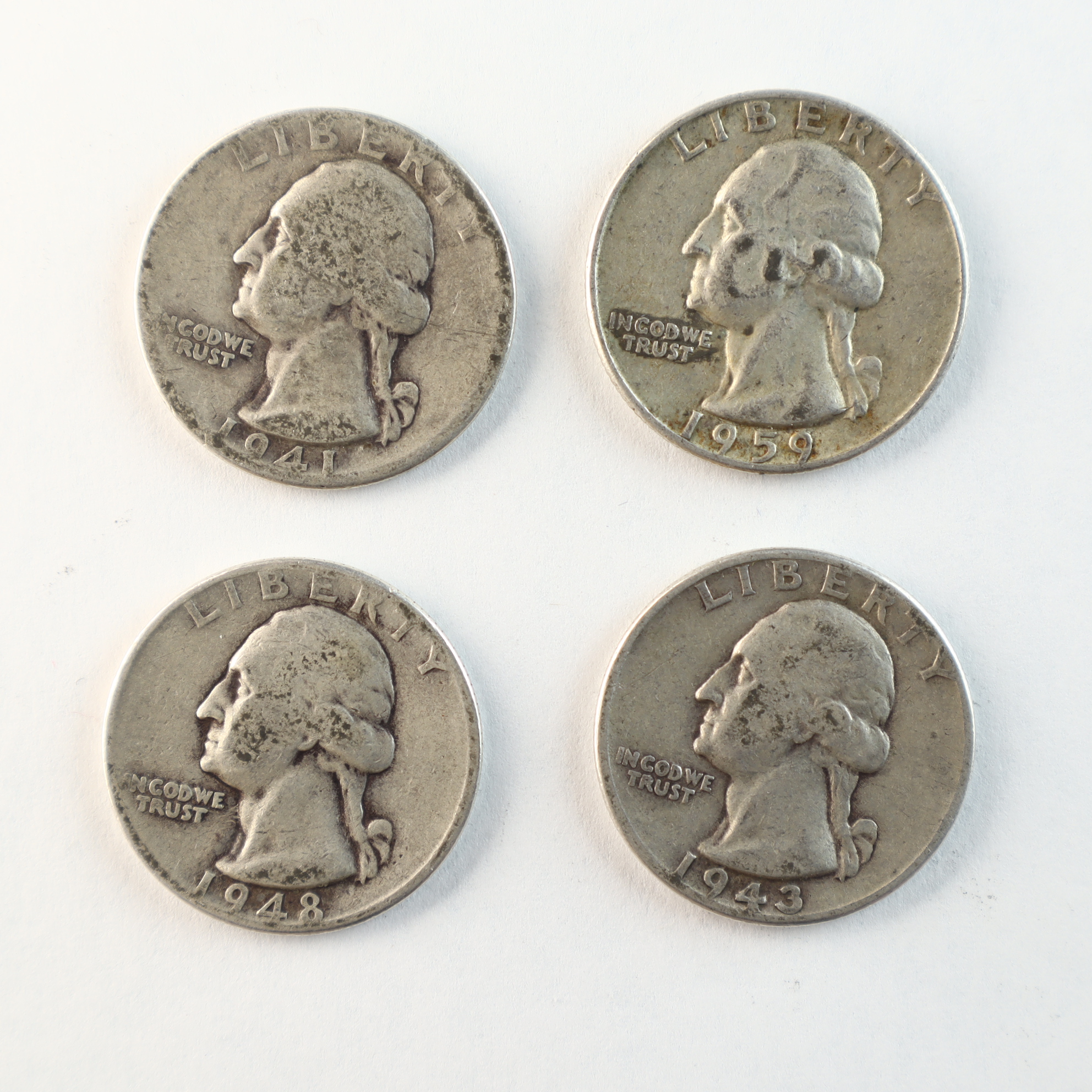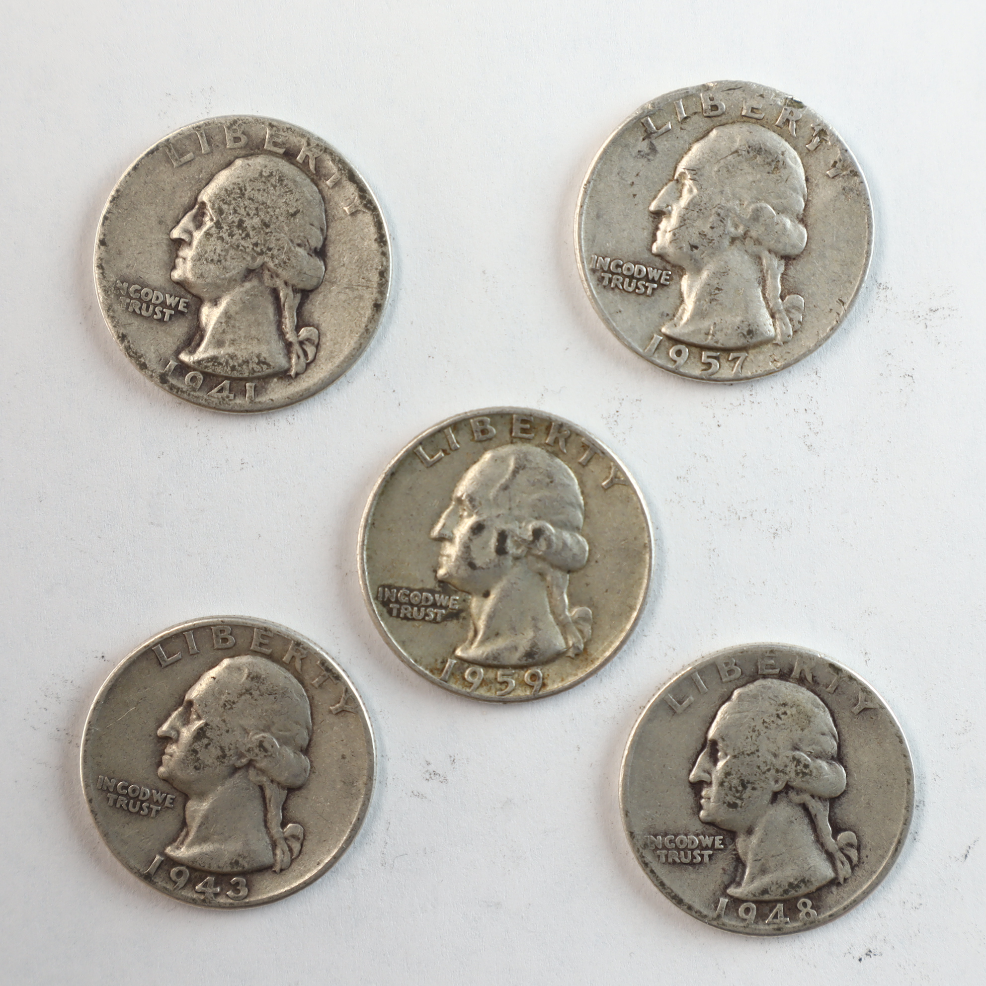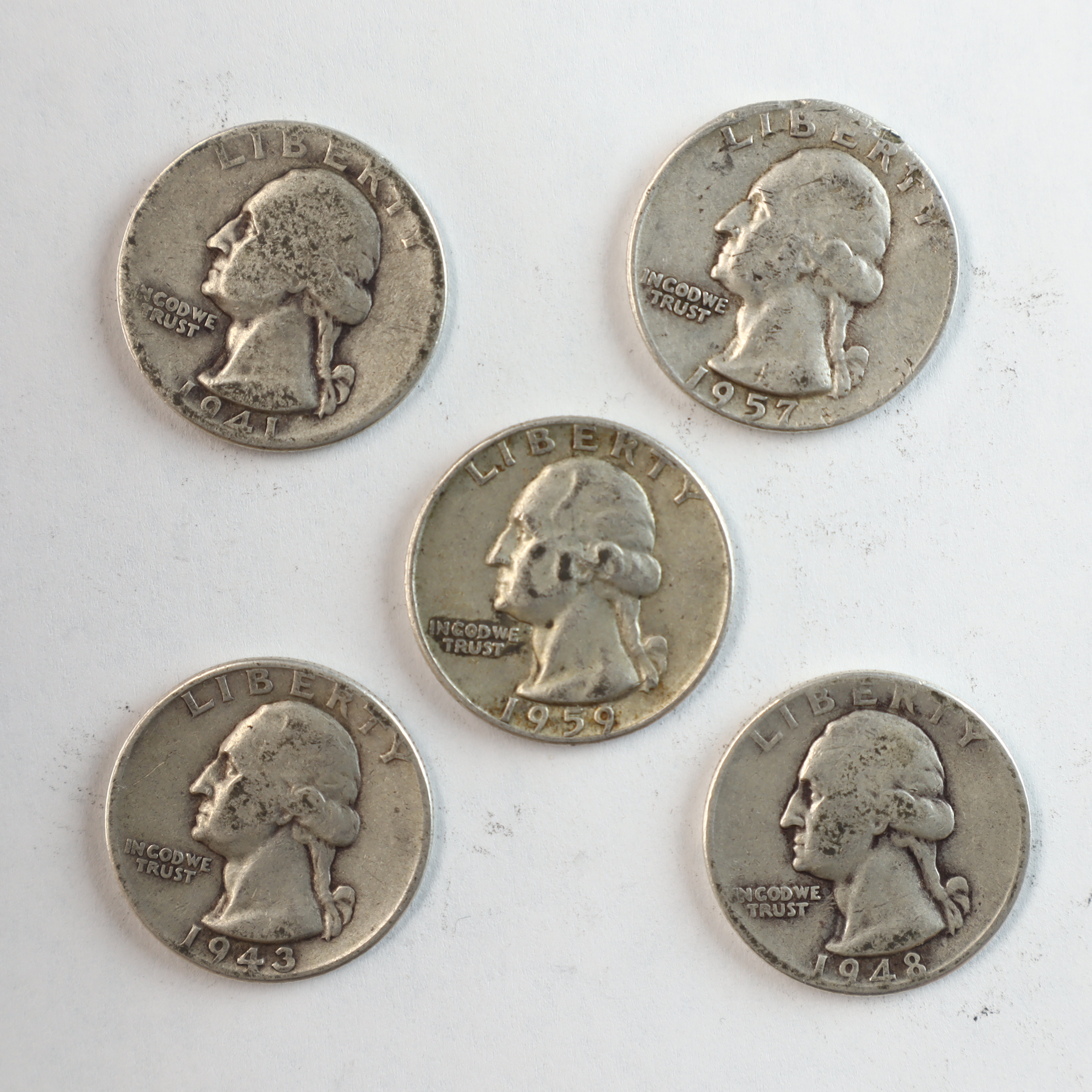 A group of US silver quarter dollars of the Washington design type, catalog reference KM# 164. The collection includes coins dated 1941, 1943, 1948, 1957, and 1959. Each specimen is composed of 90% silver and 10% copper. Denver mint marks (D) are visible on the reverse of the 1941, 1943, and 1959 specimens below the olive branches. The 1948 and 1957 specimens lack mint marks, indicating production at the Philadelphia Mint. These coins are representative of the silver coinage often marketed by the Littleton Coin Company. These coins were produced under the 90% silver standard used for US quarters prior to 1965.