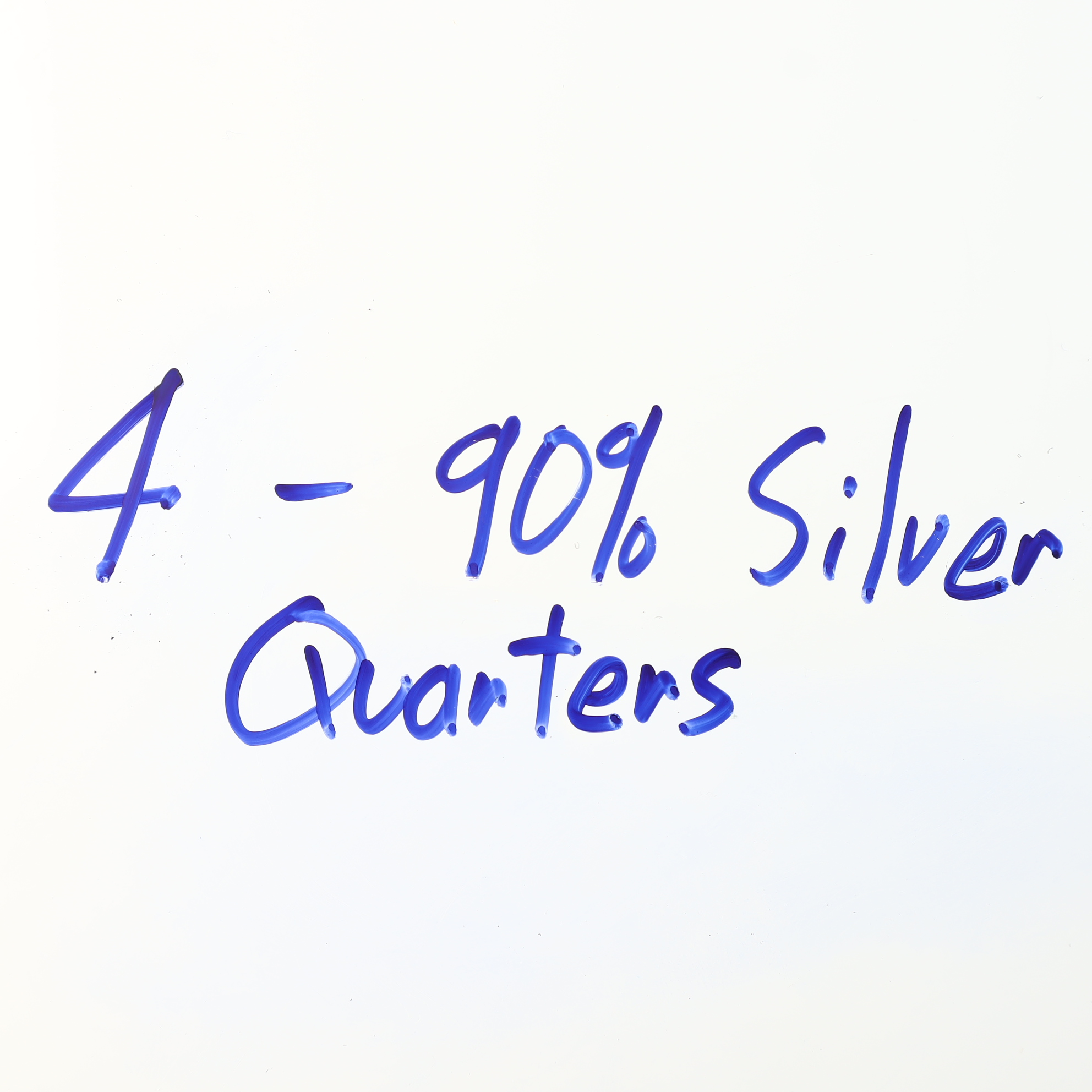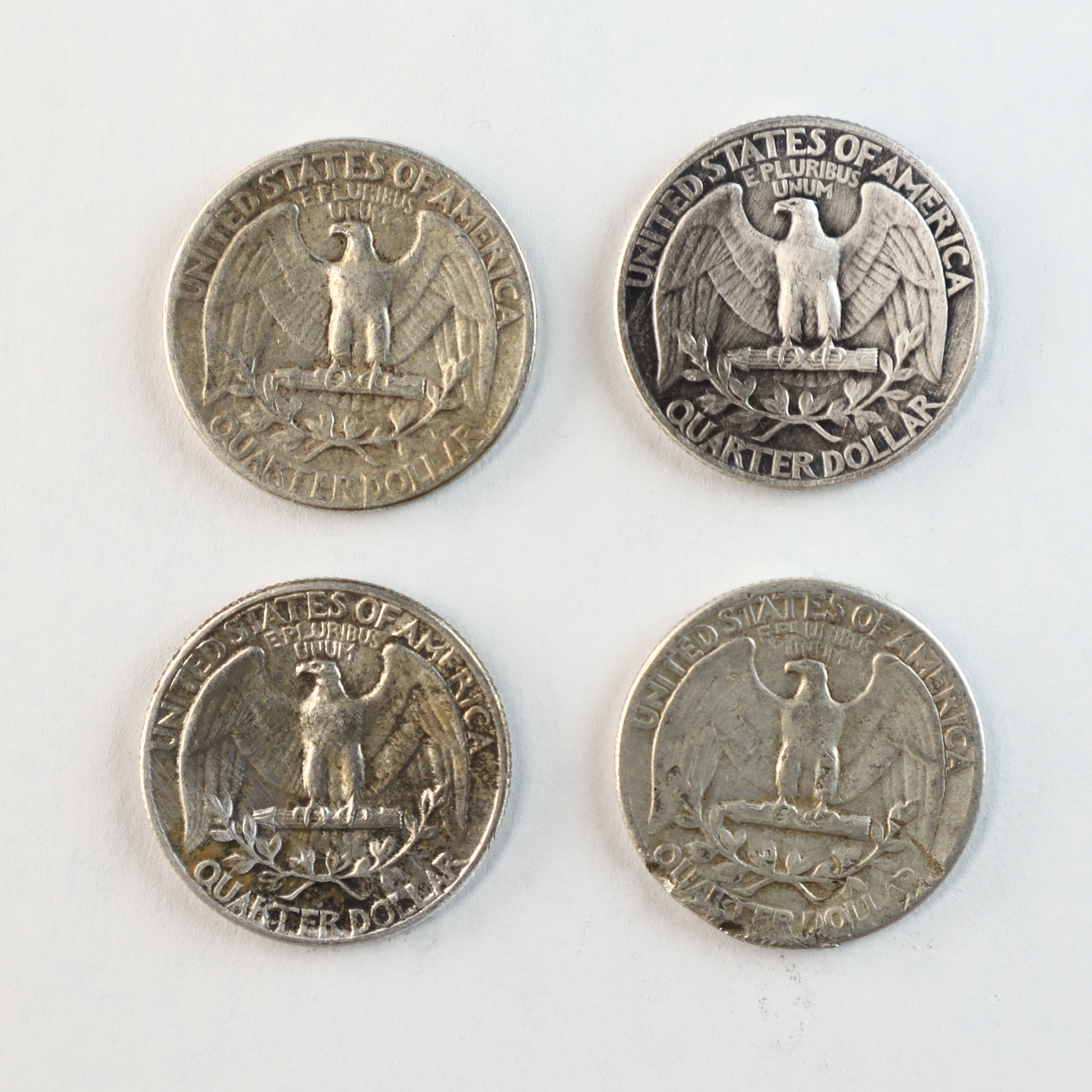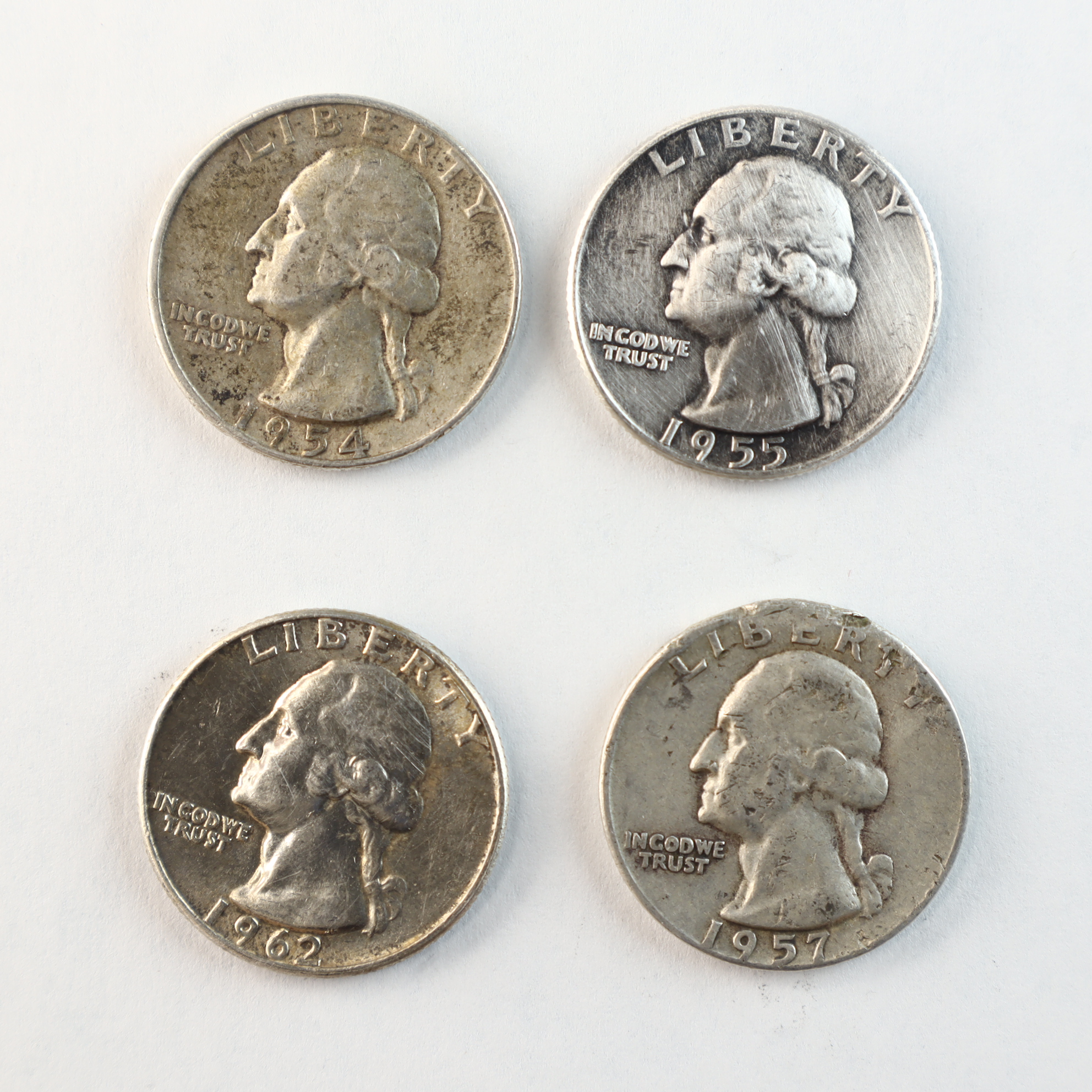 A group of four US Washington quarters struck in 90% silver (KM# 164). The lot includes issues from the Philadelphia Mint (1954, 1957) and the Denver Mint (1955-D, 1962-D). Each coin features the Washington obverse and Eagle reverse design types. Inscriptions include LIBERTY, IN GOD WE TRUST, UNITED STATES OF AMERICA, E PLURIBUS UNUM, and the denomination QUARTER DOLLAR. These specimens represent standard circulation strikes from the mid-20th century.