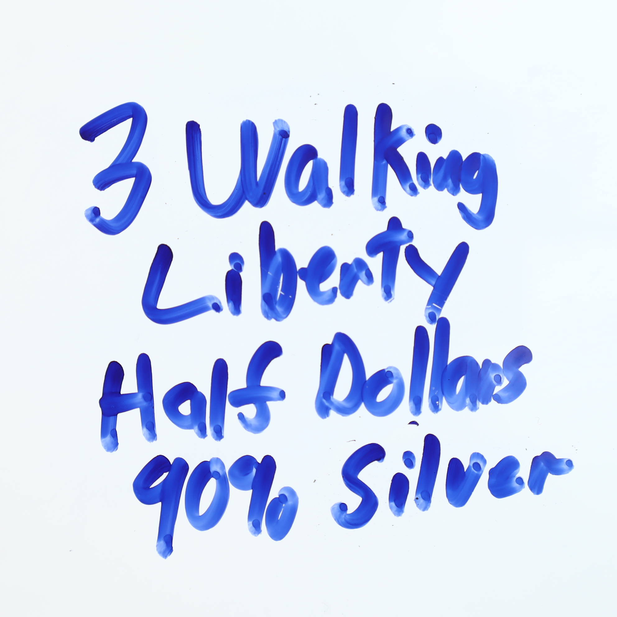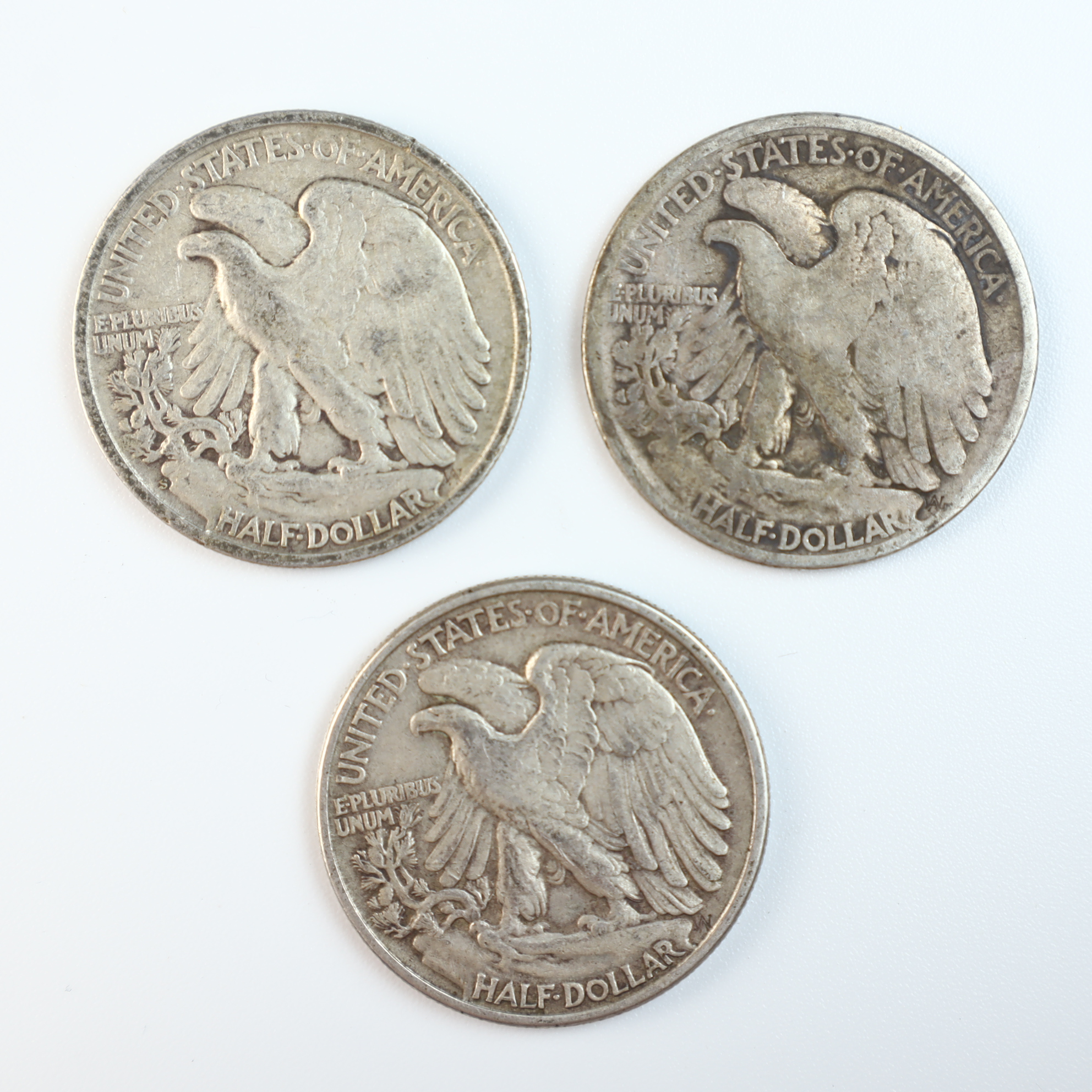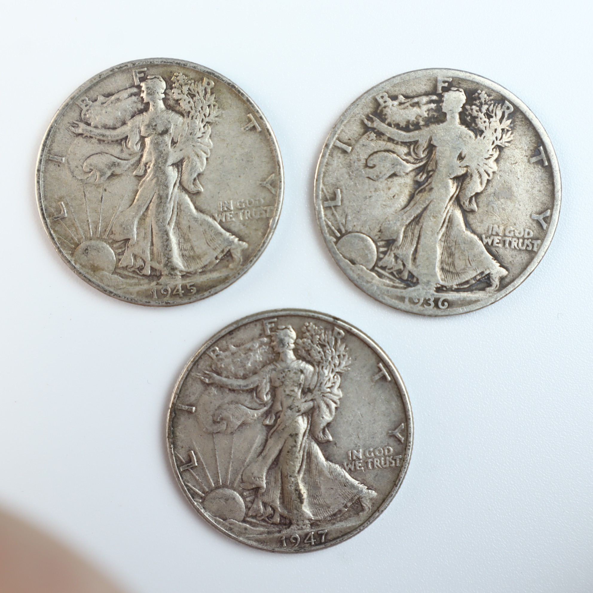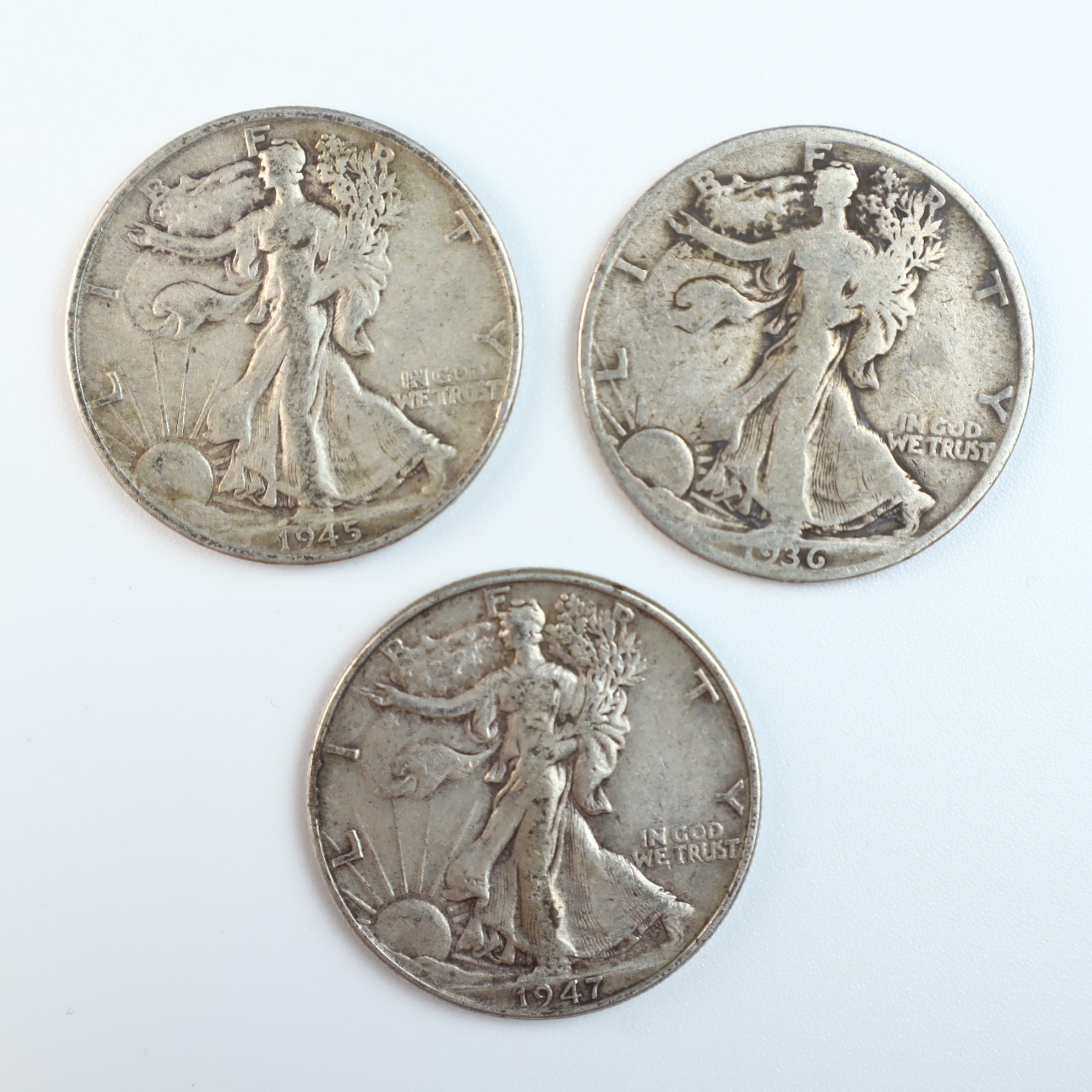 Three US Walking Liberty half dollars composed of 90% silver (KM# 142). The group includes one 1936 Philadelphia mint issue, one 1945-S San Francisco mint issue, and one 1947 Philadelphia mint issue. The 1945-S coin displays the S mint mark on the reverse. The coins feature the Walking Liberty obverse and the eagle reverse. The 1947 issue represents the final year of production for this series.