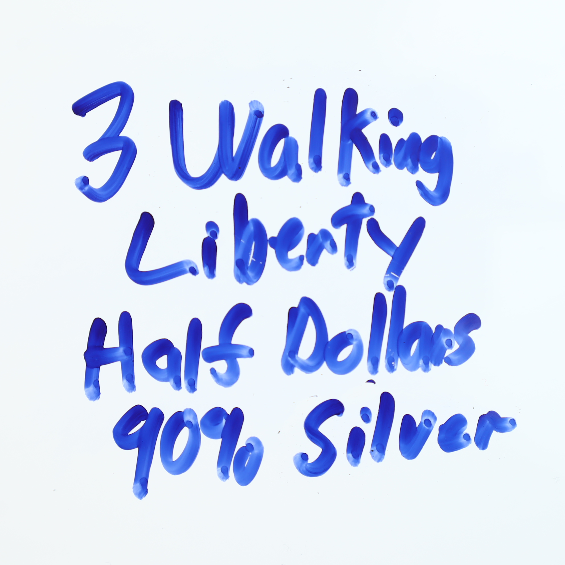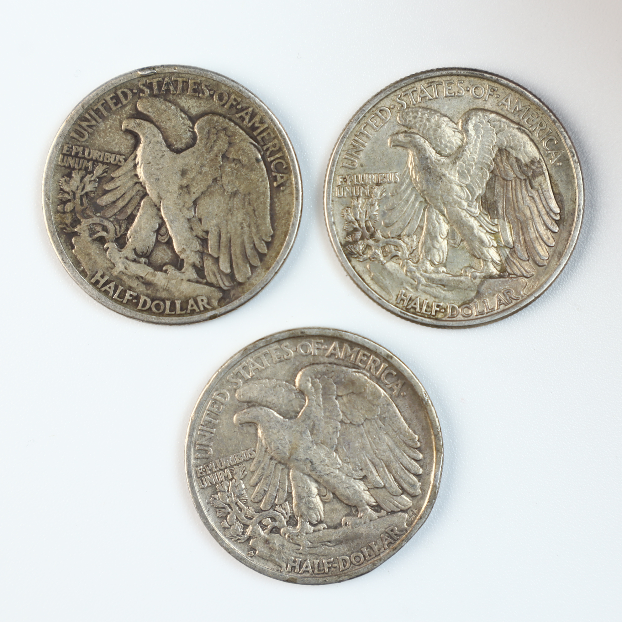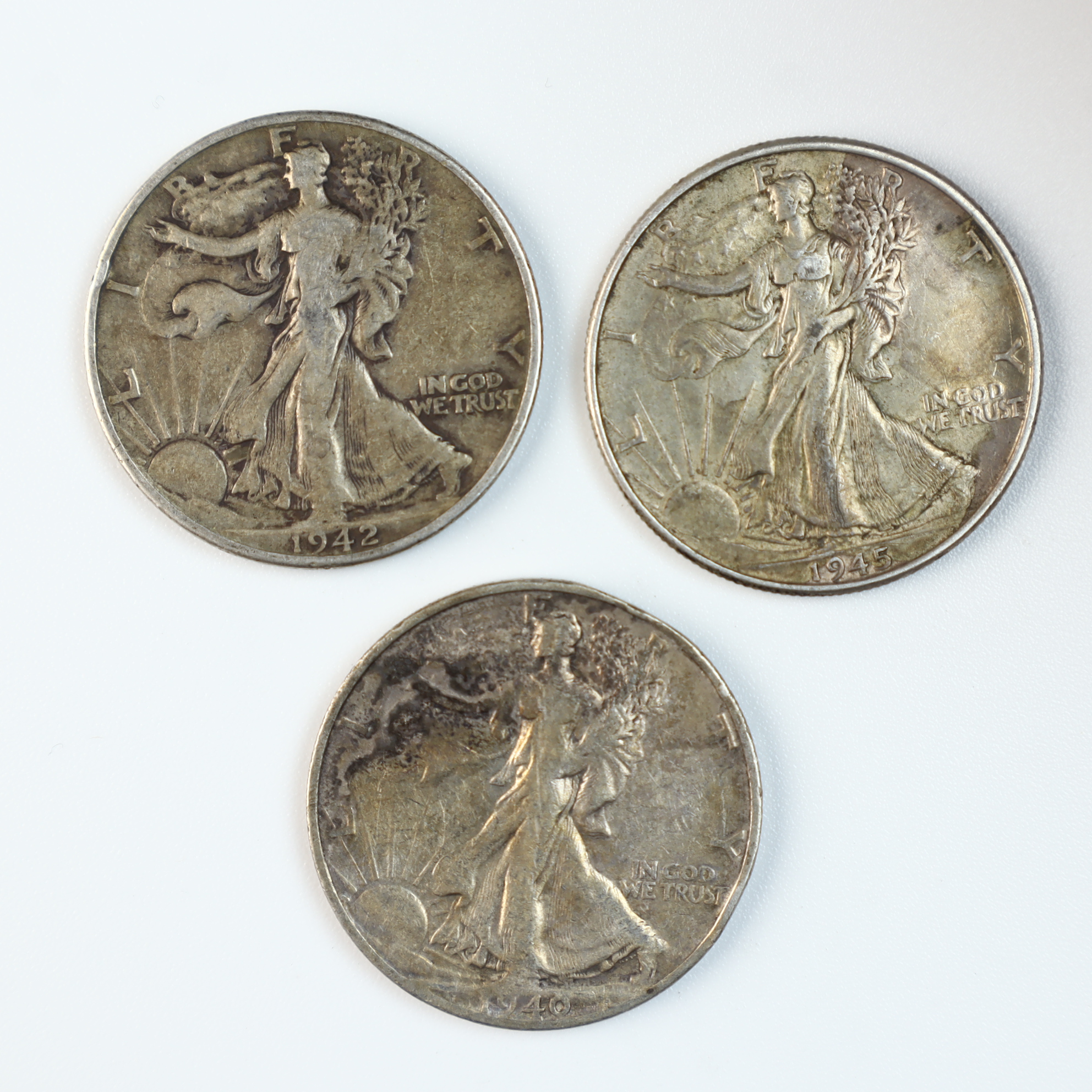 Three US Walking Liberty half dollars dated 1940, 1942, and 1945. These coins are struck in 90% silver. The obverse features the Walking Liberty design and the reverse features the eagle design. Inscriptions on the obverse include LIBERTY and IN GOD WE TRUST. Inscriptions on the reverse include UNITED STATES OF AMERICA, E PLURIBUS UNUM, and HALF DOLLAR. No mint marks are visible on the reverse of these specimens, identifying them as products of the Philadelphia Mint. The Walking Liberty series was designed by Adolph A. Weinman and issued by the US Mint from 1916 to 1947.Metal Composition: 90% SilverFineness: 0.900.