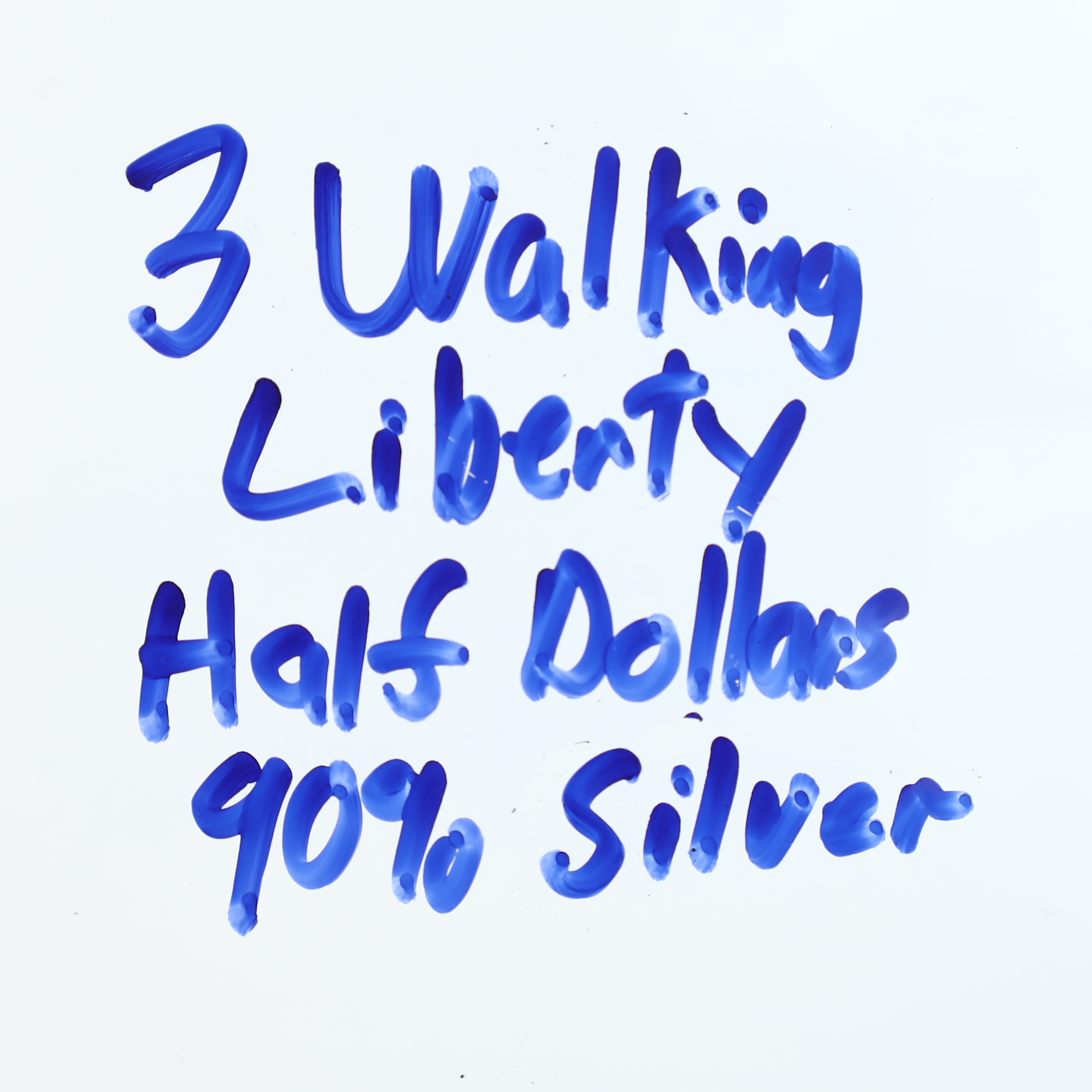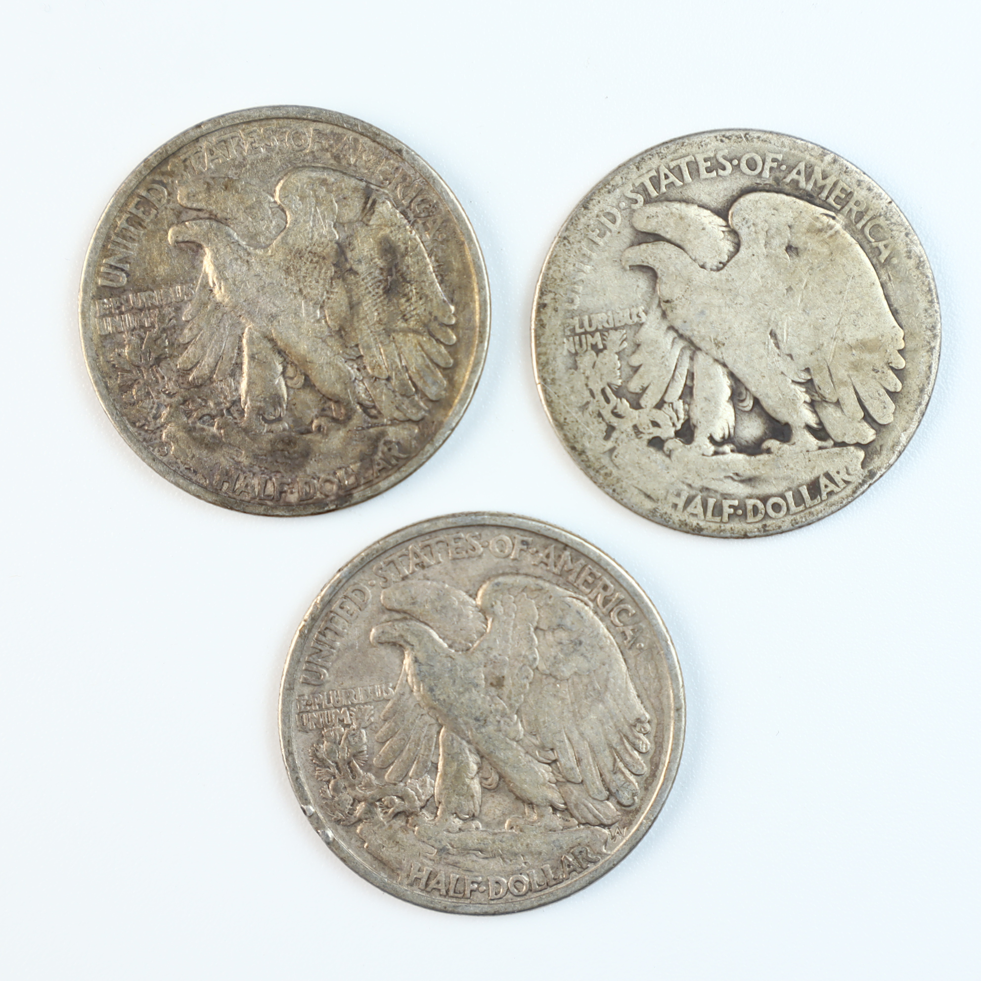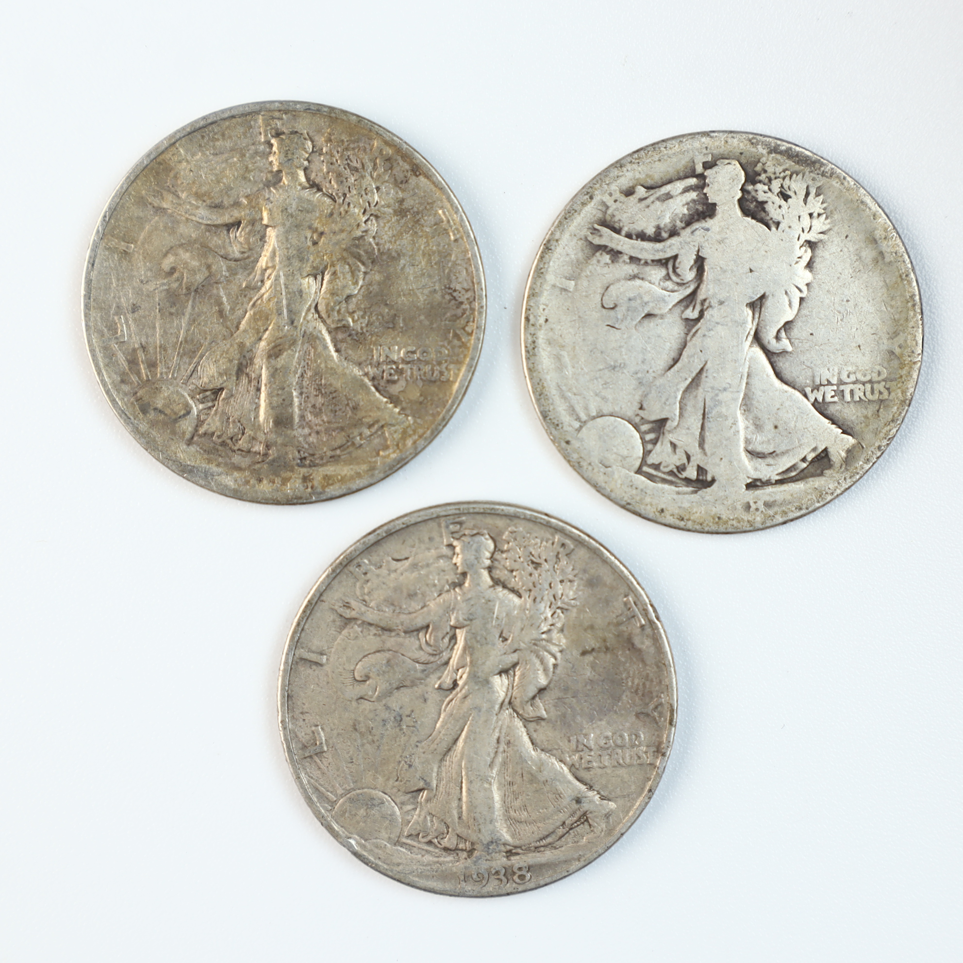 Three US Walking Liberty half dollars struck in 90% silver. One coin is dated 1938, while the remaining two have illegible dates. The coins feature the Walking Liberty obverse and the eagle reverse design. Markings include LIBERTY around the top rim and IN GOD WE TRUST in the right field on the obverse, with UNITED STATES OF AMERICA, E PLURIBUS UNUM, and HALF DOLLAR on the reverse. No mint marks are visible on the reverses. The 1938 date represents a lower mintage year for the series.