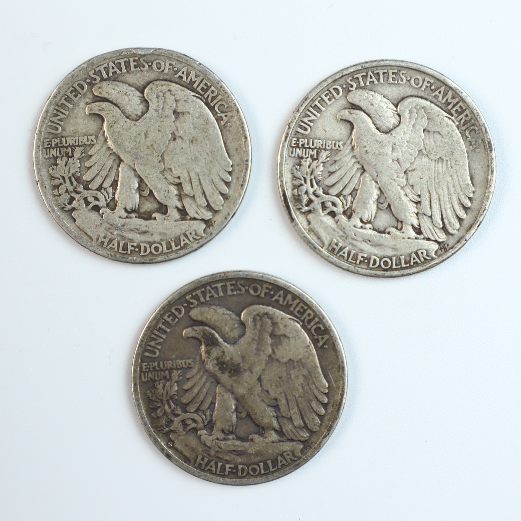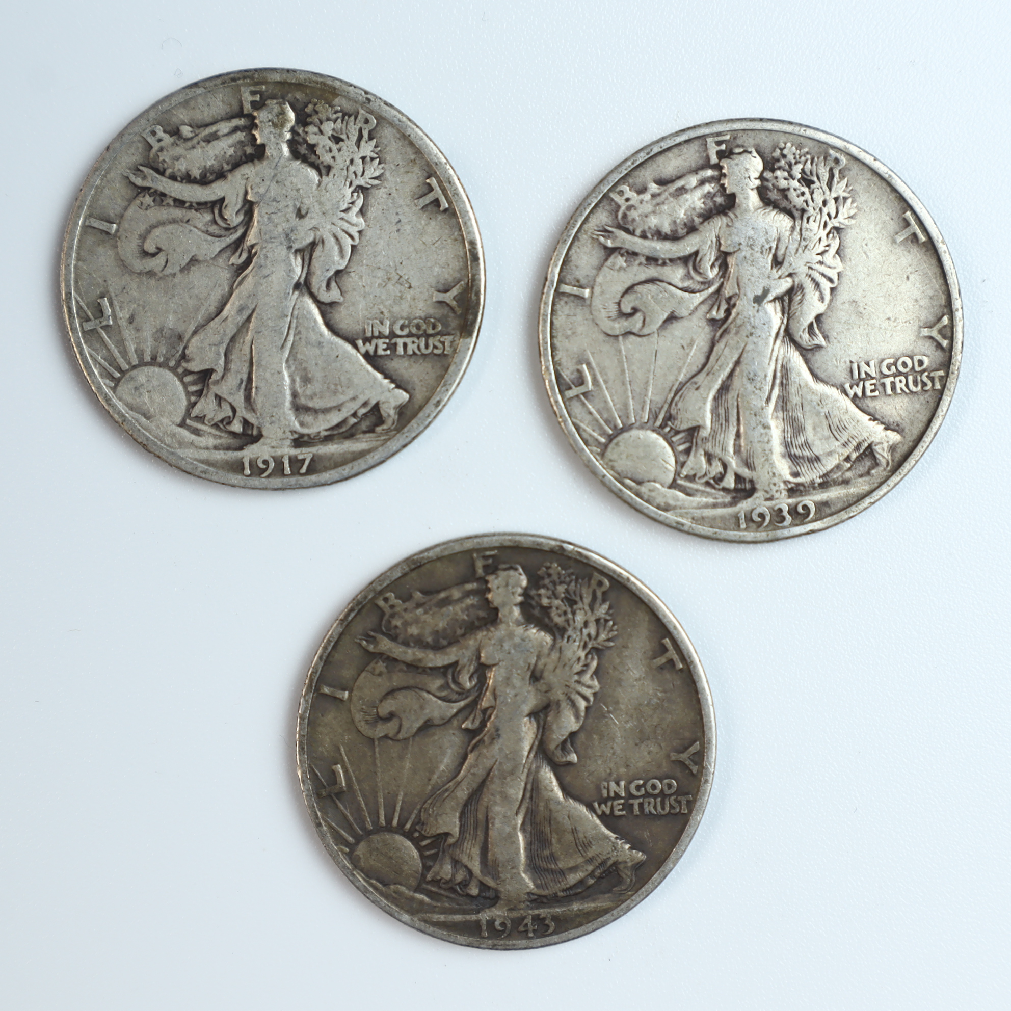 This lot consists of three US Walking Liberty half dollars struck in 90% silver. The group includes one 1917-S, one 1939-D, and one 1943-S. The 1917 and 1943 examples bear the S mint mark for the San Francisco Mint on the reverse. The 1939 example bears the D mint mark for the Denver Mint on the reverse. All coins have reeded edges.