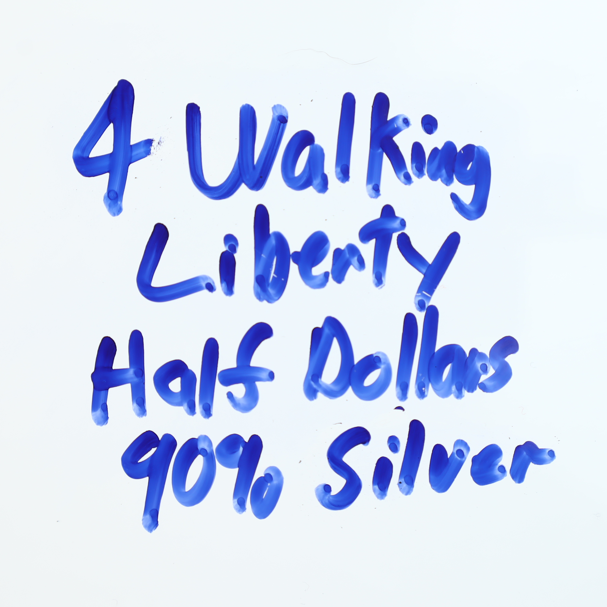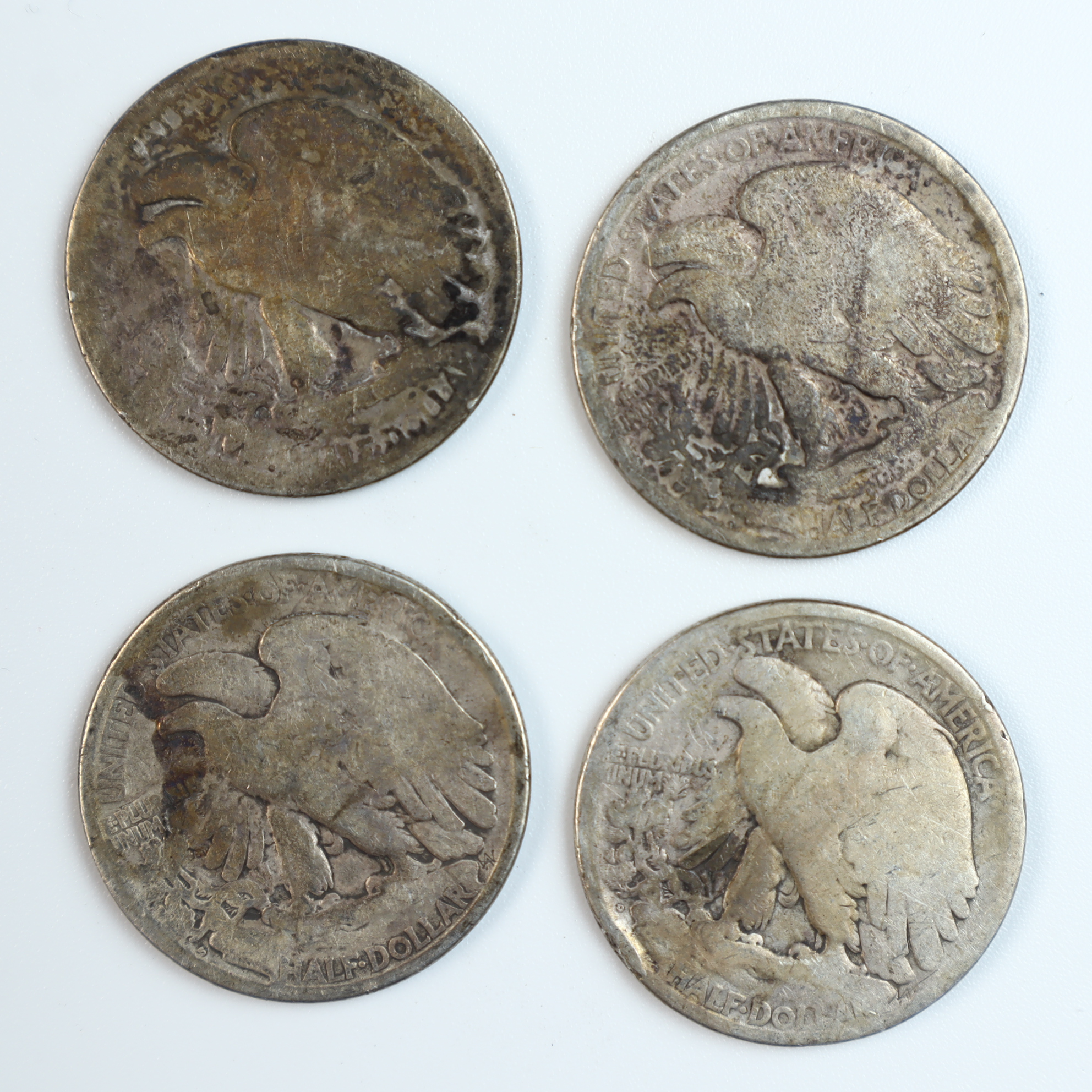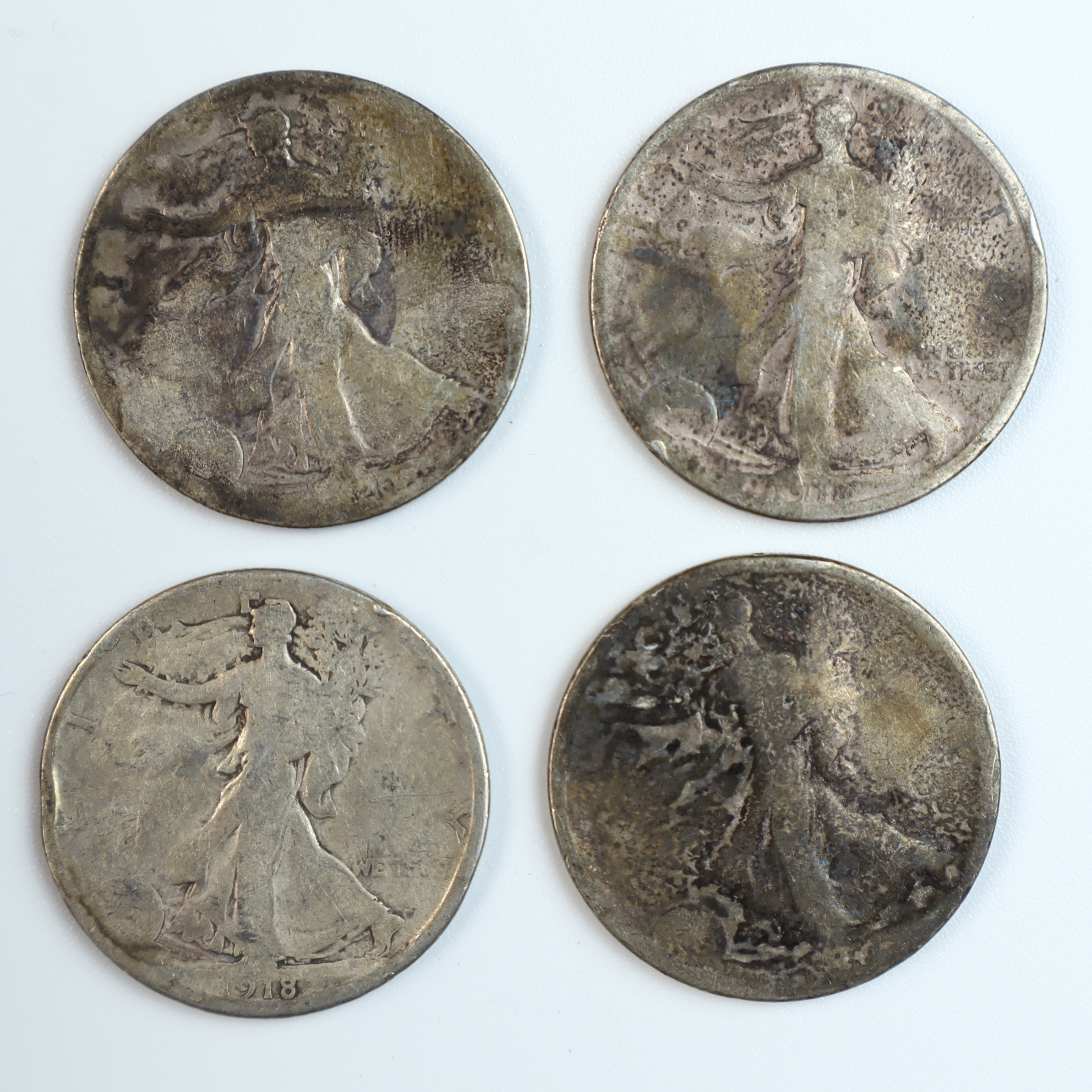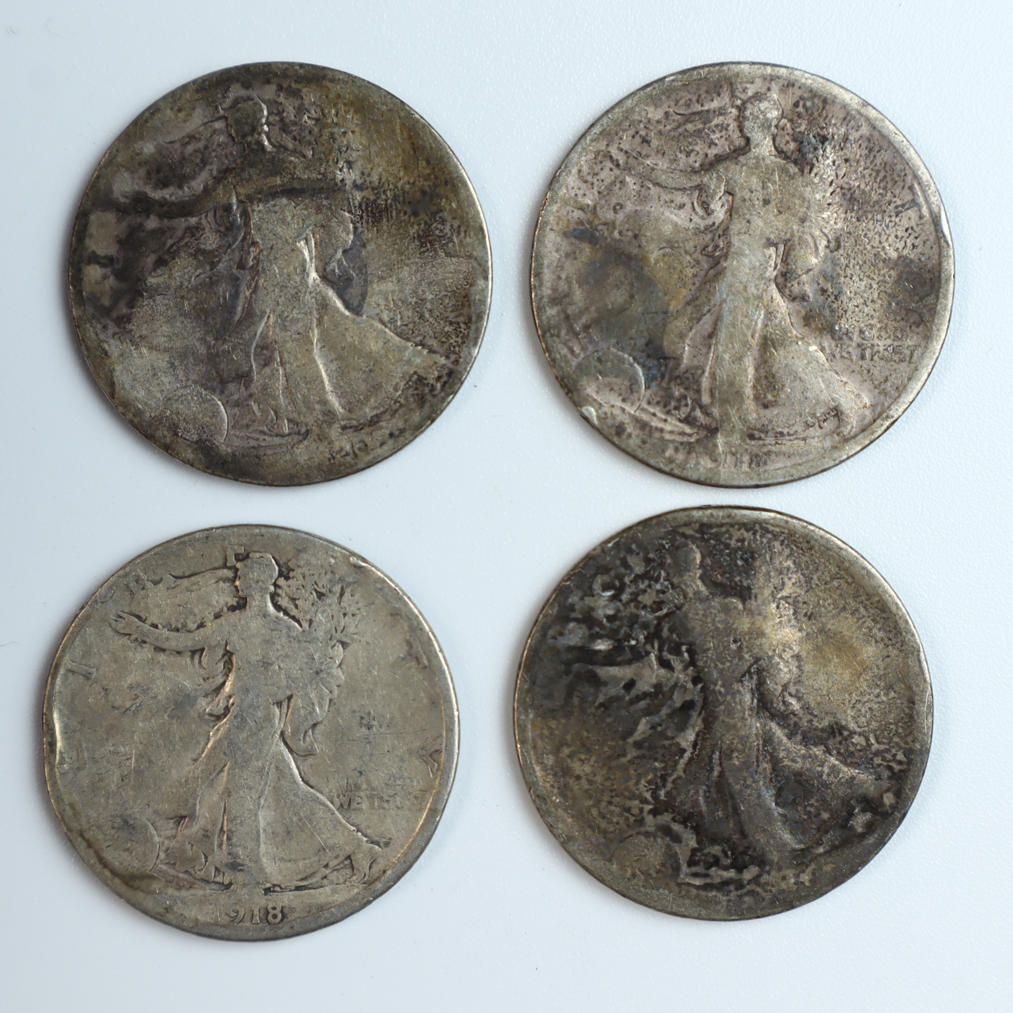 A group of four US Walking Liberty half dollars composed of 90% silver. The collection includes one coin dated 1917, two coins dated 1918, and one coin from the 1940s with a partially obscured final digit. The coins feature the Walking Liberty obverse and the eagle on mountain crag reverse. No mint marks are visible. These coins are uncertified and presented in raw condition.