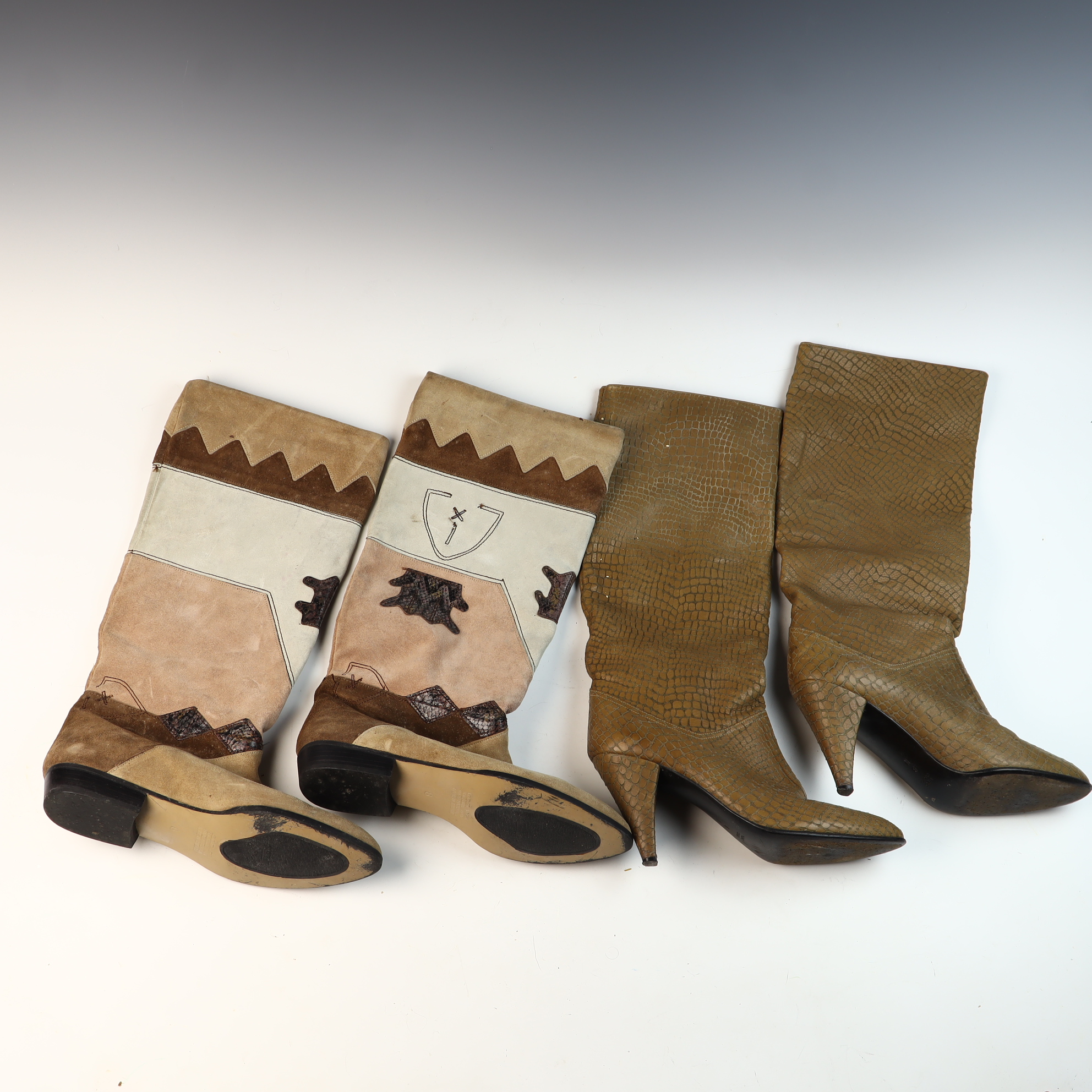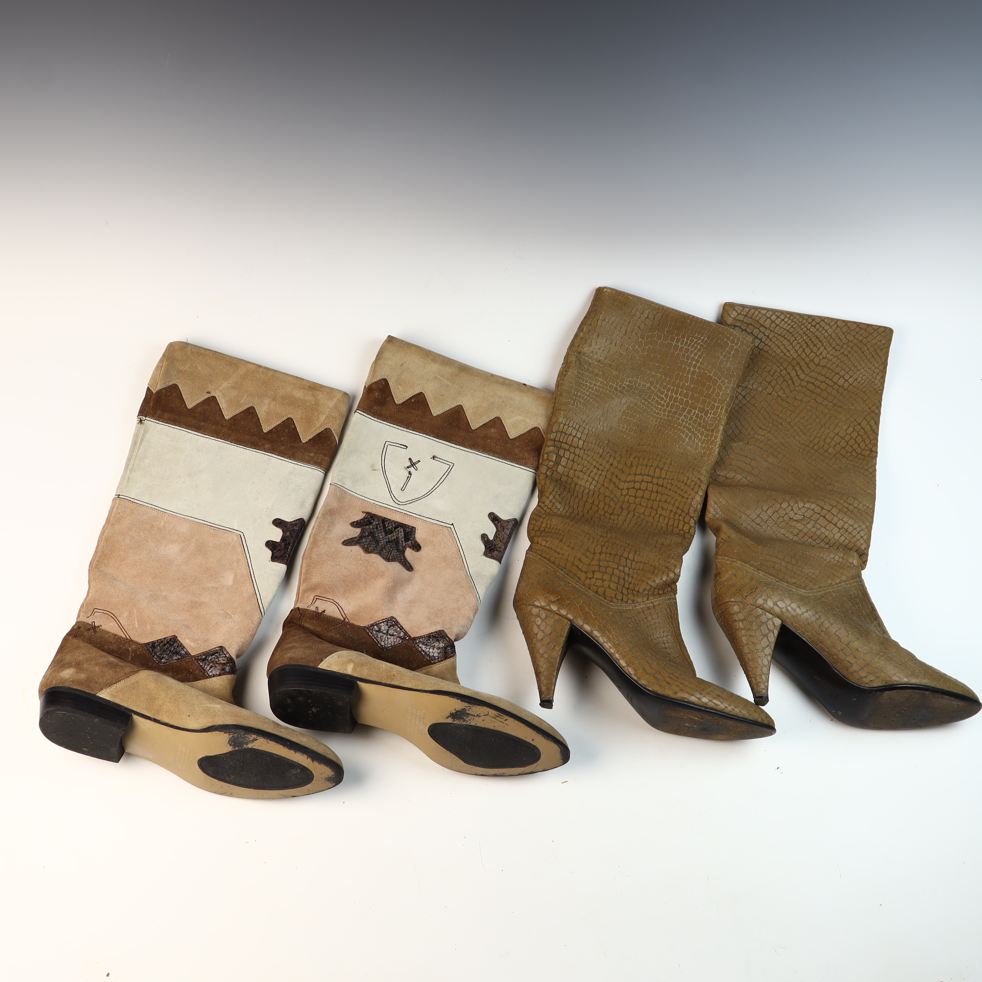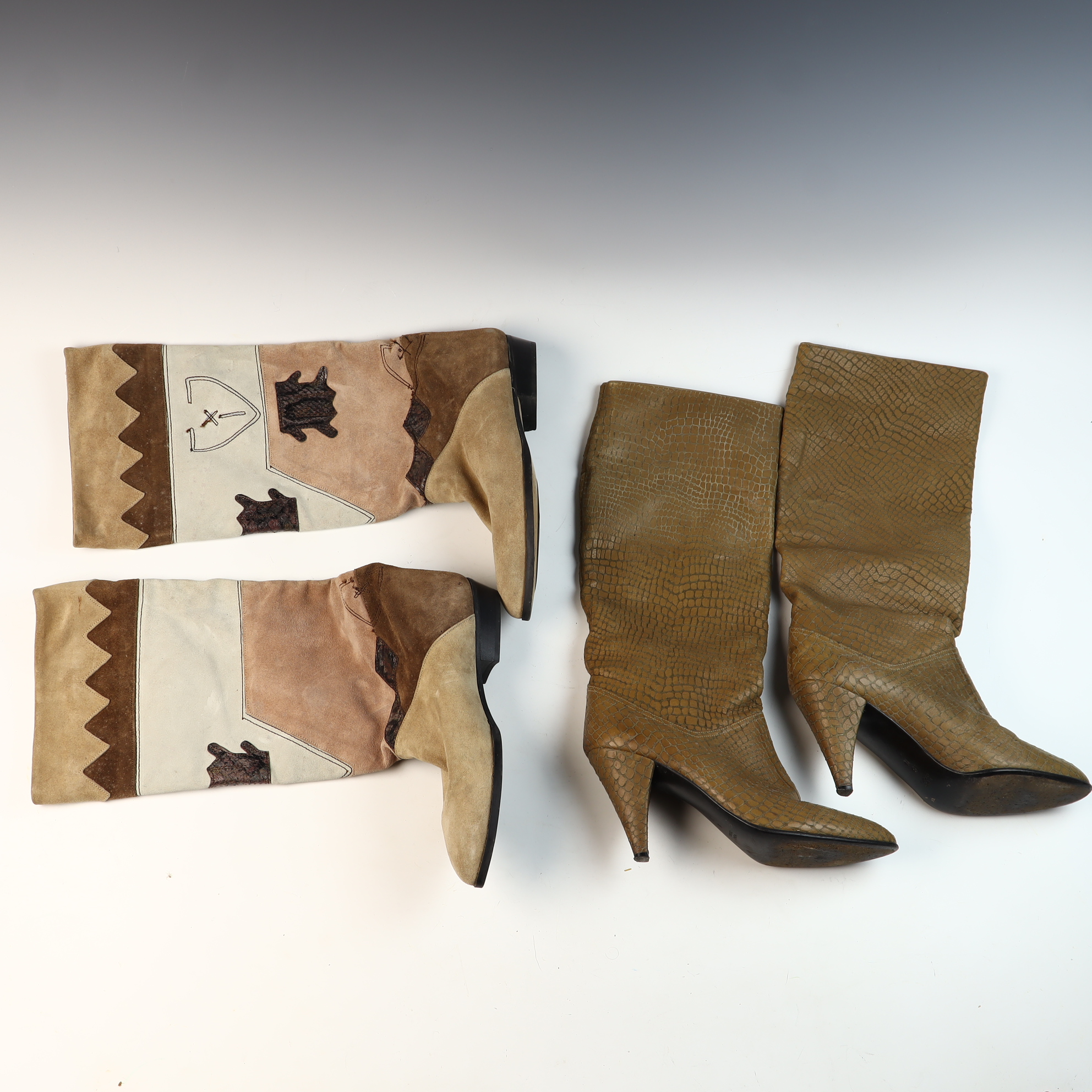 This lot features two pairs of vintage women’s boots of Italian manufacture. The first pair is a mid-calf to knee-high pull-on style characterized by a Southwestern-inspired aesthetic. The uppers are constructed from a patchwork of suede and leather in earth tones including tan, chocolate brown, beige, and cream, featuring jagged-edge overlays and embossed reptile-patterned accents. The soles are leather with rubber traction pads at the forefoot and a small stacked heel. The second pair consists of mid-calf slouch boots in olive green croc-embossed leather. These boots feature a pointed toe and a tall cone-shaped heel with a smooth-finished sole. Both pairs are marked with the number 8 and Made in Italy on the soles.Heel height pair one: Approximately 1 inchHeel height pair two: Approximately 3.25 inches.