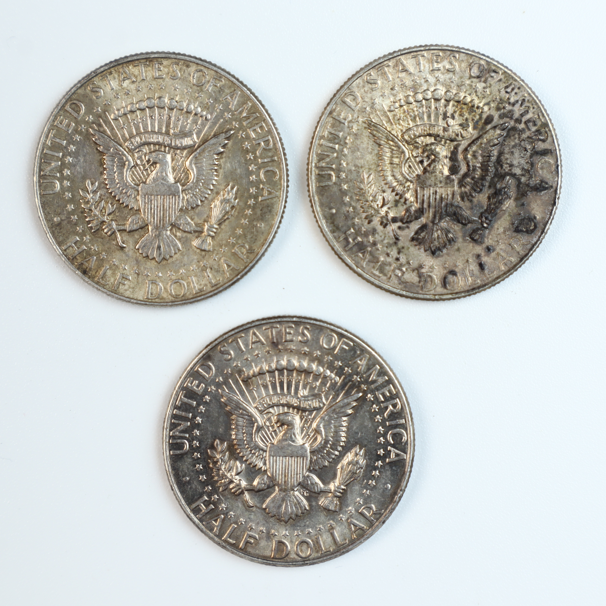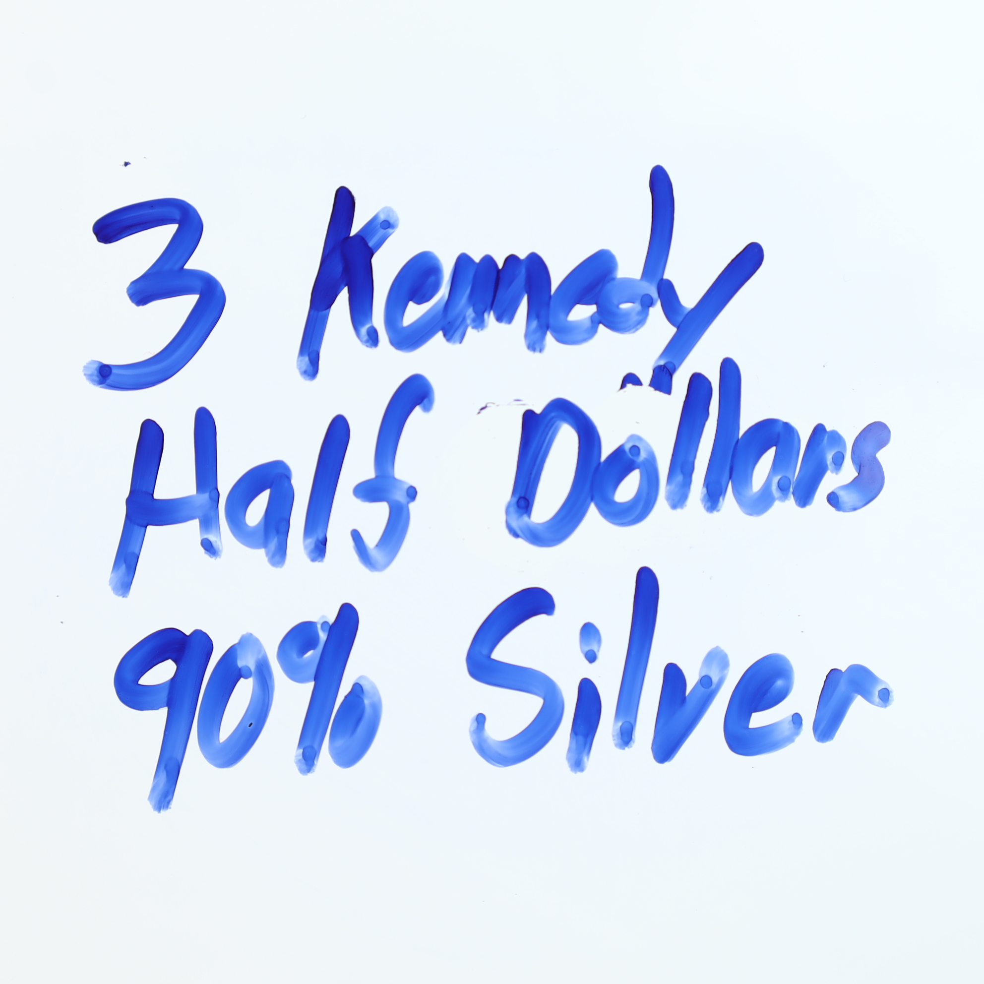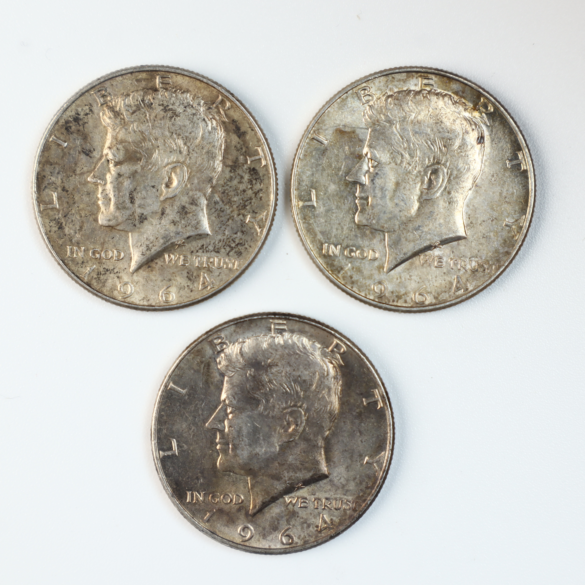 Three US Kennedy half dollars dated 1964. These coins are composed of 90 percent silver. The obverse features the Kennedy half dollar design with inscriptions LIBERTY, IN GOD WE TRUST, and the date 1964. The reverse features the Presidential Seal design with inscriptions UNITED STATES OF AMERICA, HALF DOLLAR, and the motto E PLURIBUS UNUM. These examples lack a mint mark, indicating they were struck at the Philadelphia Mint. Each coin features a reeded edge.