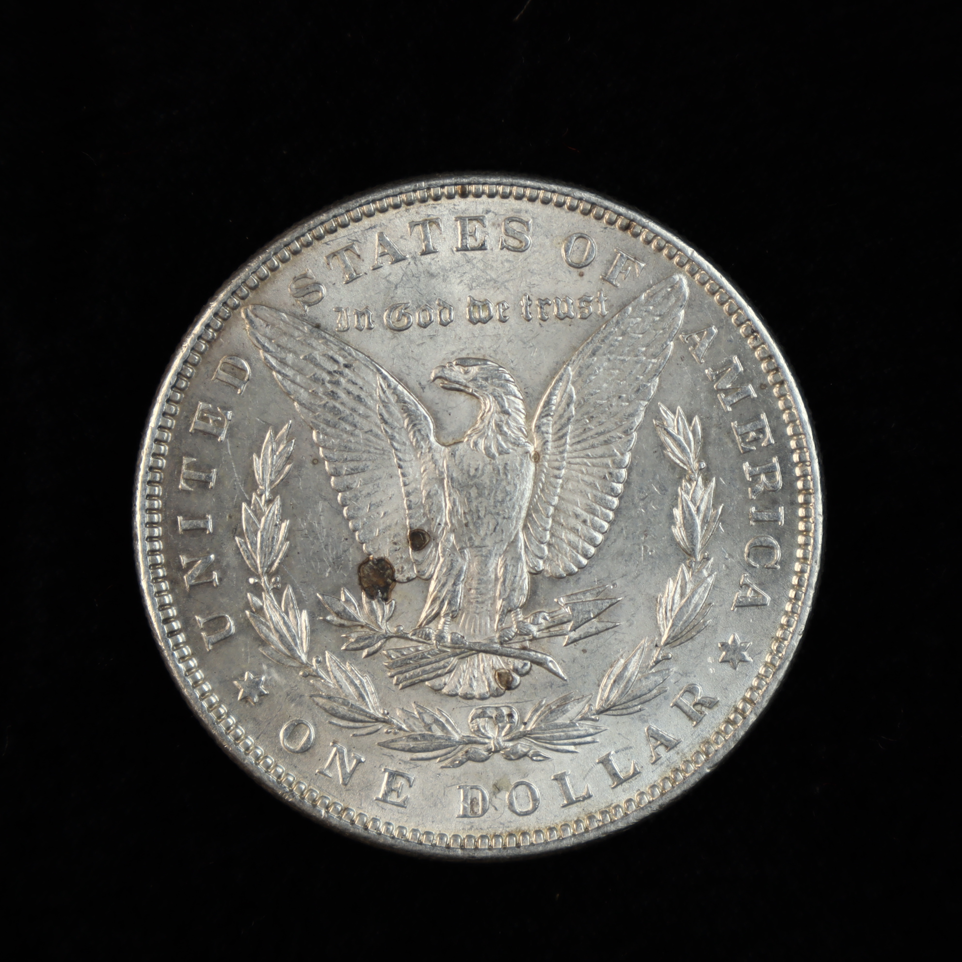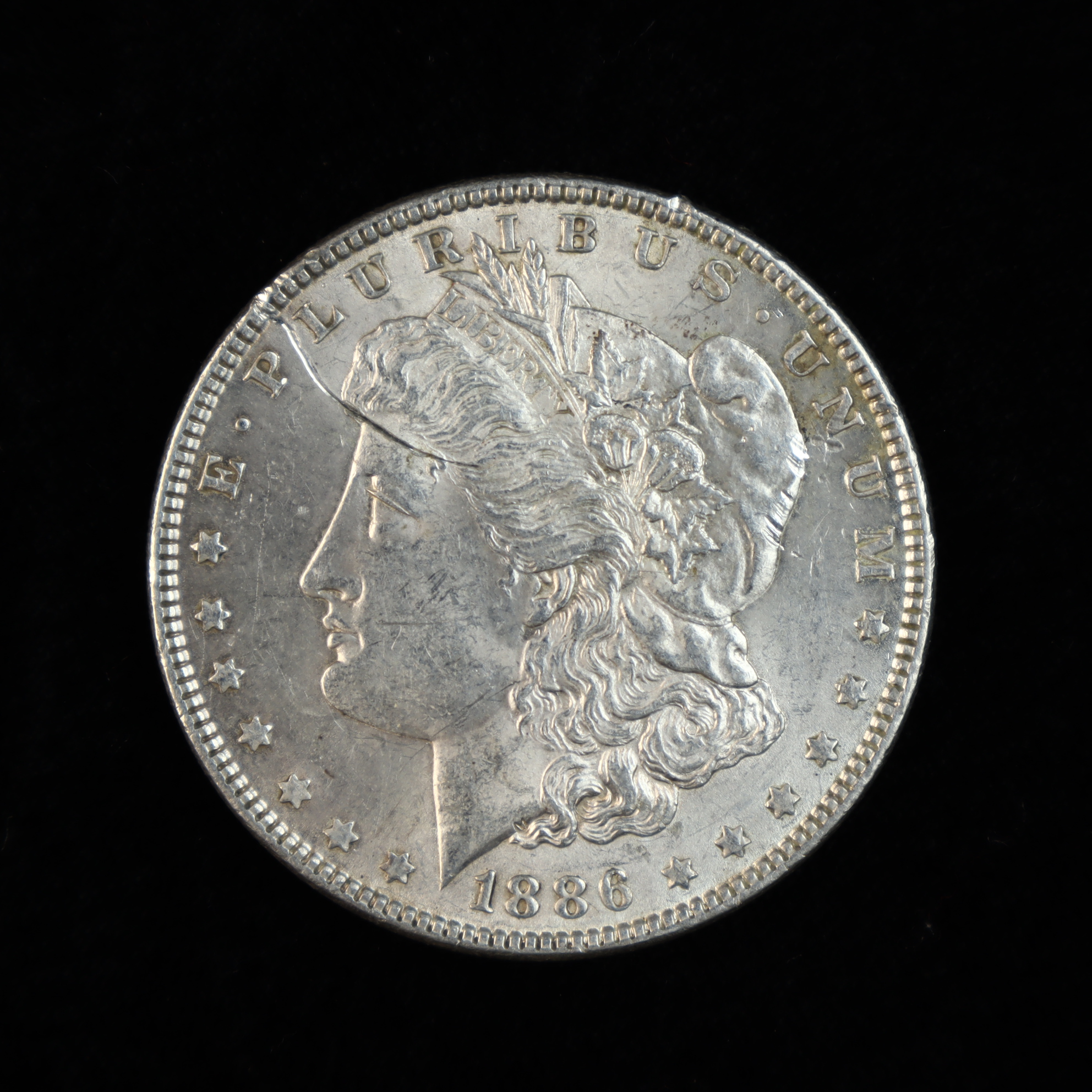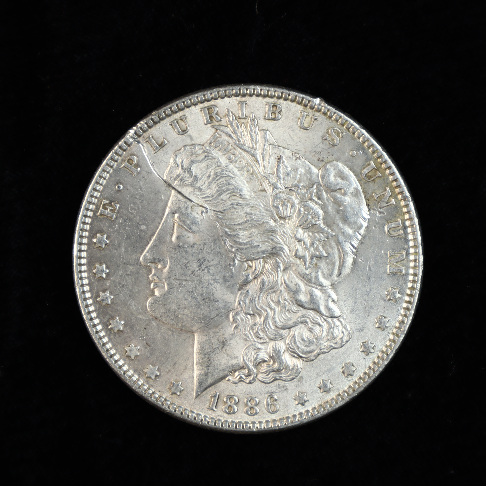 This US one-dollar denomination coin is a Morgan silver dollar struck in 1886 at the Philadelphia Mint. The coin is composed of 90% silver and 10% copper. The obverse features the Liberty head design with the date 1886 and thirteen stars. The reverse displays the heraldic eagle within a wreath, with no mint mark present in the space below the wreath and above the denomination. The edge is reeded.Diameter: 38.1 mmWeight: 26.73 grams.