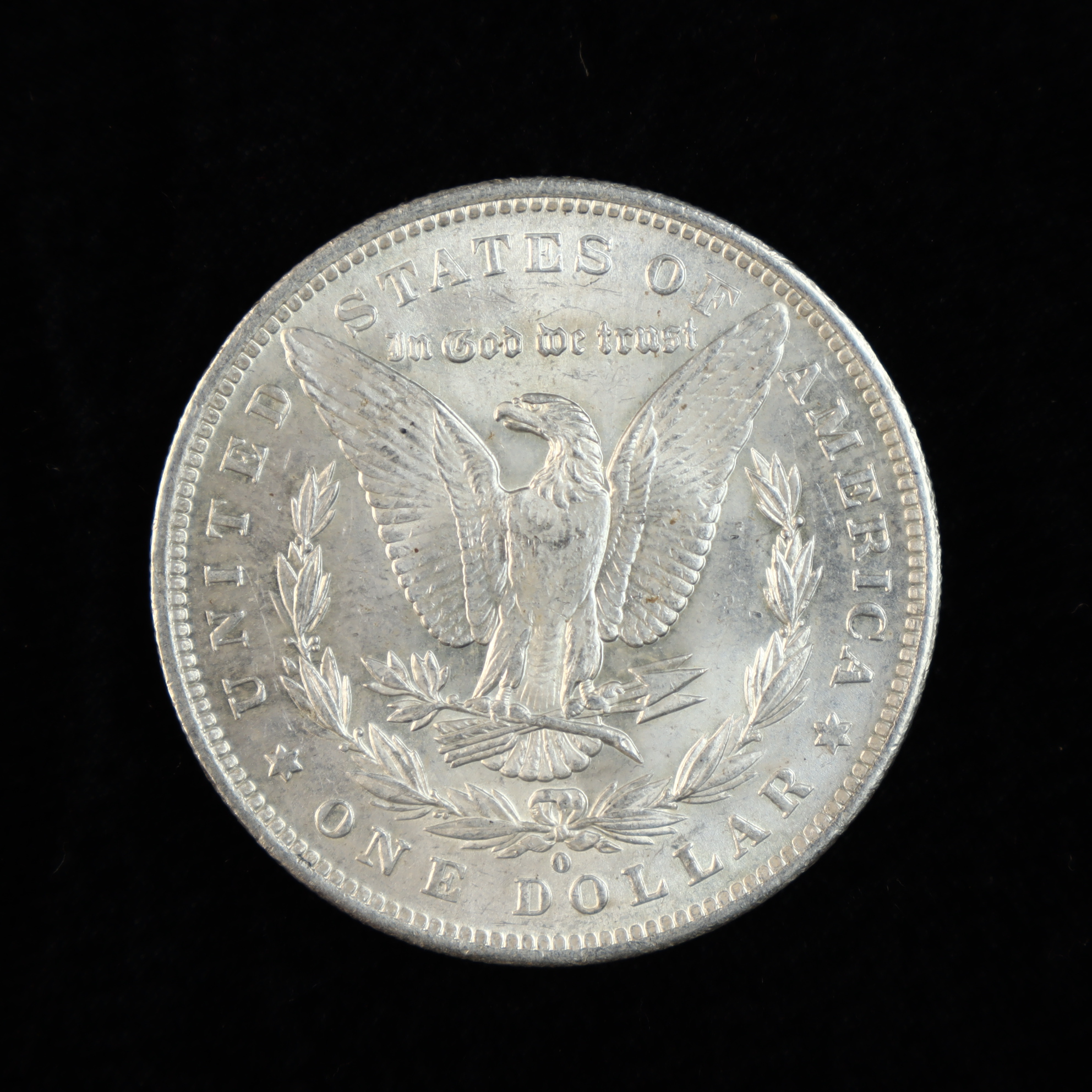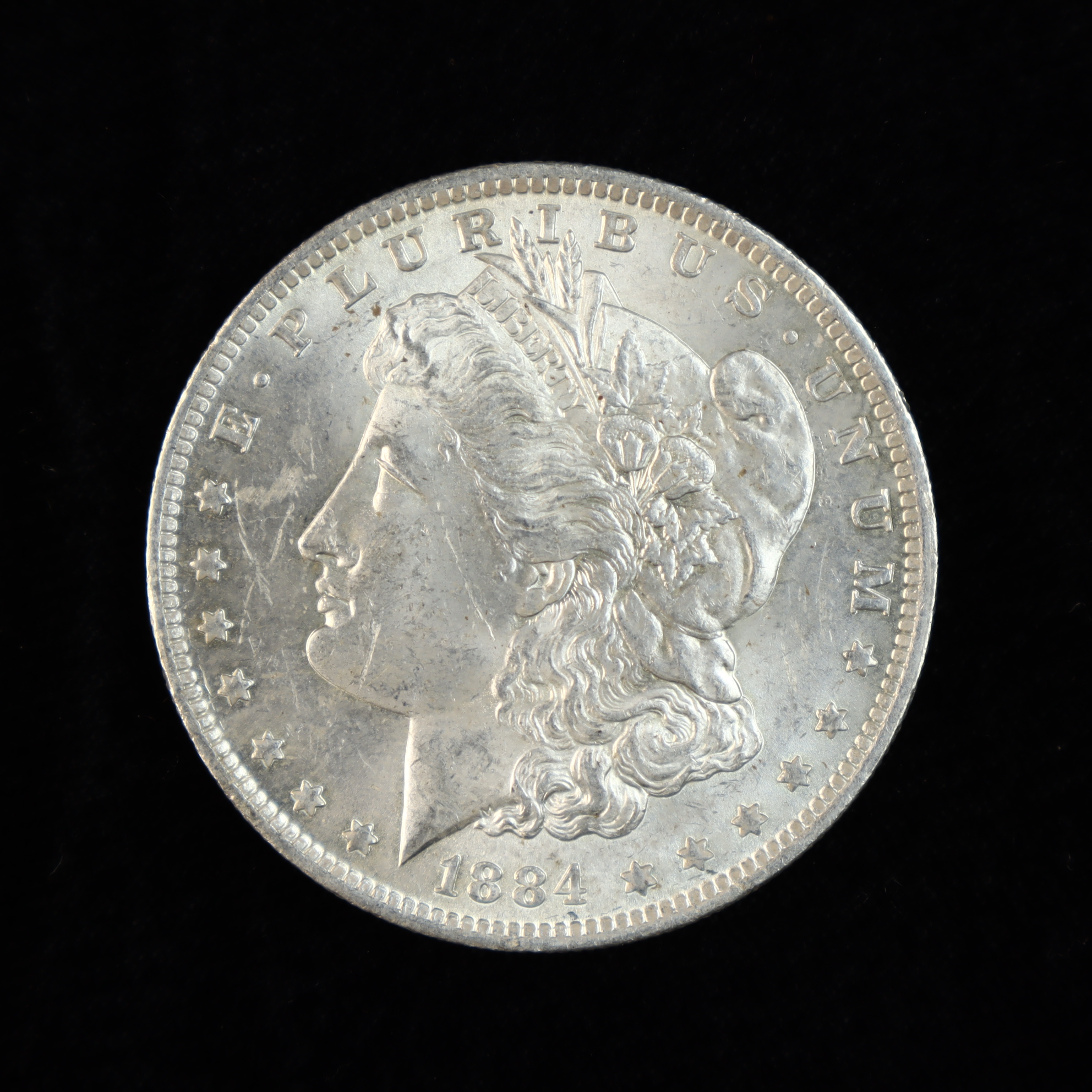 1884-O Morgan silver dollar, KM# 110. This US coin was struck at the New Orleans Mint. The piece features the Liberty Head obverse and a heraldic eagle reverse. Inscriptions include E PLURIBUS UNUM, UNITED STATES OF AMERICA, ONE DOLLAR, and the motto In God we trust in Gothic script. An O mint mark is located on the reverse above the denomination. The coin is struck in 90% silver (.900 fine) with a reeded edge.Diameter: 38.1 mmWeight: 26.73 grams.