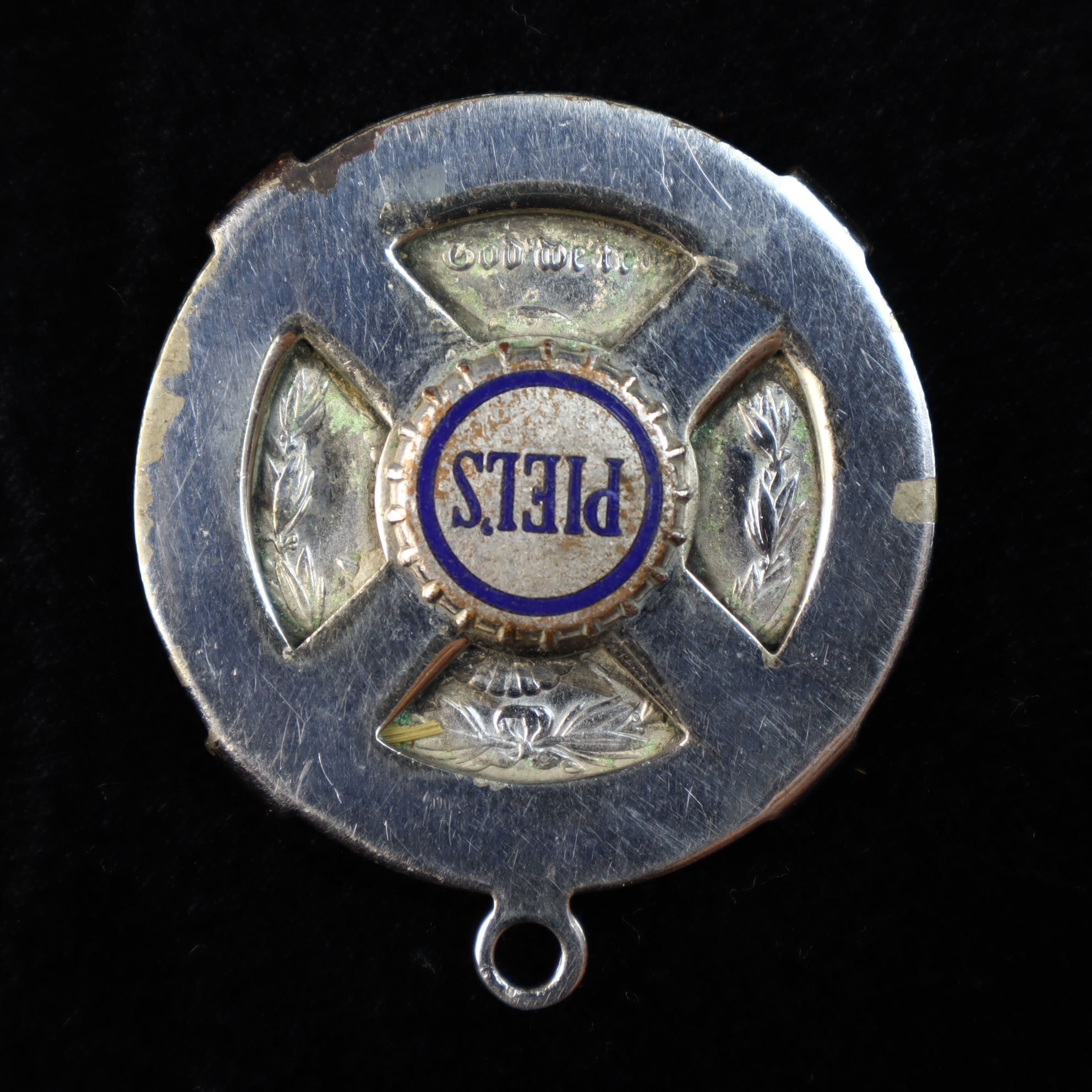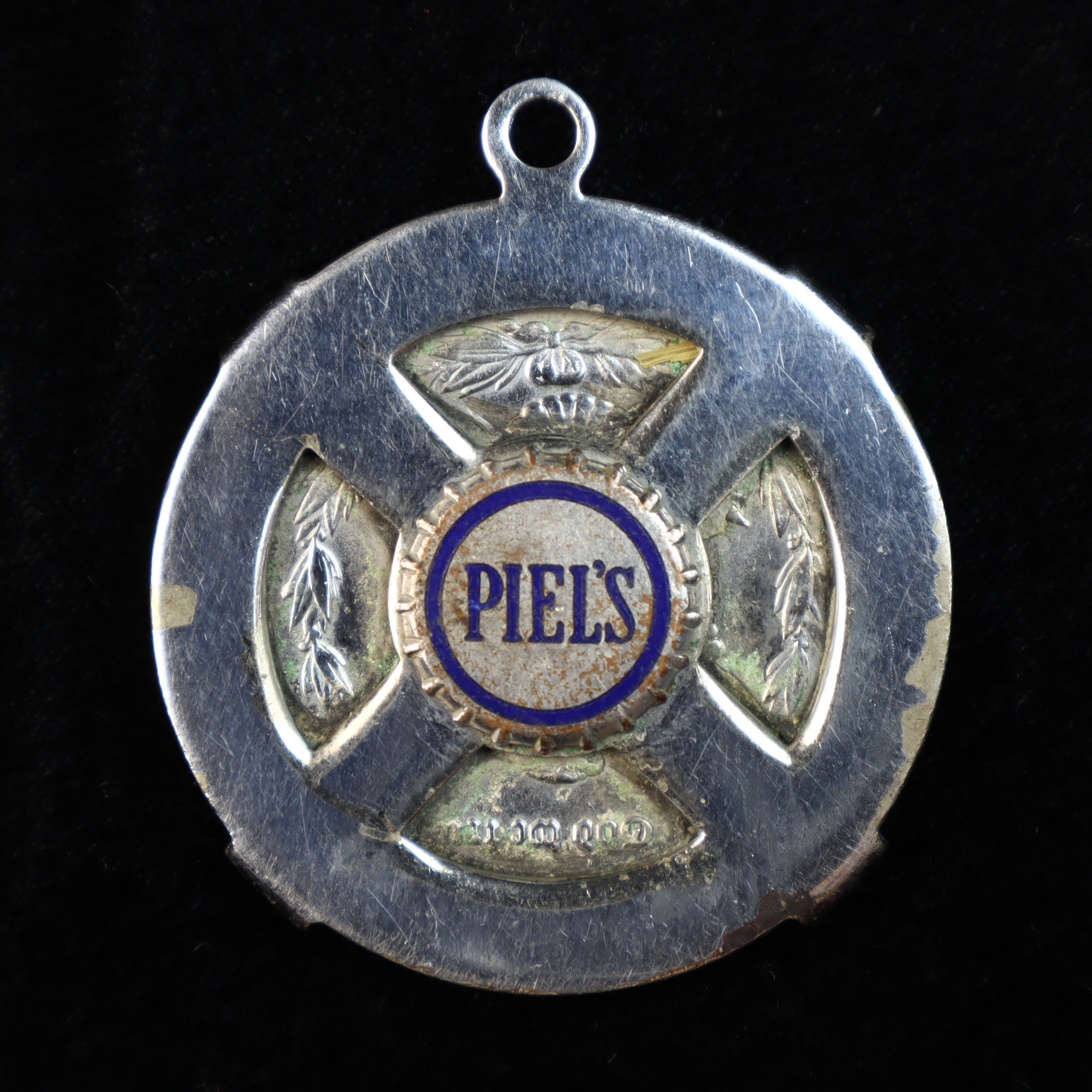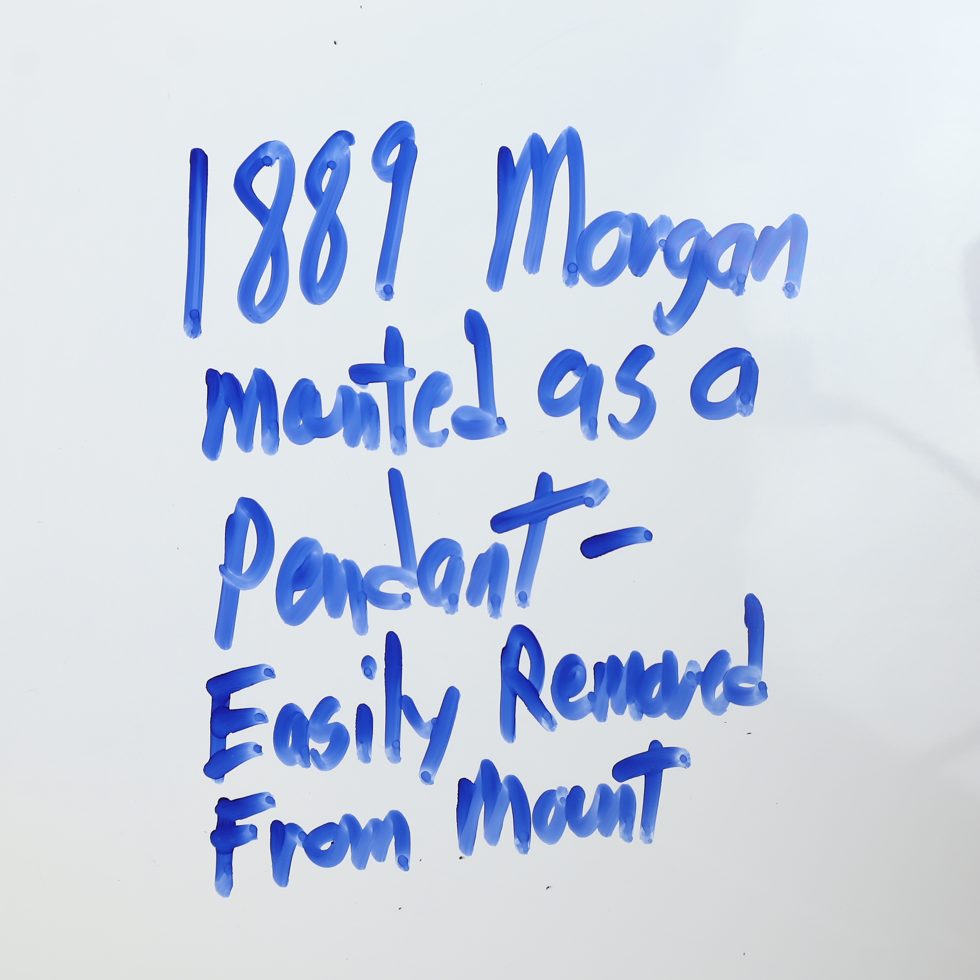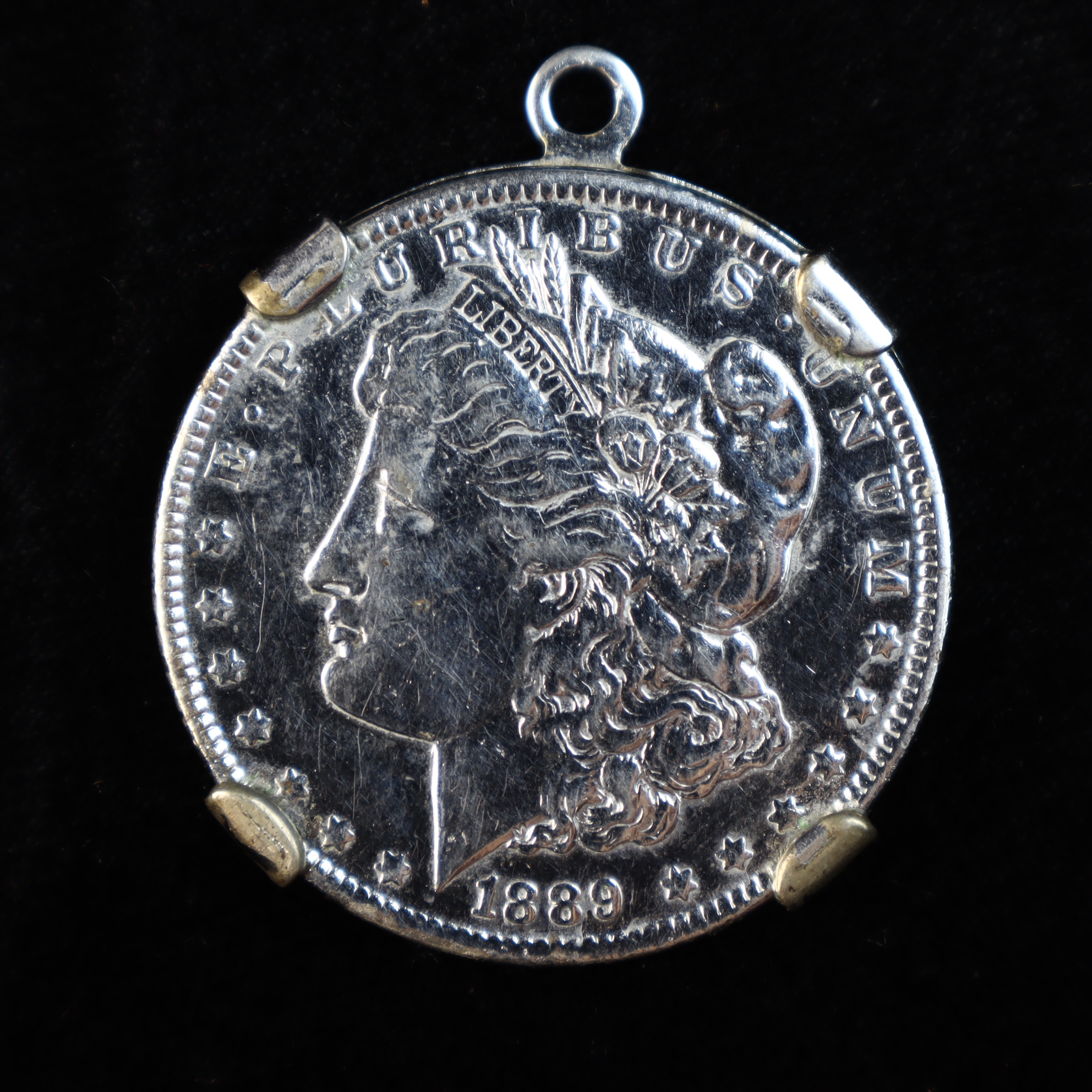 This US 1889 Morgan silver dollar is presented in a silver-toned metal jewelry pendant mount. The coin features the Liberty Head obverse and is dated 1889. The reverse is partially visible through four cutouts in the mount, revealing portions of the original design including the motto In God We Trust in Gothic script. Centered on the reverse is an enameled medallion featuring the name PIEL’S in blue lettering on a white ground, identifying the piece as a promotional item for Piel’s Beer. The coin is secured by a four-prong bezel and includes a suspension loop. The coin is removable from the mount. No mint mark is visible. The 1889 Philadelphia issue is a common date with a mintage of approximately 21,726,000.Metal Composition: 0.900 Silver.