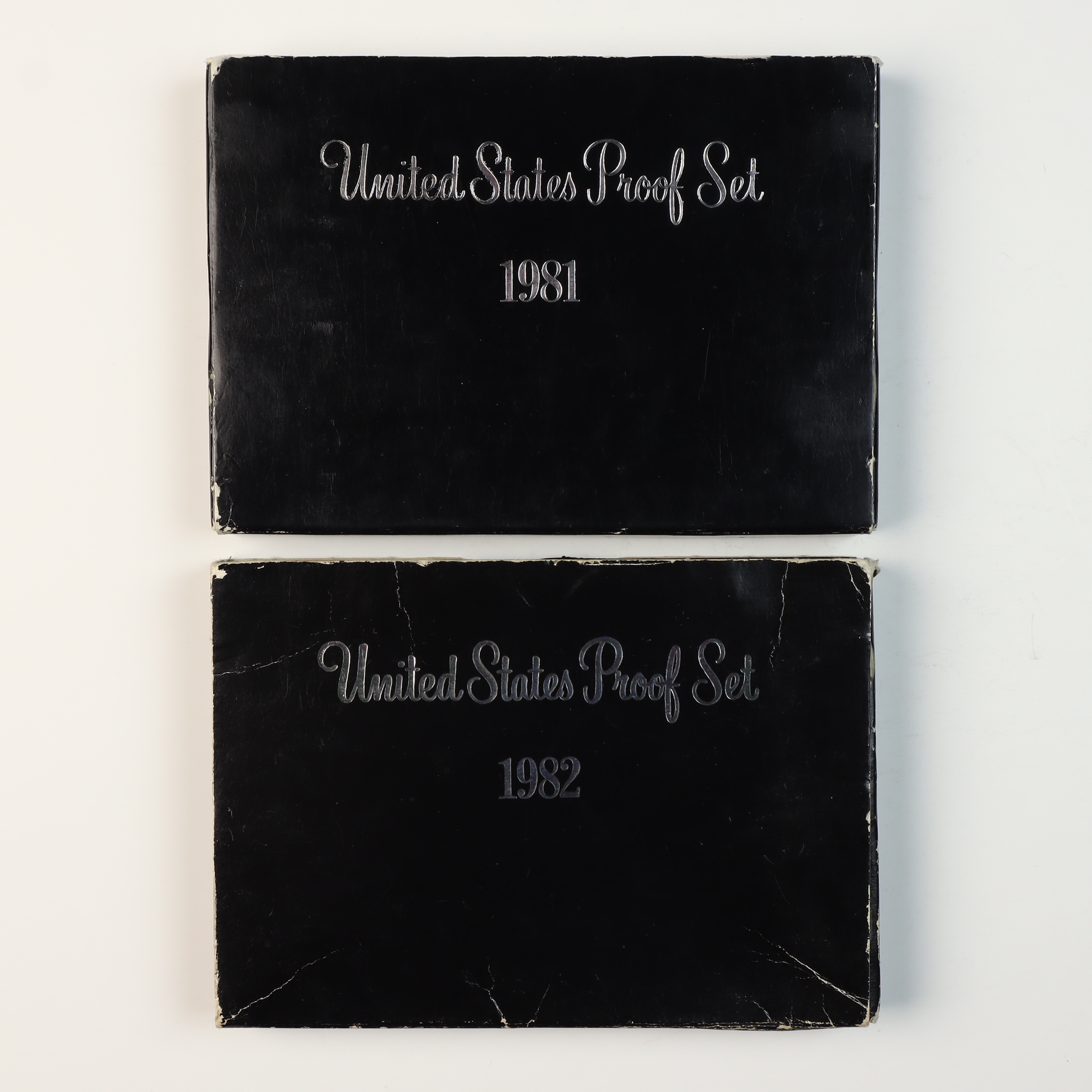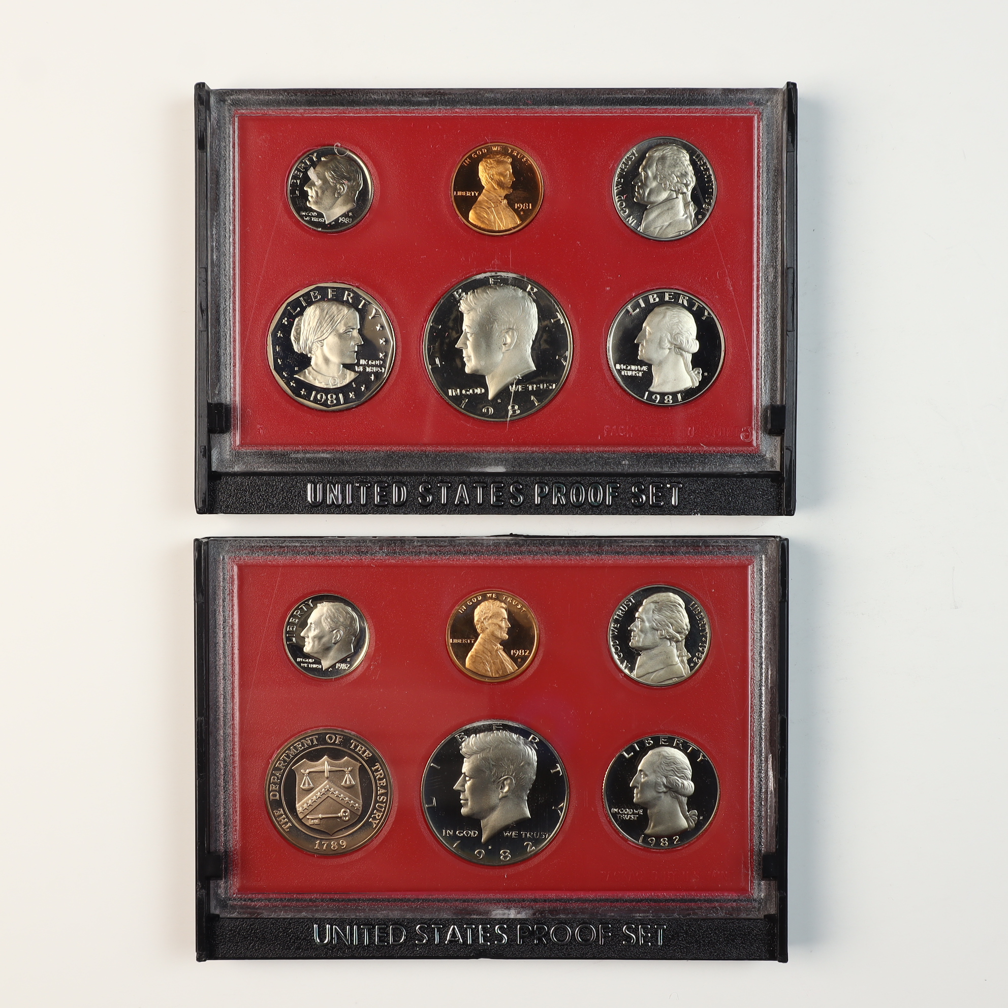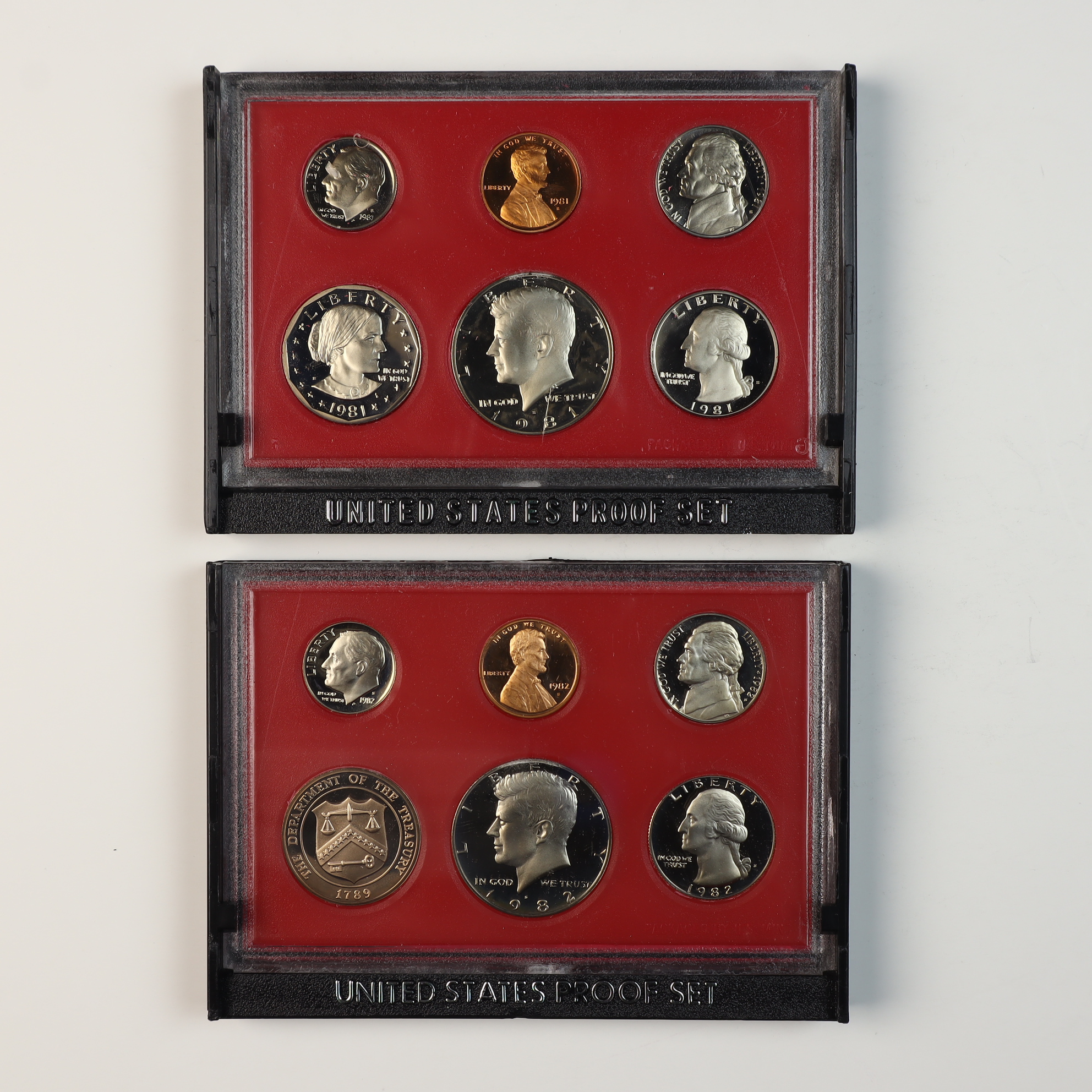 A pair of US Mint Proof Sets consisting of the 1981 and 1982 annual issues. The 1981 set contains six coins: a copper-nickel clad Susan B. Anthony dollar, Kennedy half dollar, Washington quarter, Roosevelt dime, Jefferson nickel, and a copper-plated zinc Lincoln cent. The 1982 set contains five coins: Kennedy half dollar, Washington quarter, Roosevelt dime, Jefferson nickel, and Lincoln cent, plus a bronze commemorative medal featuring the Seal of the Department of the Treasury. All coins bear the S mint mark, indicating production at the San Francisco Mint. The sets are housed in original government packaging consisting of red-backed hard plastic display cases with black bases and black outer presentation boxes with silver-colored script.