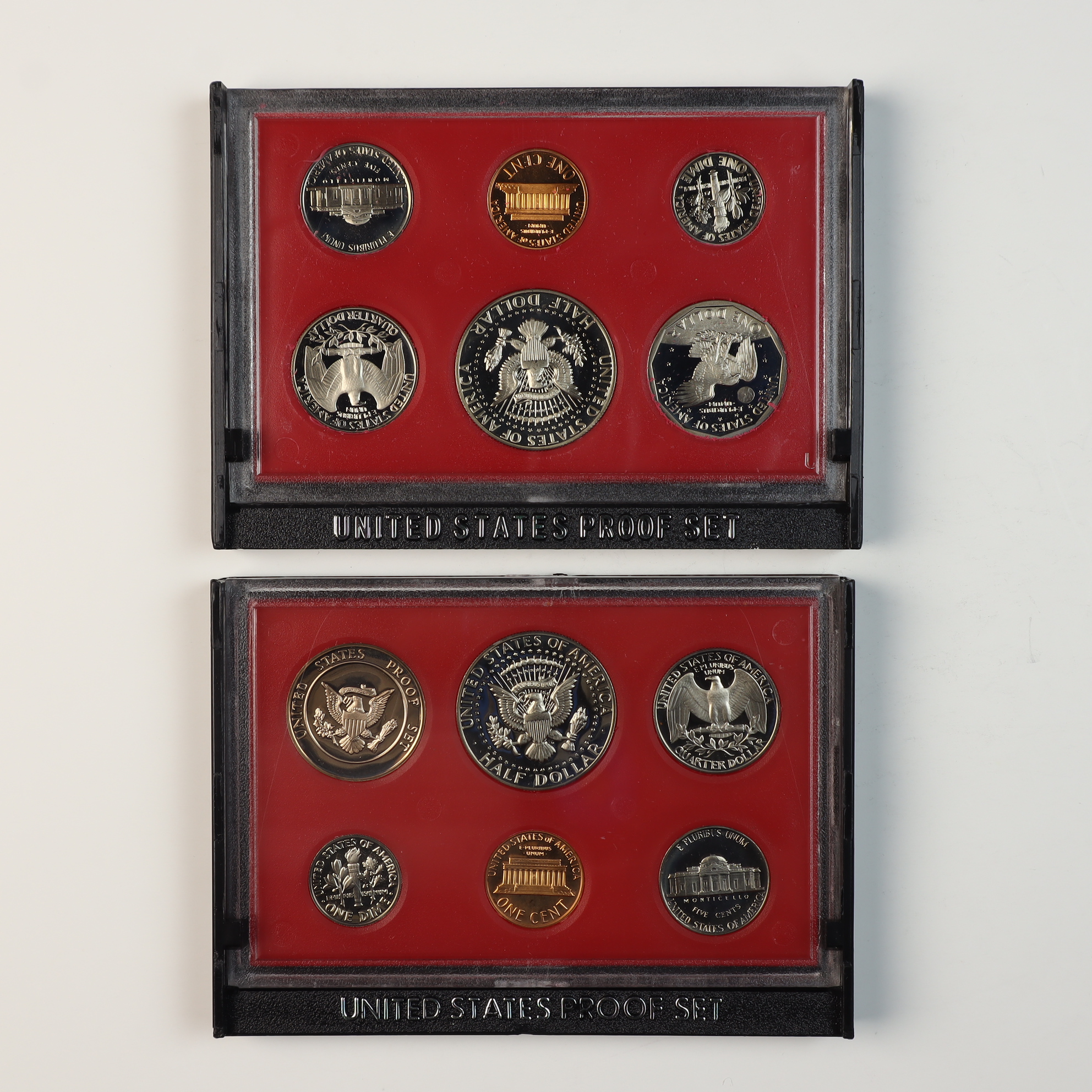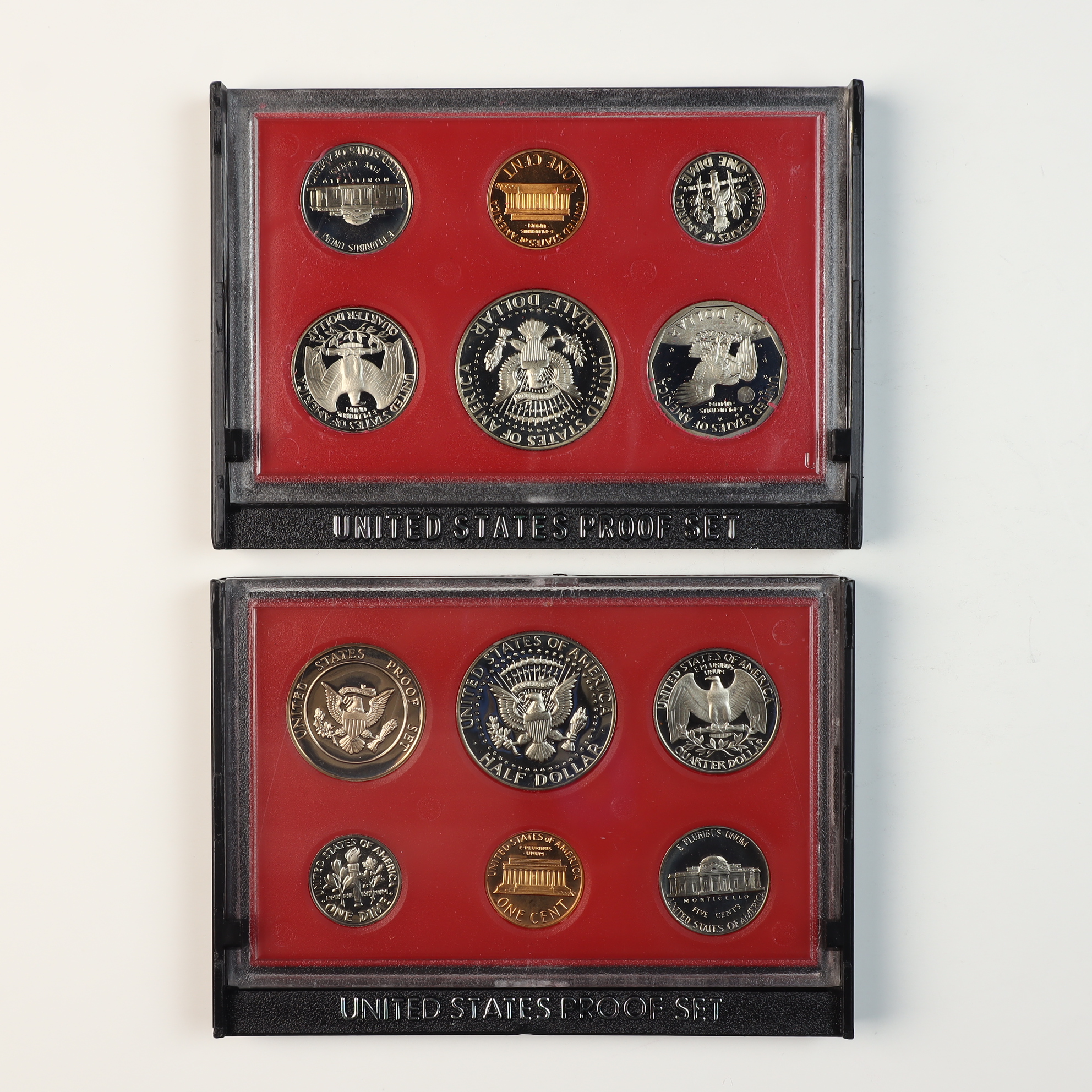 All coins are in proof condition, exhibiting frosted cameo devices and mirrored fields with no visible wear, toning, or contact marks. The plastic display cases remain intact. The original black outer boxes show minor edge wear and surface scuffing consistent with age.