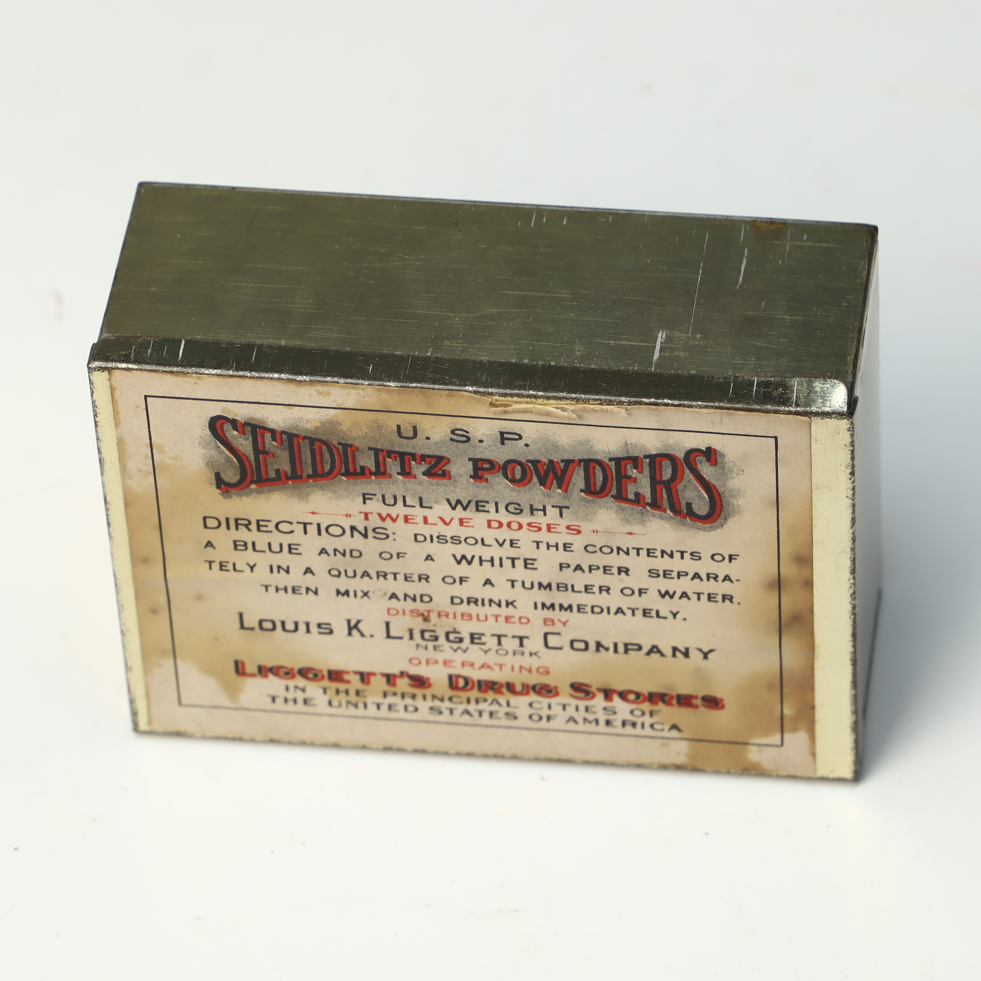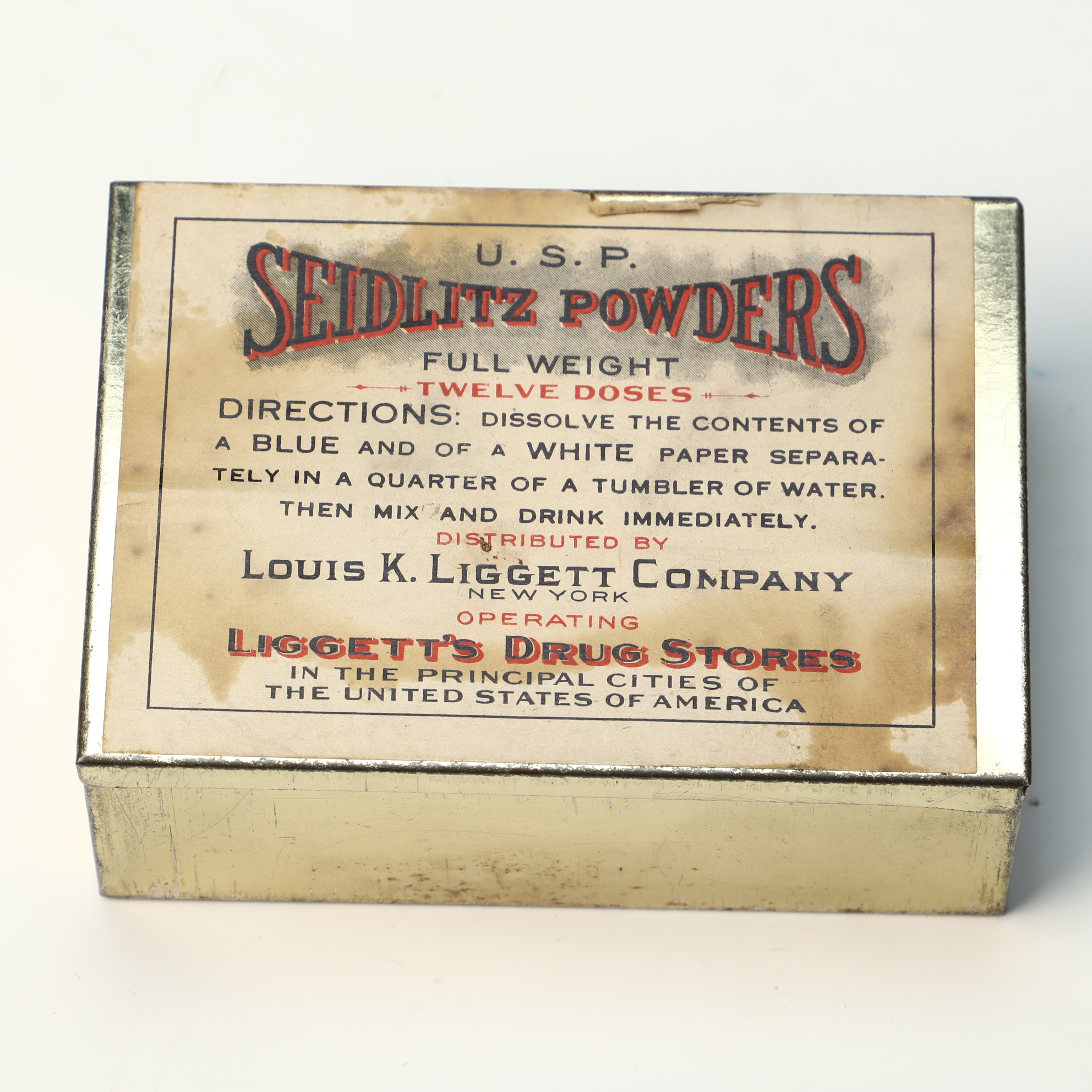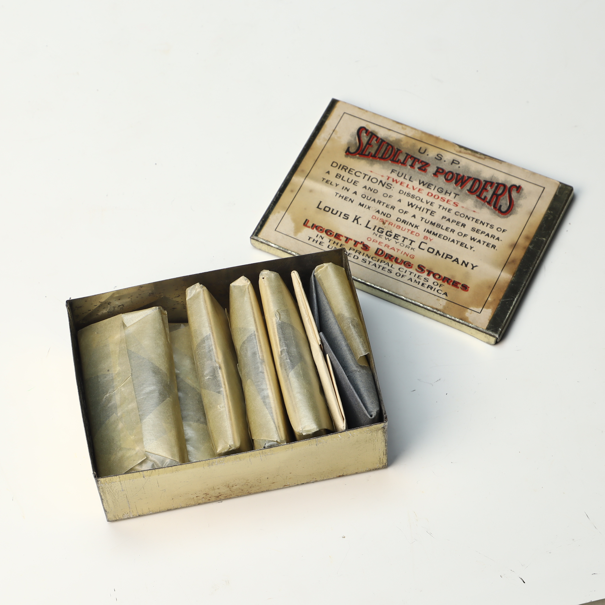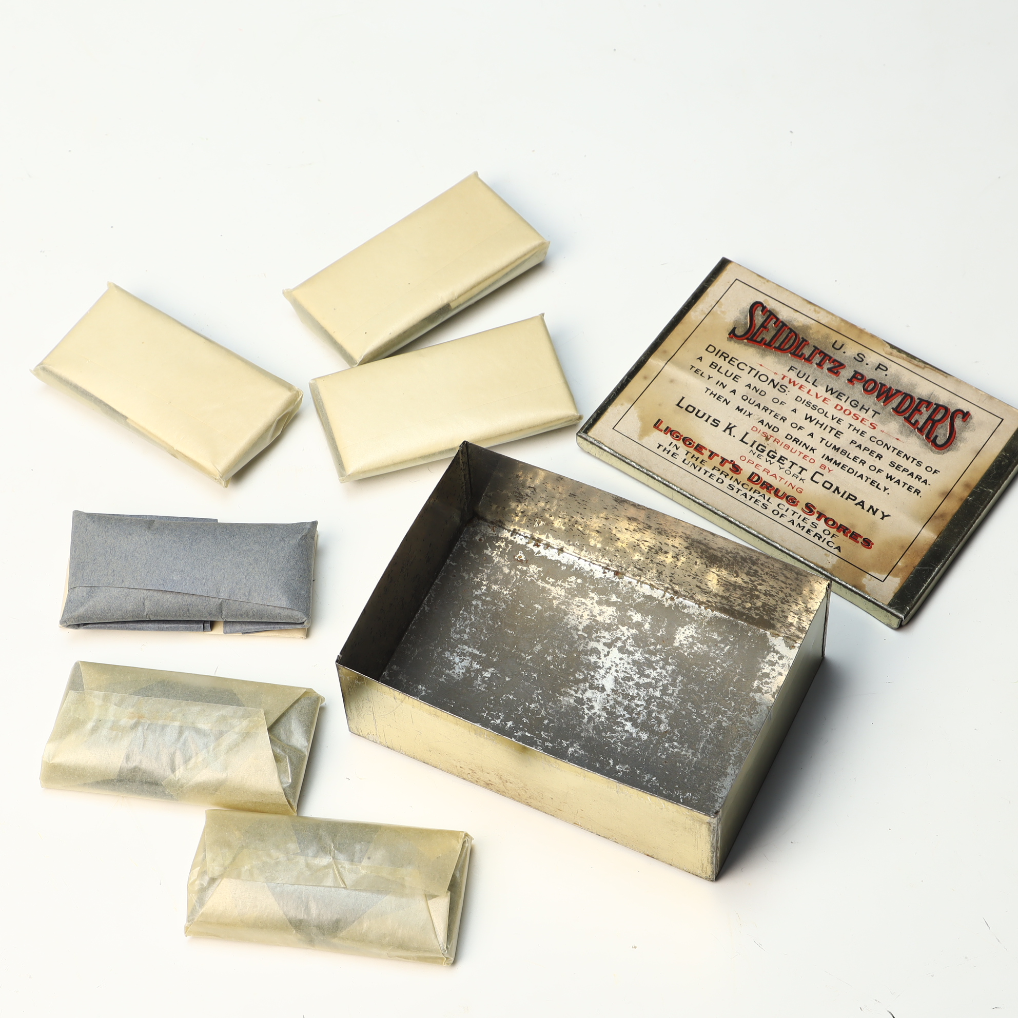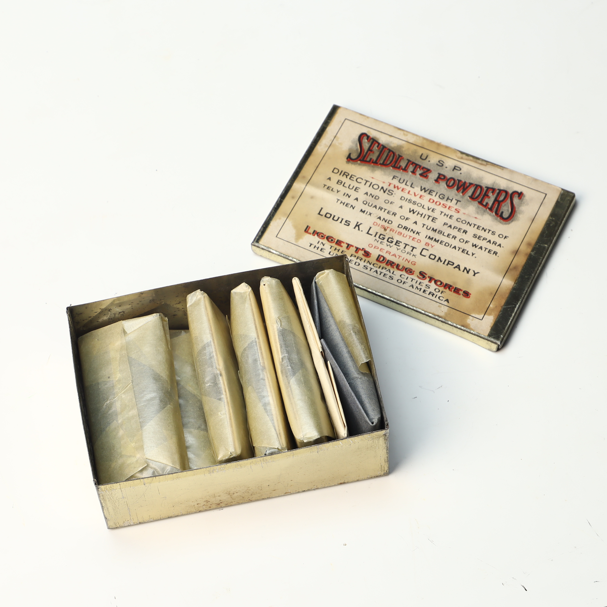 This rectangular metal apothecary tin was used for Seidlitz Powders, a traditional effervescent laxative and antacid. The lid features a cream-colored paper lithograph label with decorative typography in black and red ink. The label indicates the product met United States Pharmacopeia standards and was distributed by the Louis K. Liggett Company of New York, the operator of Liggetts Drug Stores. The interior contains several original paper-wrapped dose packets, including both cream-colored and blue papers. The printed directions on the lid specify dissolving the contents of a blue and a white paper separately in water before mixing and drinking the solution immediately.
